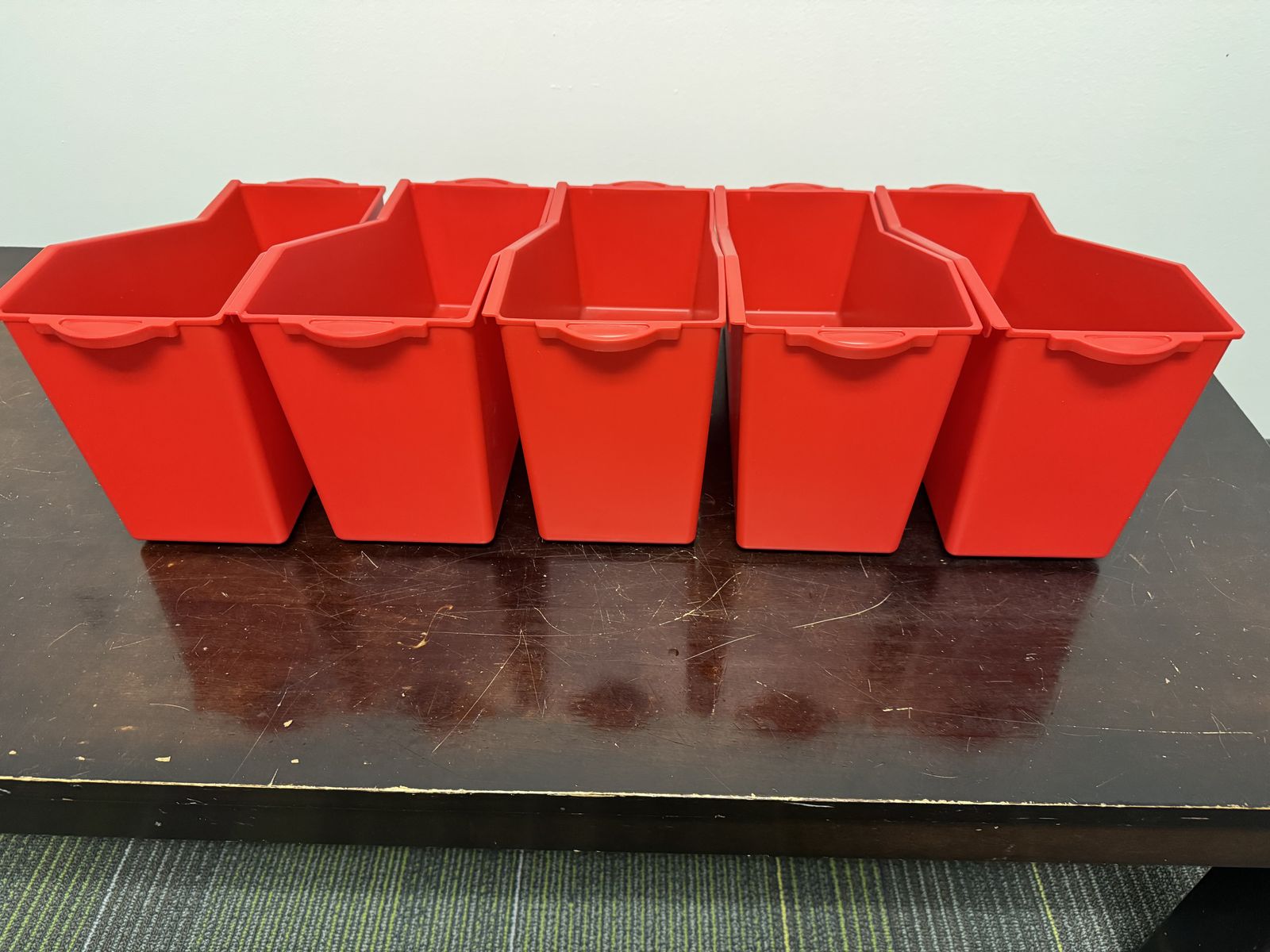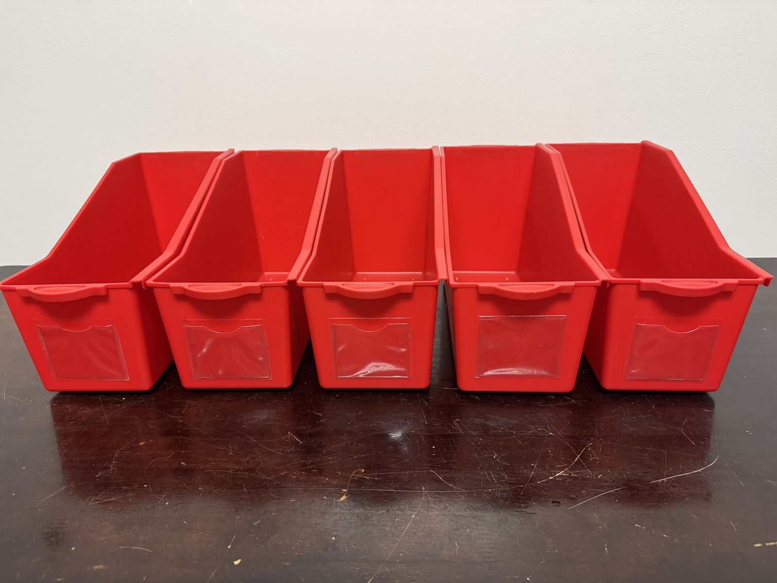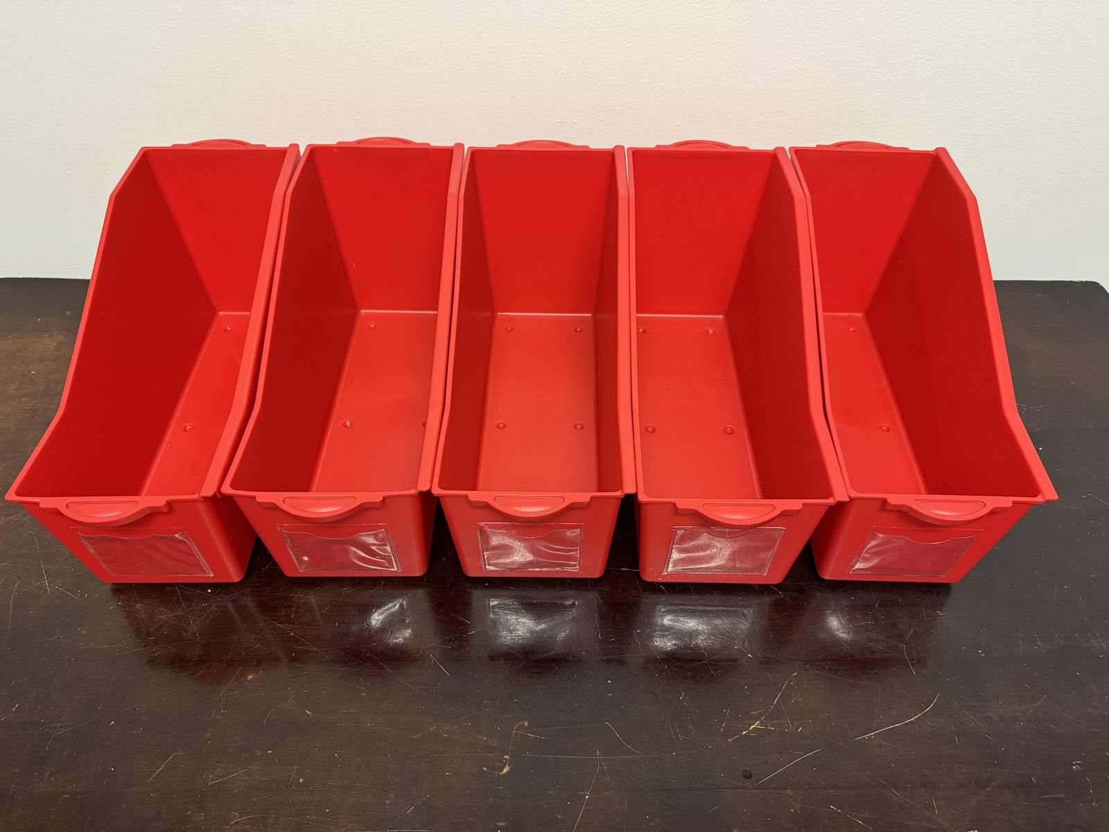 VenmoFive red linking bins to organize classroom or home books. Sturdy plastic bins can connect on the sides or sit next to each other. Each bin has a pocket in front for a label. Each bin measures 14"l x 5 1/4"w x 7 1/4"h. $15 for all five bins.