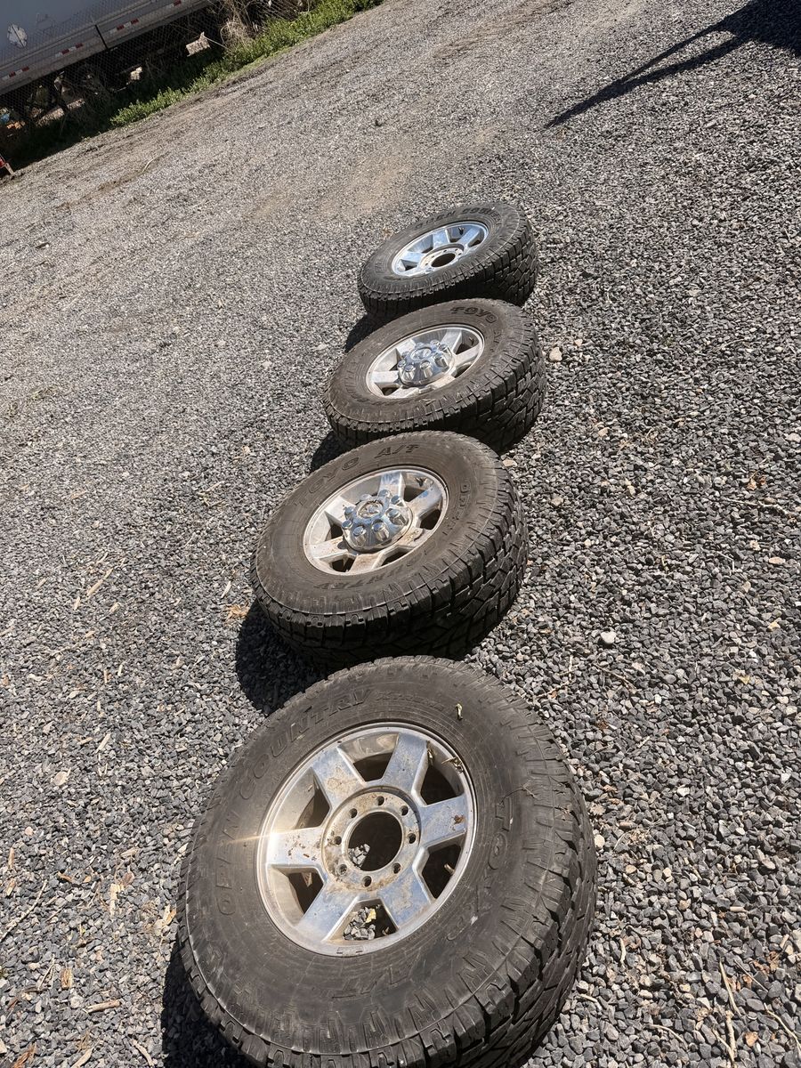 CashAppThis is a set of eight lug Dodge wheels and tires they’ve been sitting for about six months but they have 85% tread left. Only have two of the hubcaps.