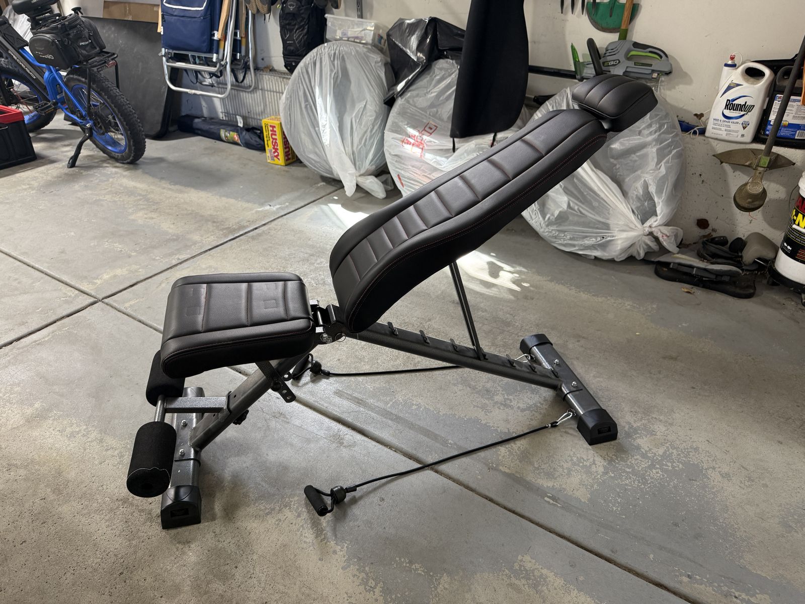 Adjustable weight bench great for home use. Even includes resistance bands attached to the frame.