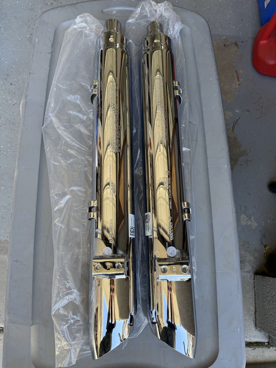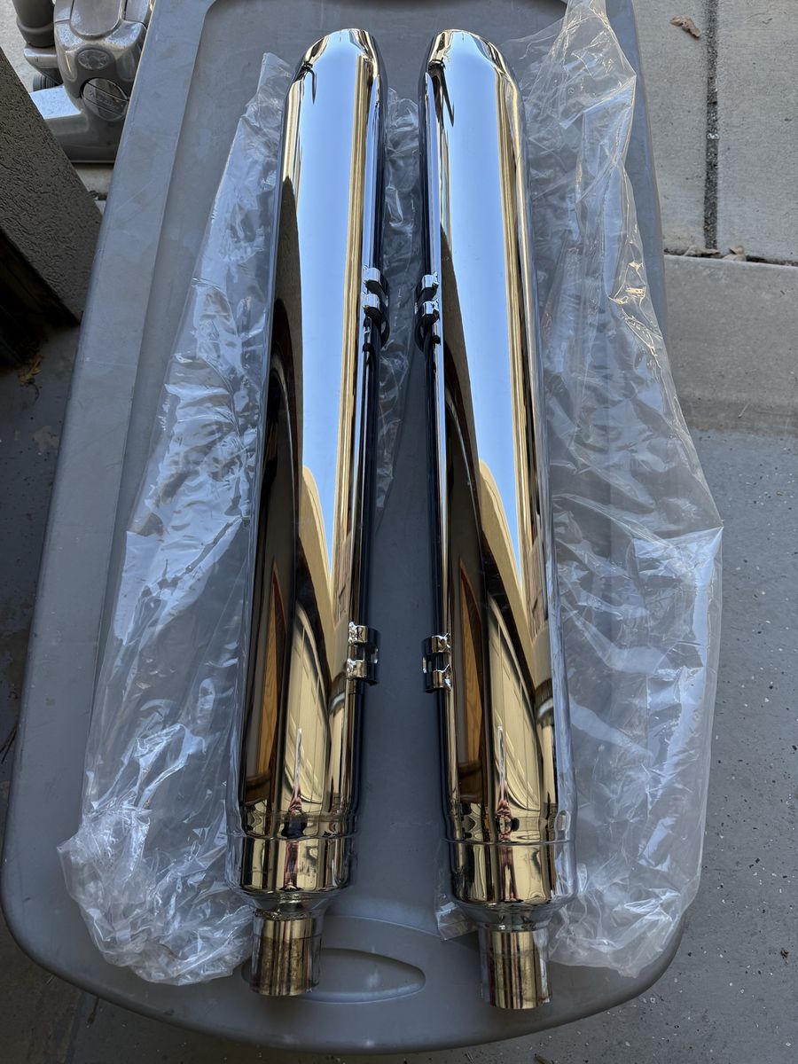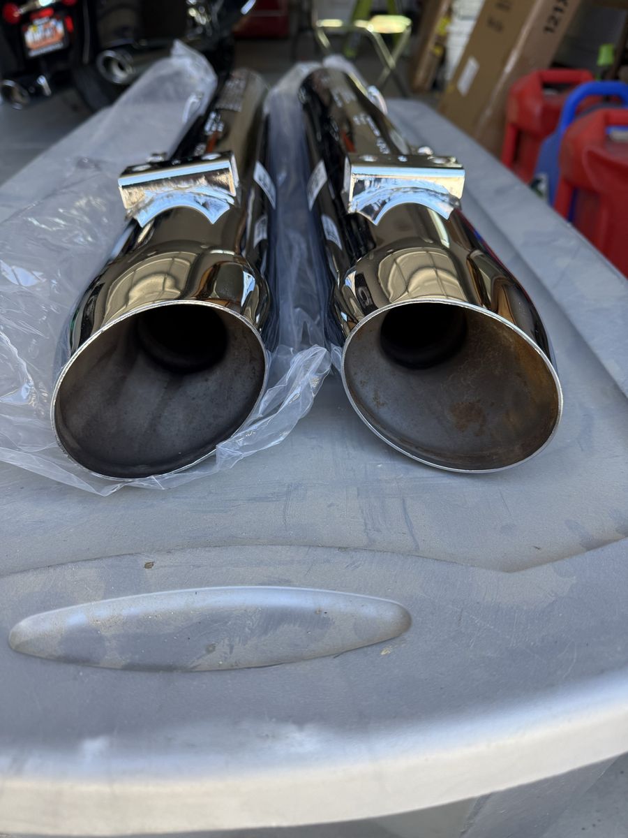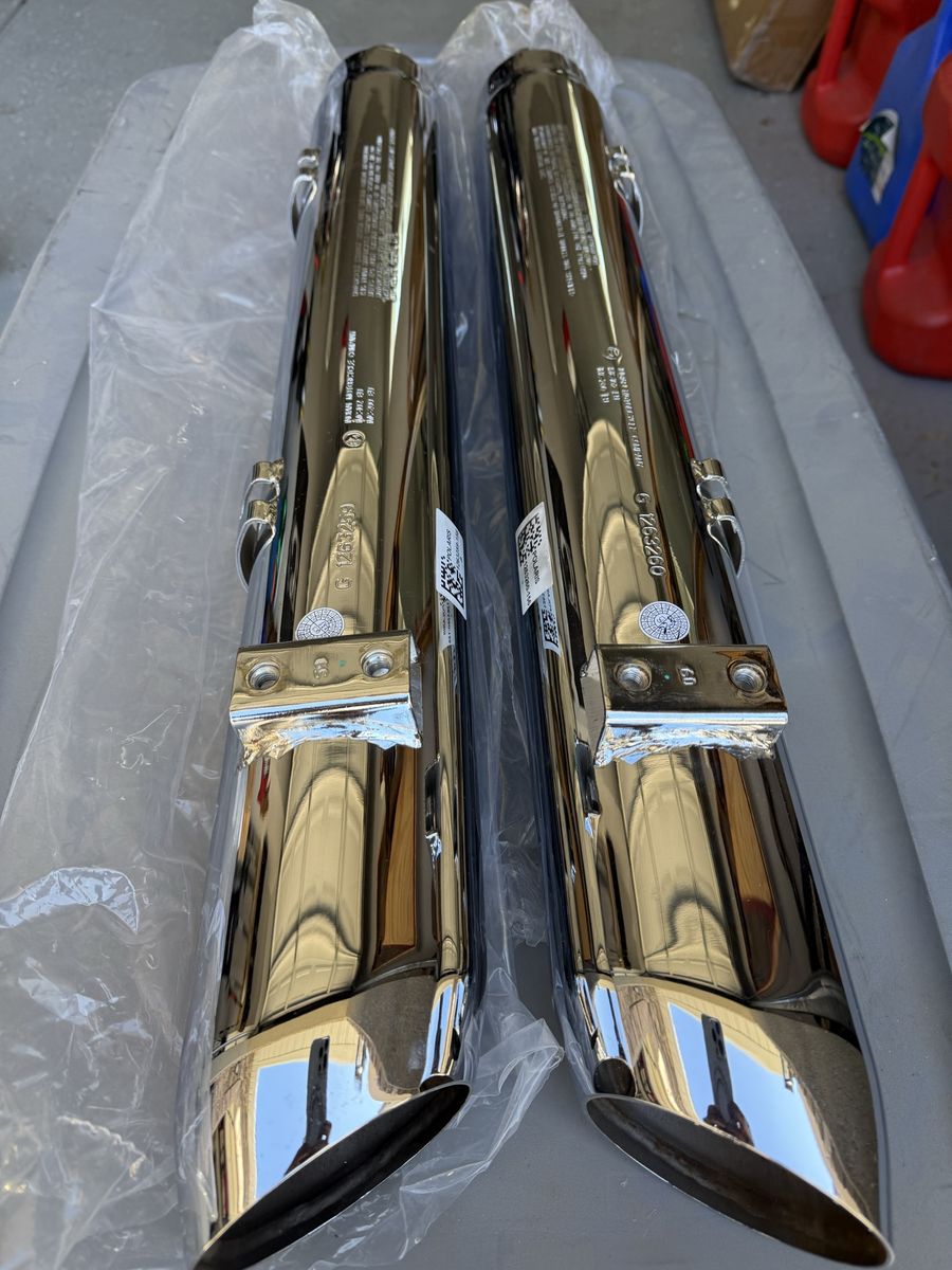 VenmoNew exhaust slip on pipes. Came from an Indian Roadmaster Limited 2023. I changed them out immediately after purchasing the bike so there’s less that 100 miles on these. No scratches or dents.