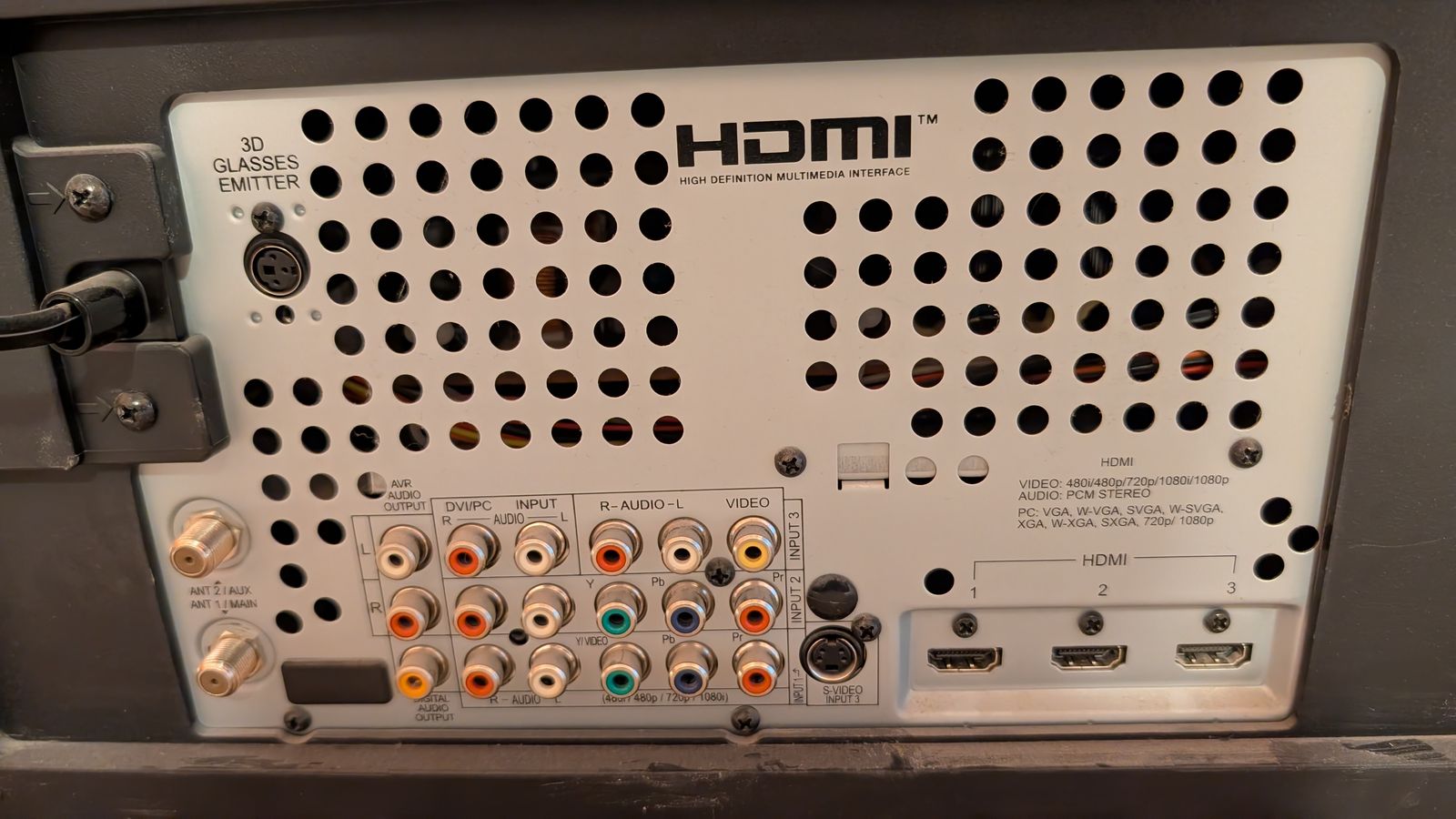 Has 3 HDMI inputs in rear, 3 RCA inputs and a hidden front RCA input panel as well.