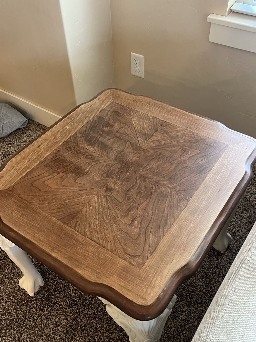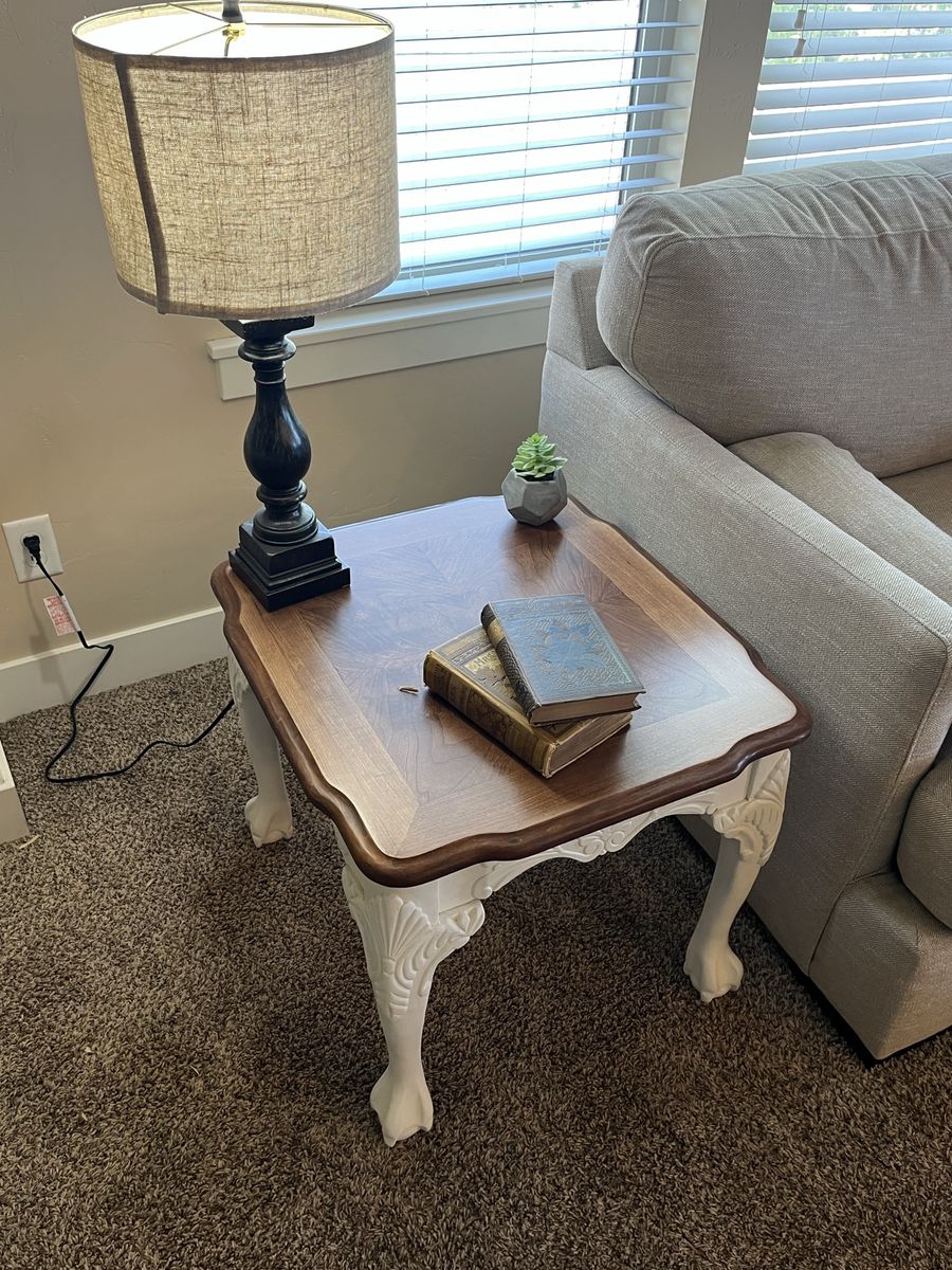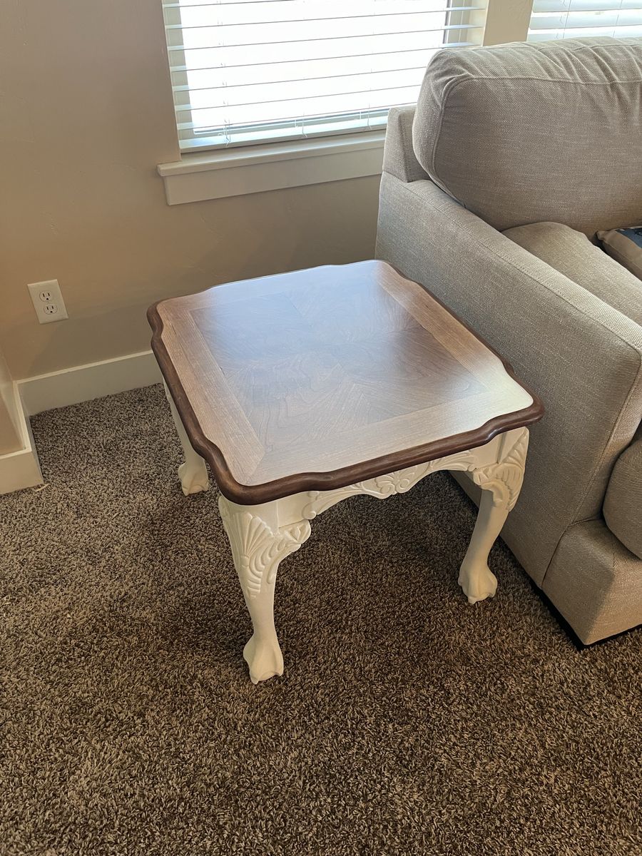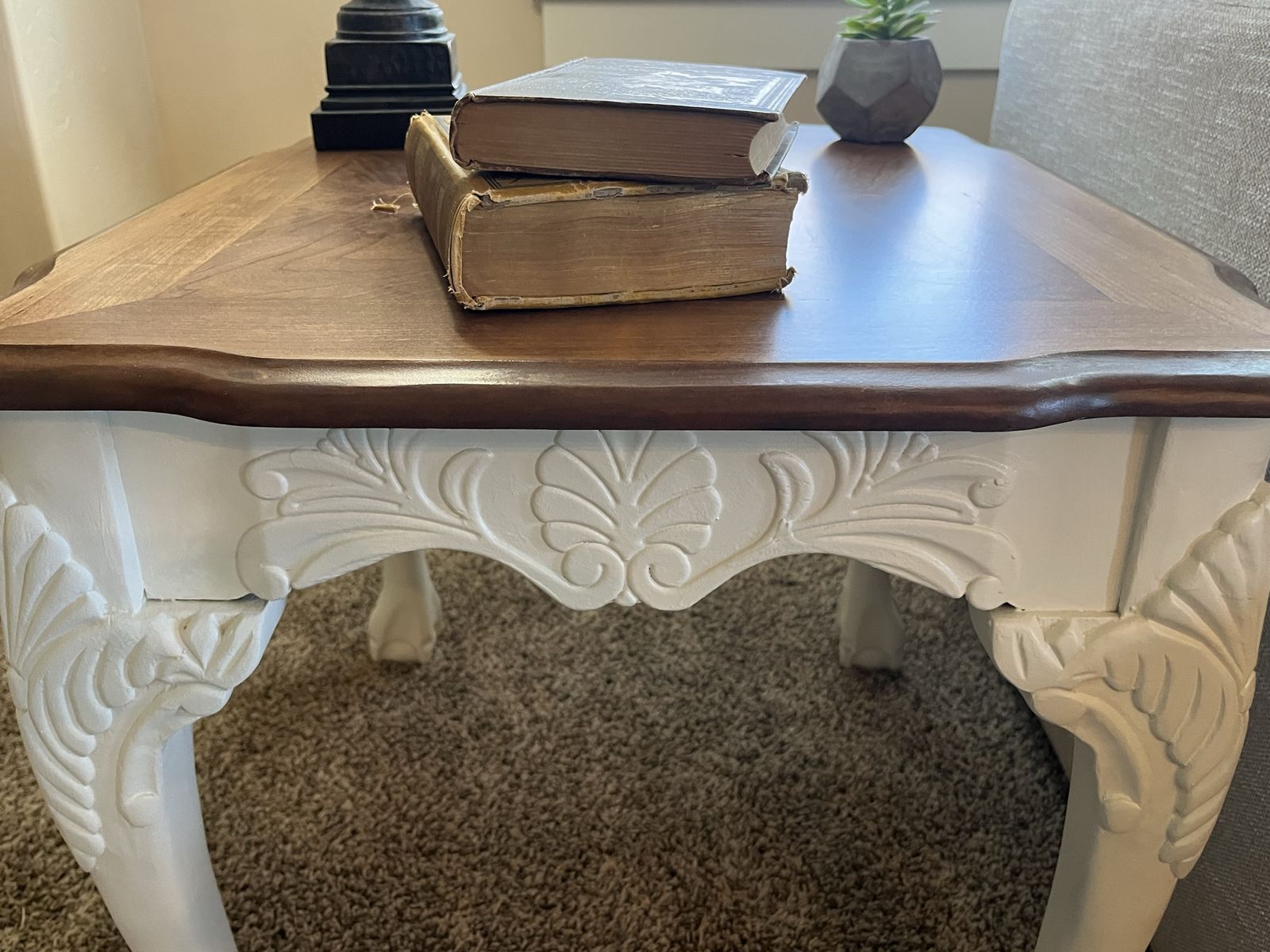 VenmoBeautiful vintage end table with a warm wood top and a soft cream carved base, styled with the timeless, elevated look associated with McGee-inspired and Pottery Barn interiors.