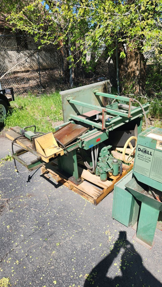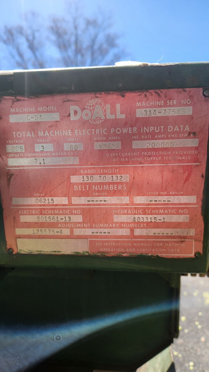 DoALL band saw. This was functioning when it came out of service. Its fully automatic and has a bar feeder and a roller table for material. It operates on 208 3 phase. one of the blade pully wheels is a little chewed up but it doesn't effect the function of the saw.
