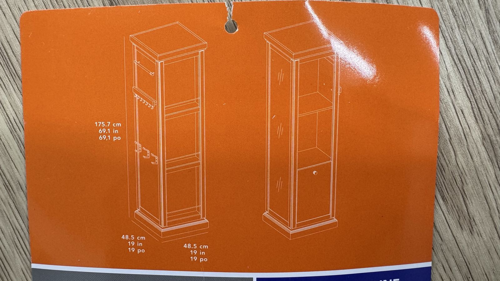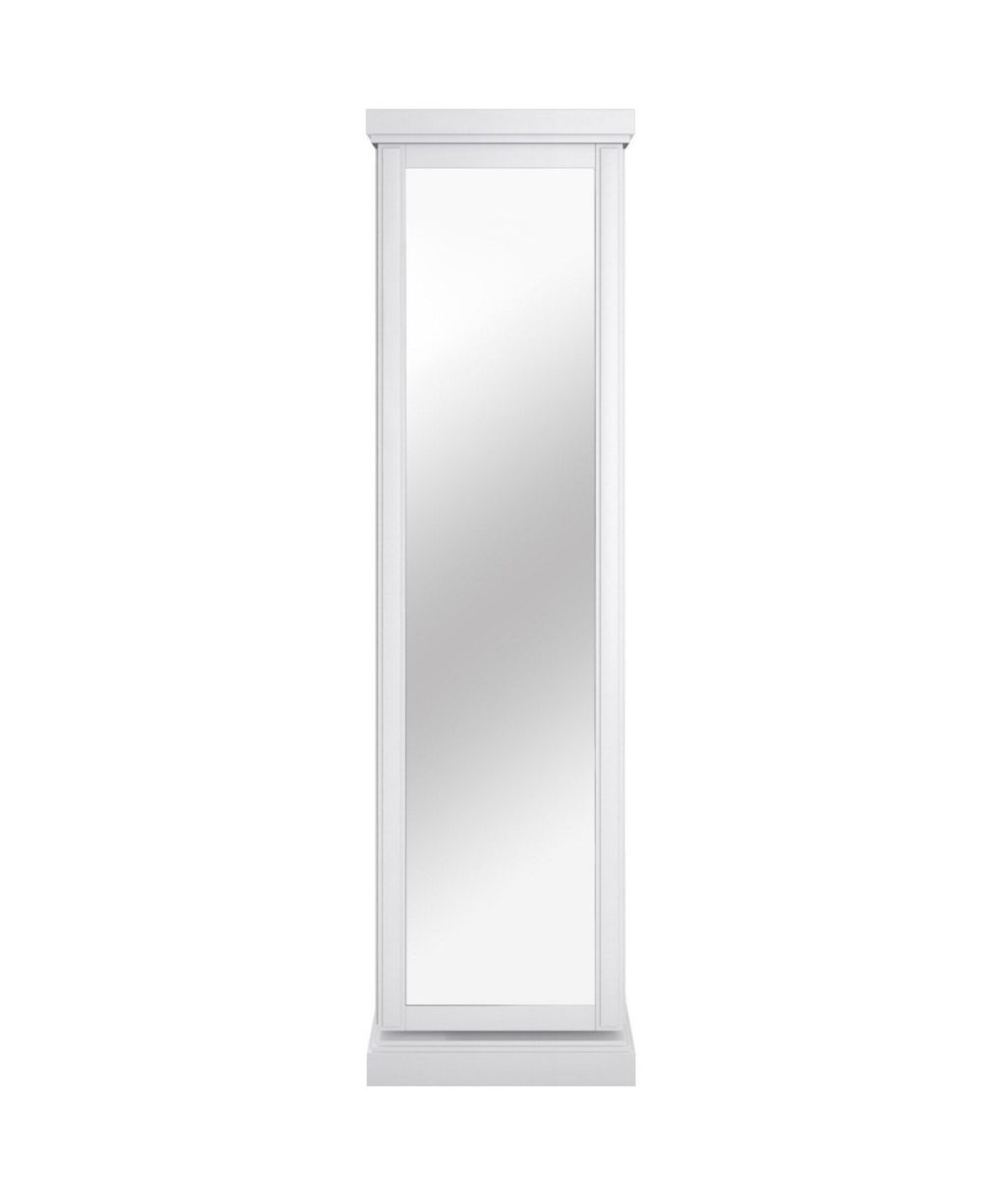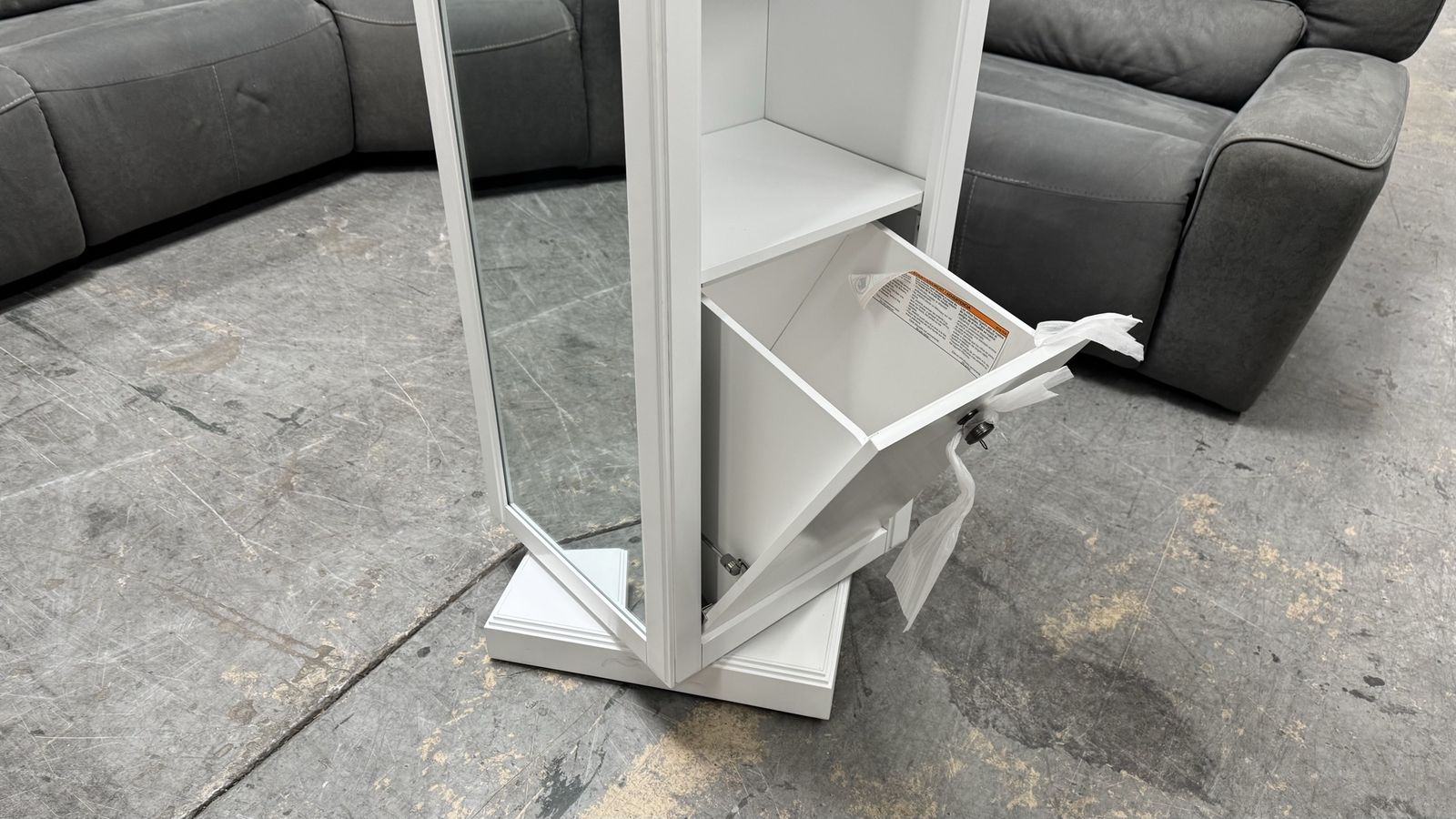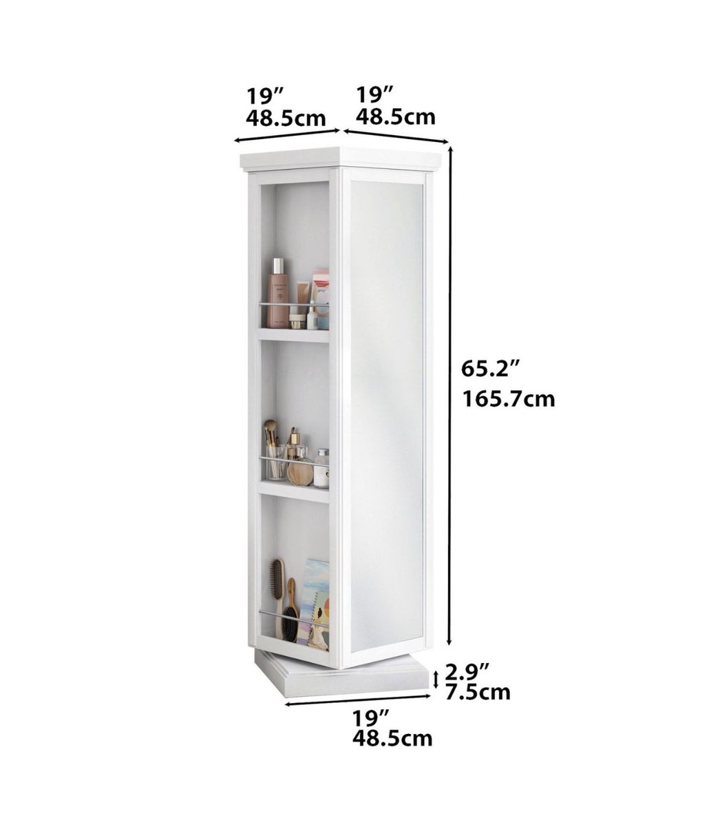 Swivel Base Rotates 180 Degrees • Space-Saving Design Includes 3 Shelves and Full-Length Mirror • Multi-Purpose Hooks Hold Bags and Accessories • Tilt-Out Bottom Compartment