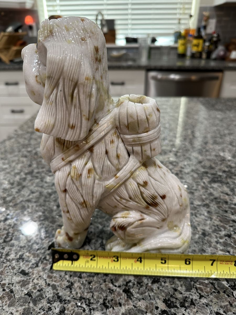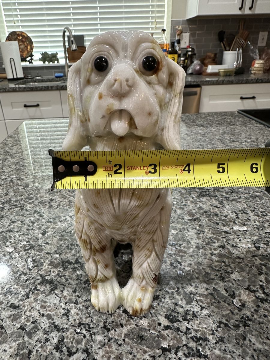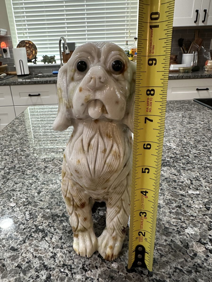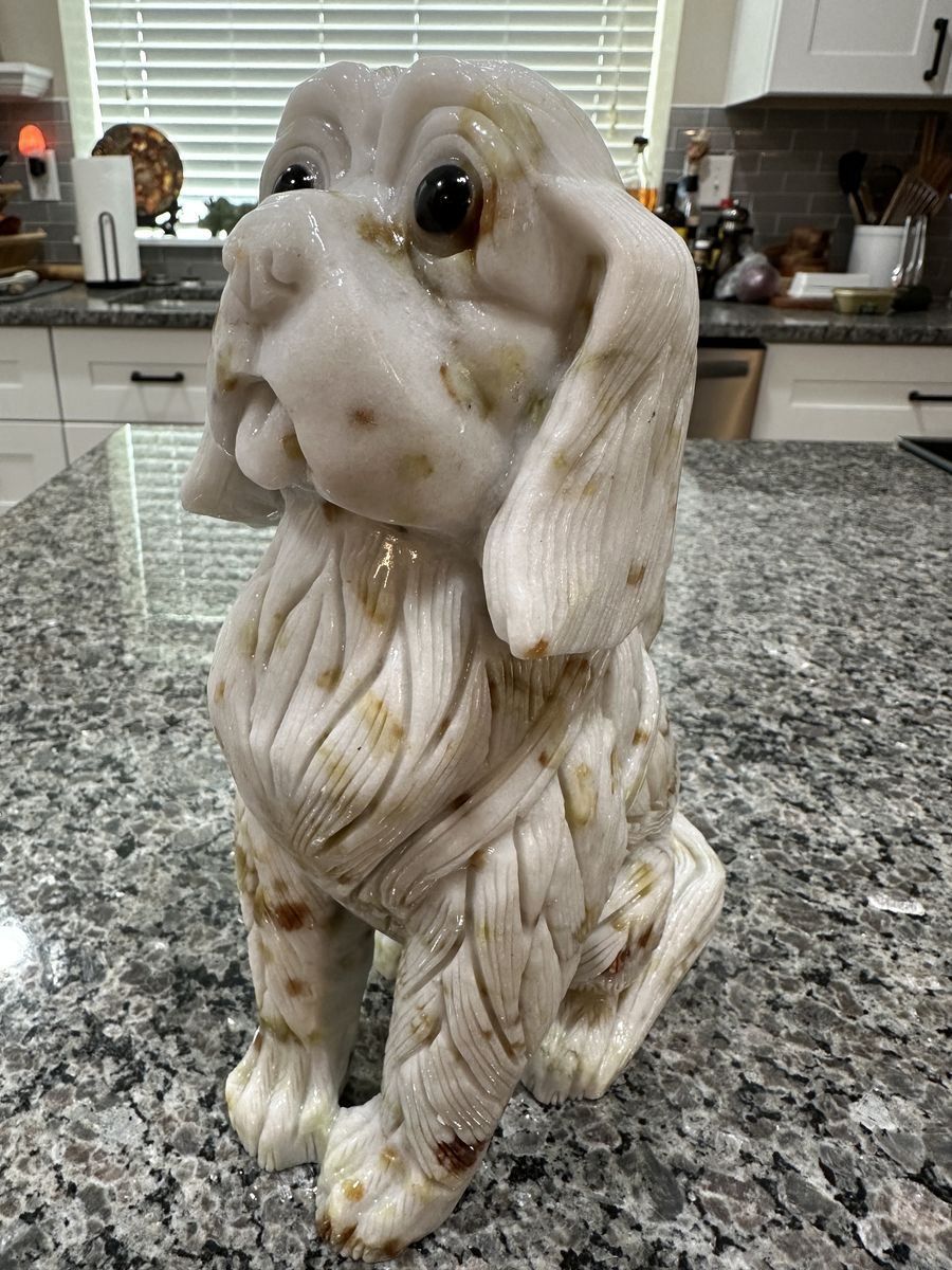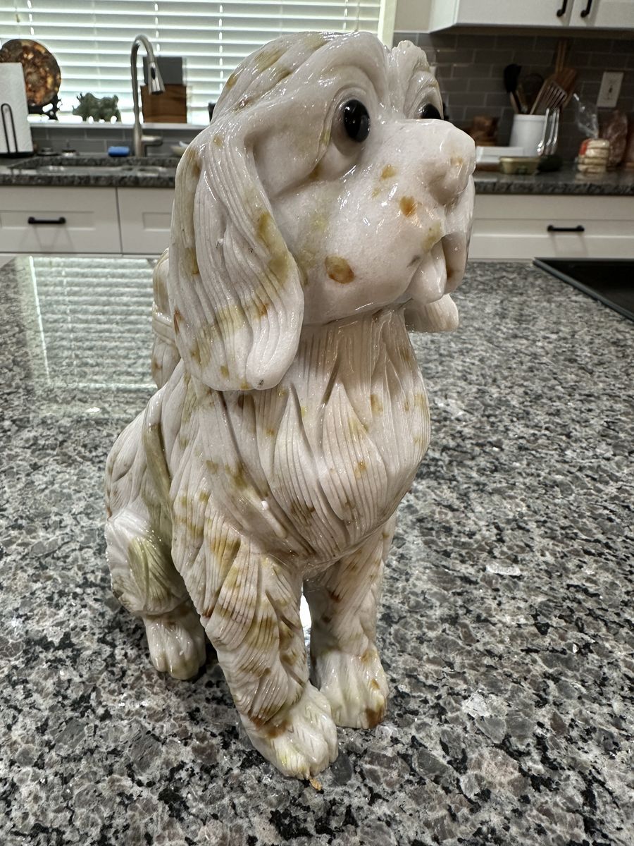 ZelleFor sale is a carved crystal jade cocker spaniel, approximately 9.5" tall, 4" wide and 6" deep and weighs 9.688 Lbs.
