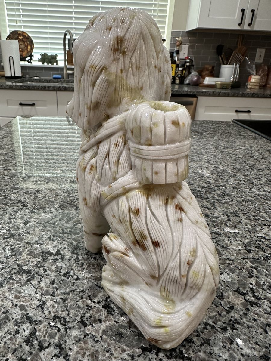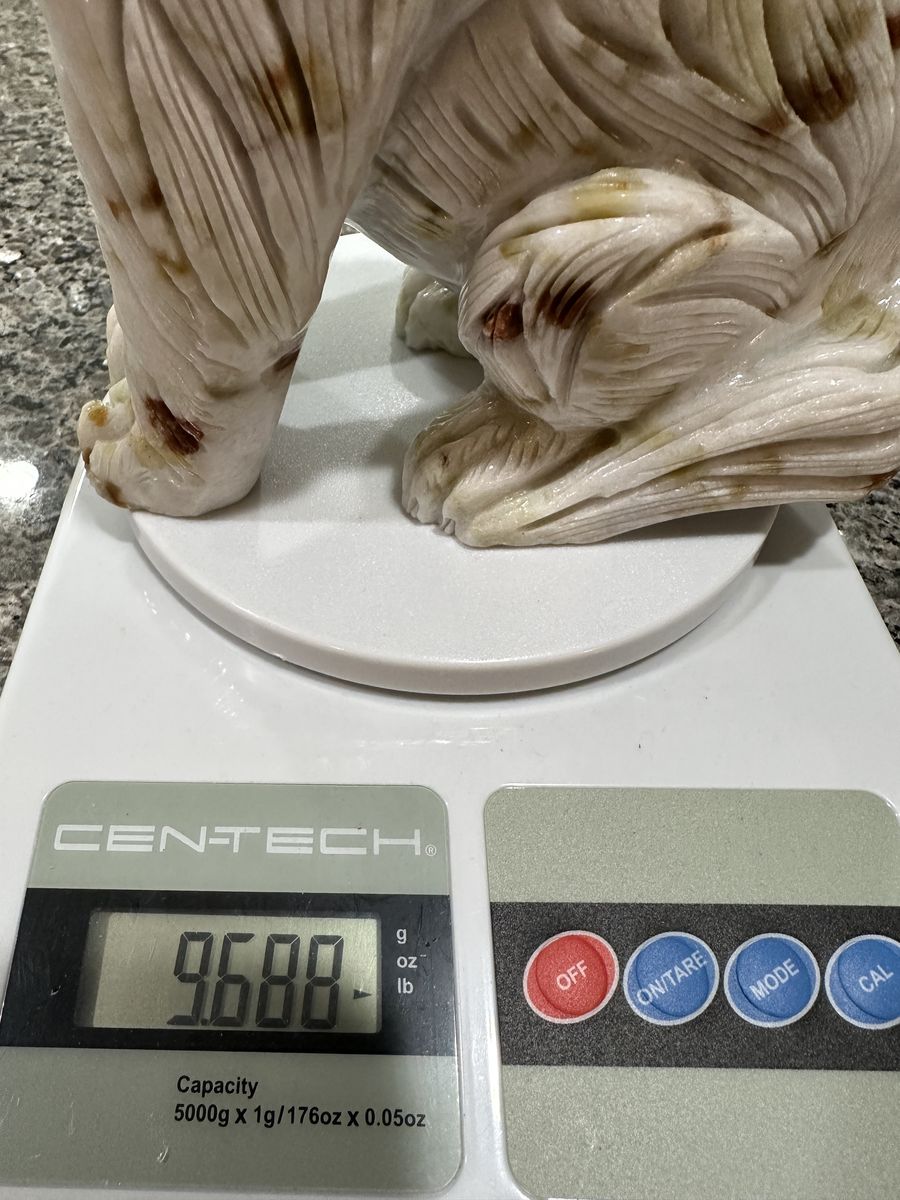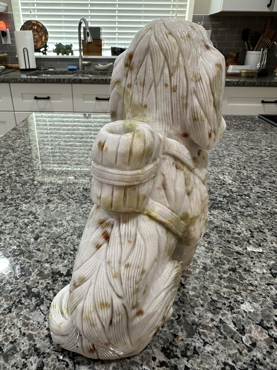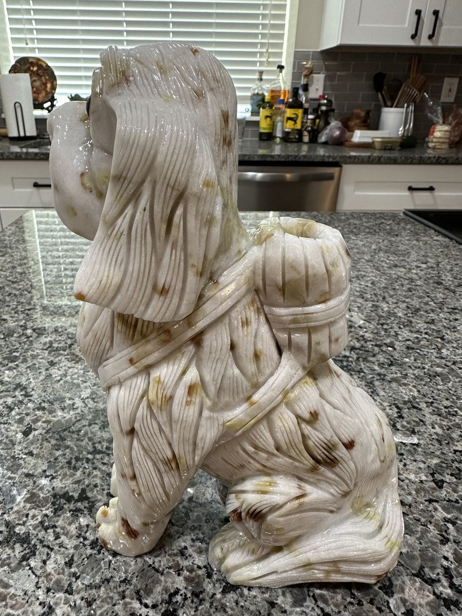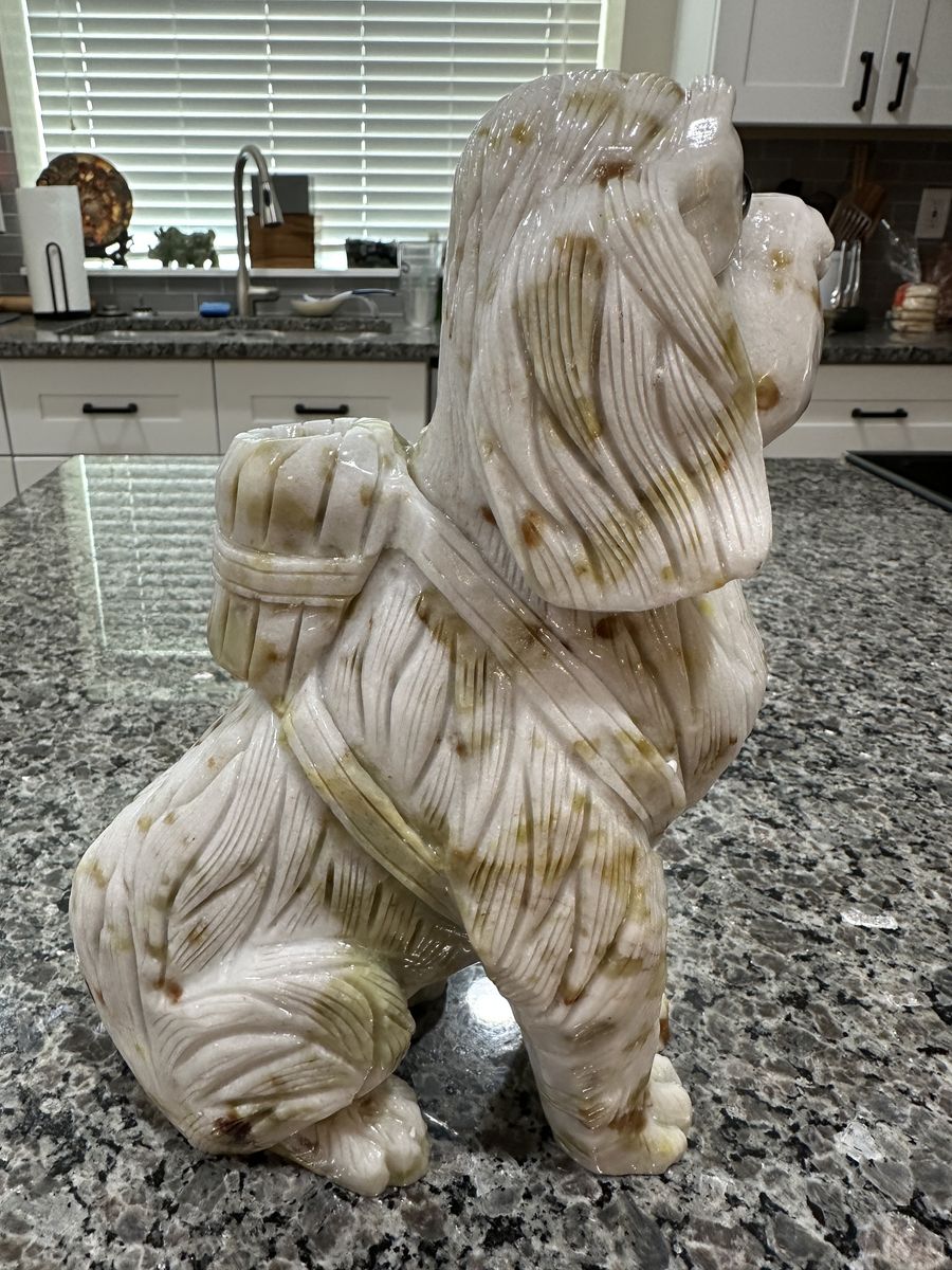 ZelleFor sale is a carved crystal jade cocker spaniel, approximately 9.5" tall, 4" wide and 6" deep and weighs 9.688 Lbs.