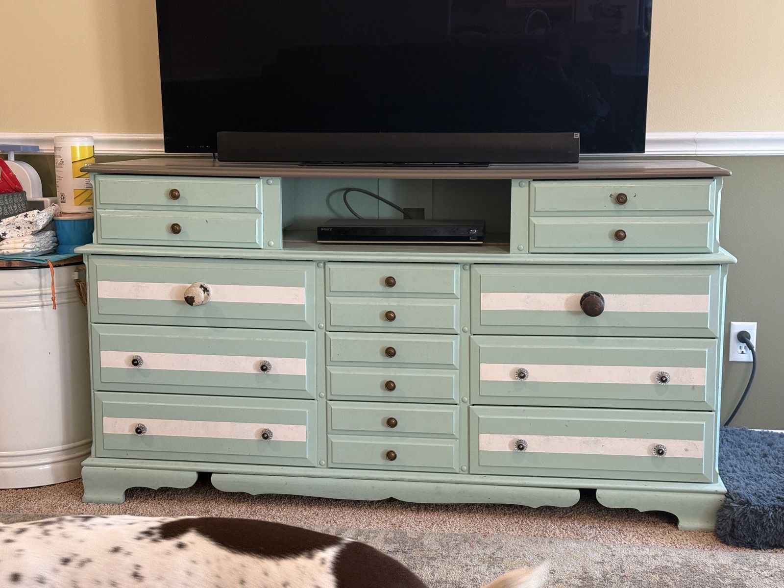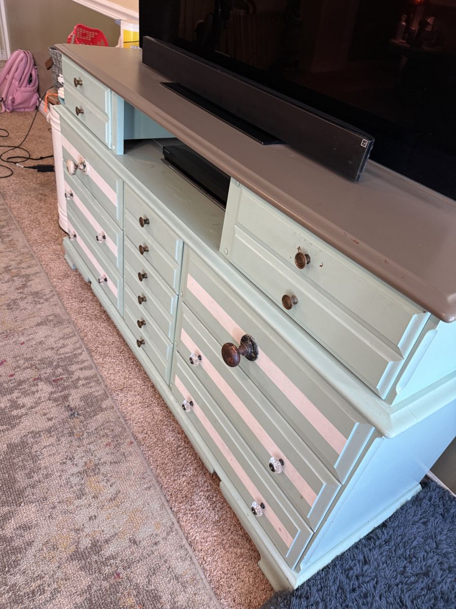 Dresser converted into a tv stand with 11 drawers. 18 1/2” deep X 63” Wide X 35” Tall