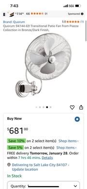 New in Box!!! Patio Fan from the Piazza collection Height: 22.25 inches Width: 18.00 inches Style: Transitional Light Type: Patio Fan Finish: Noir Safety Rating: Damp and Safety Listing: Damp