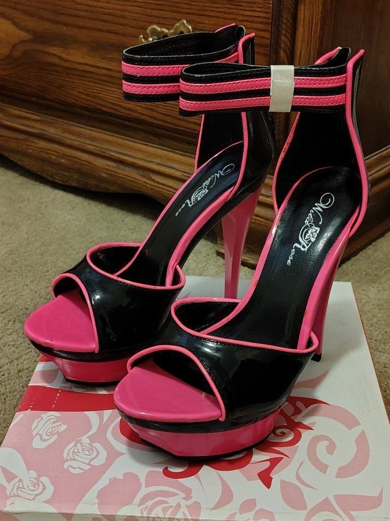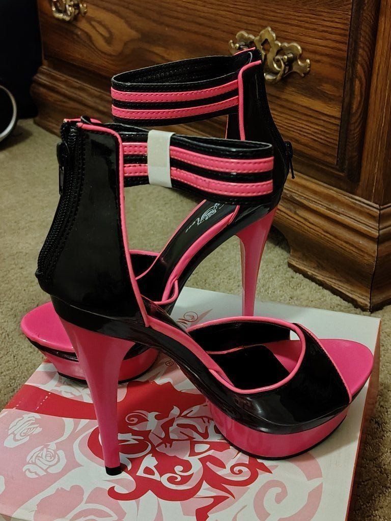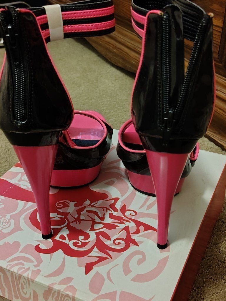 these are new in box women's strappy 6 inch heels. black and bright pink zip up the back and have a ankle strap. way cute. $20 cash only