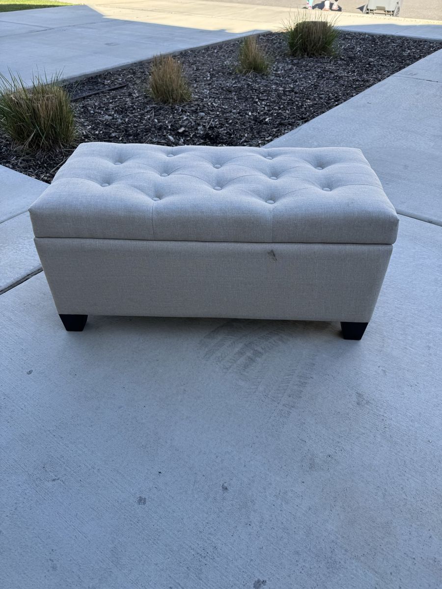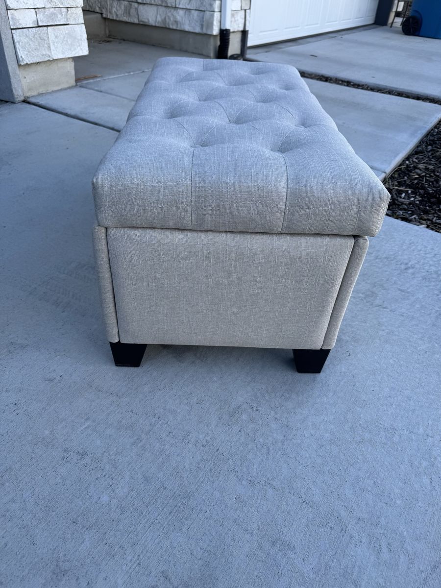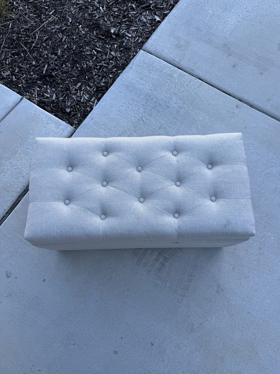 Great multipurpose piece. use it as a bench, footrest, or coffee table with hidden storage inside. Lift-top opens to a roomy interior. Linen-look fabric with button tufting on top. Dark wood legs.