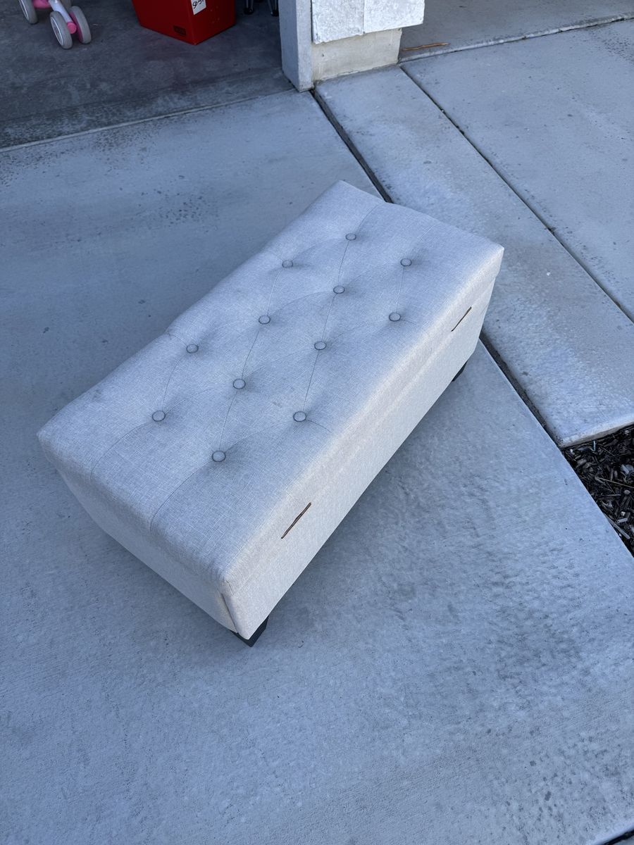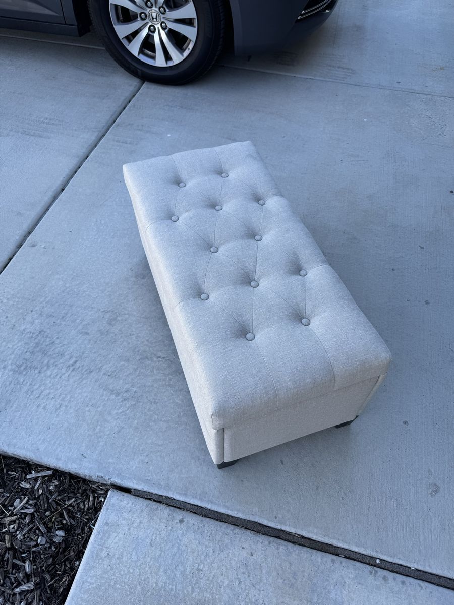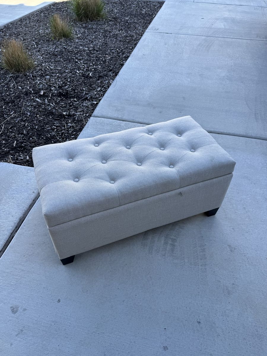 Great multipurpose piece. use it as a bench, footrest, or coffee table with hidden storage inside. Lift-top opens to a roomy interior. Linen-look fabric with button tufting on top. Dark wood legs.