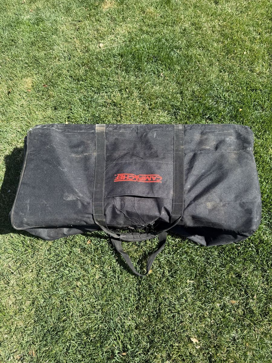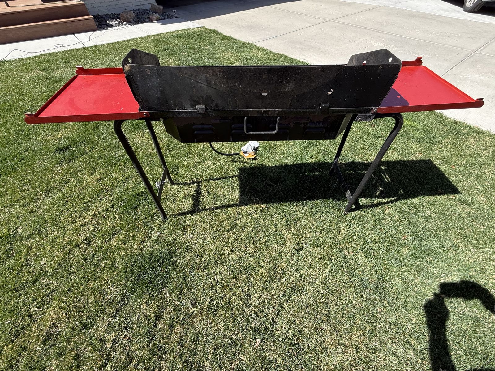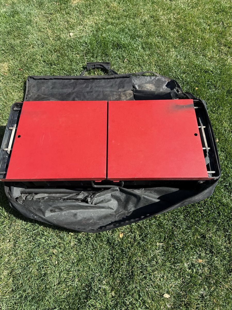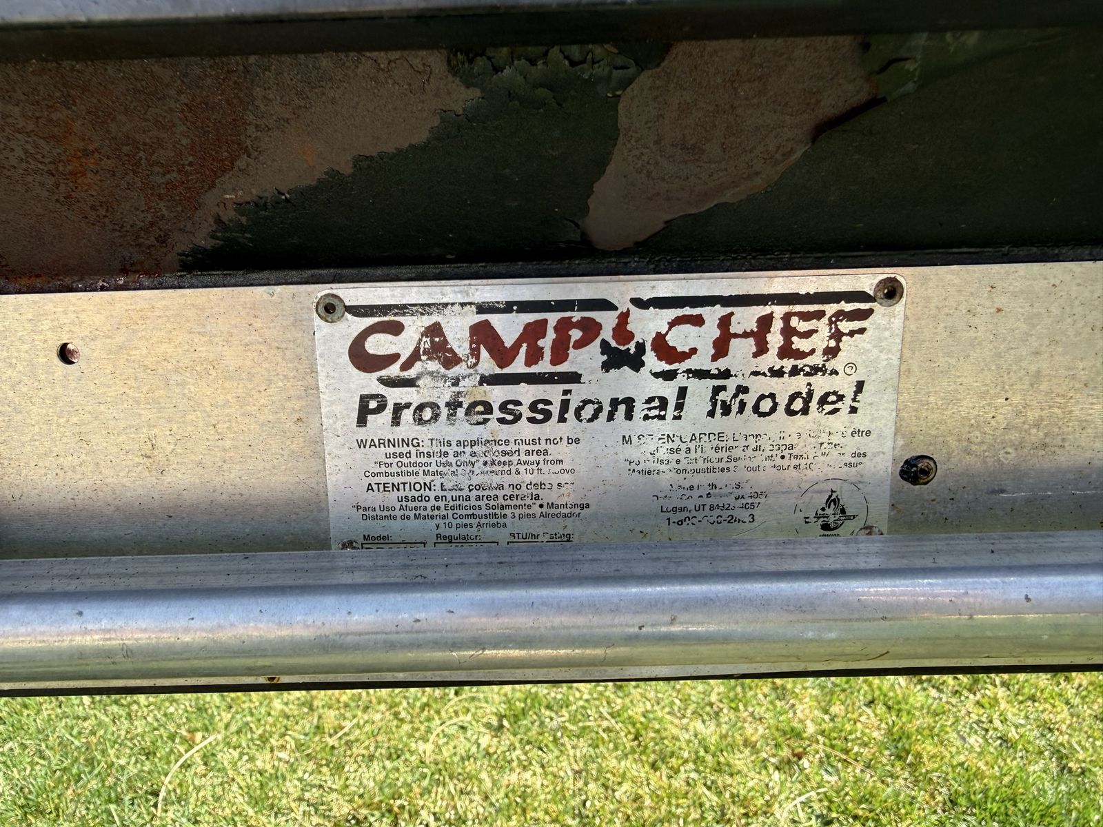 VenmoCamp Chef Professional Model 2 Burner Propane Stove. Dimensions are 33 wide by 14 deep. Stands 31 inches tall. folds down to 34 x 14 x 10. Propane connector is new. Both burners work great. Includes a windshield and carrying case. The carrying case works but is quite worn.