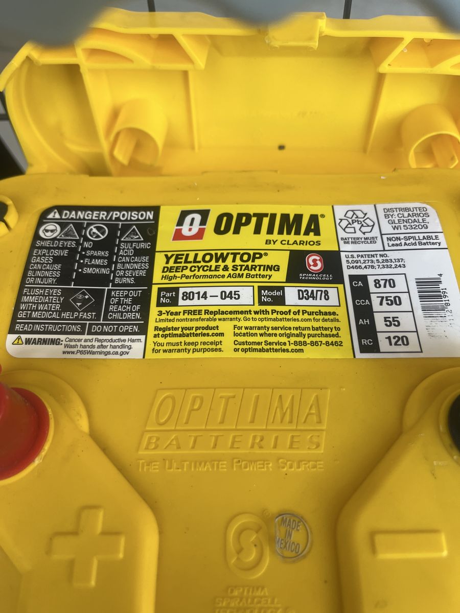 ZelleOptima yellowtop deep cycle and starting high performance AGM battery. Part no. 8014-045. Model no. D34/78