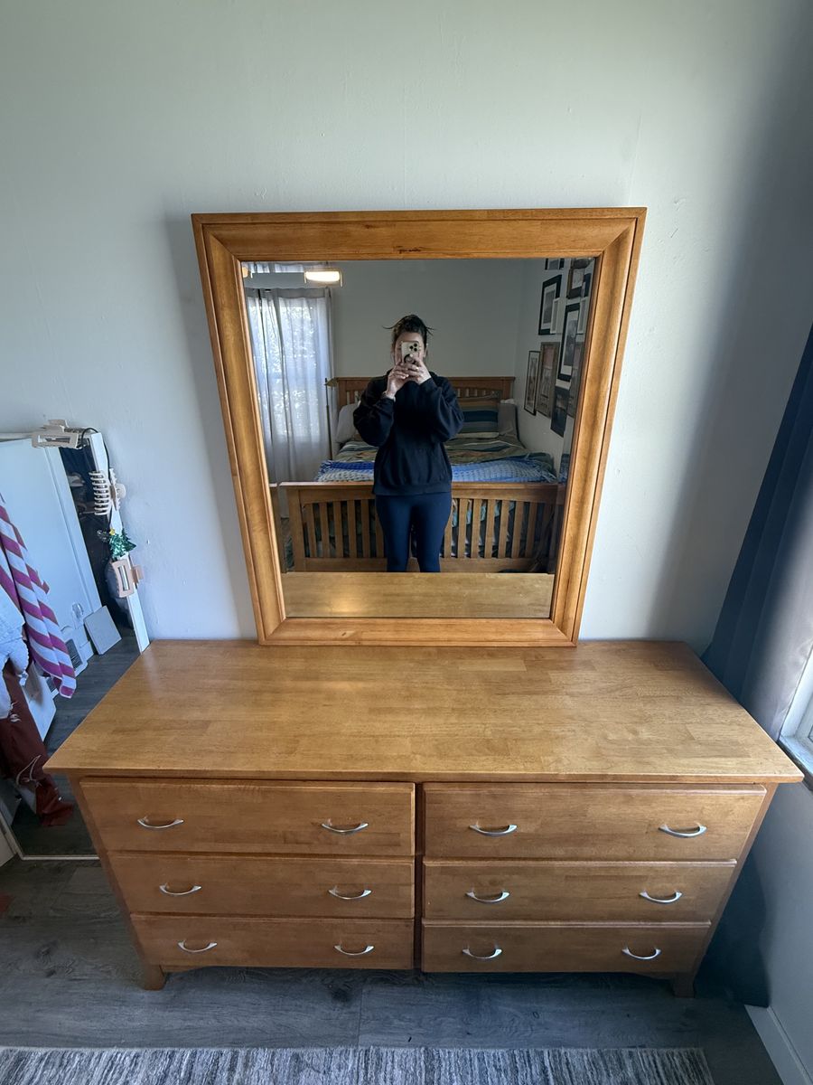 VenmoGently used in a guest room for years. 61” long. Excellent condition with matching mirror attached to the back. No dings or scuffs!