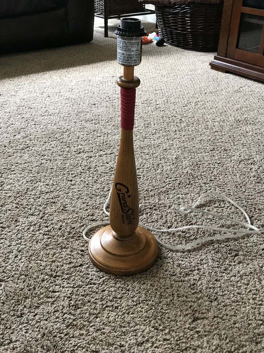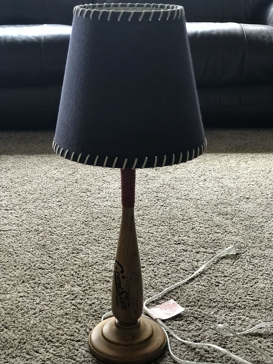 VenmoPottery Barn Batter Up wooden table lamp with red tape accent. It is in good condition and works the lamp shade is cracked on the inside but still looks alright on the outside. This lamp would be perfect for a sports themed room.