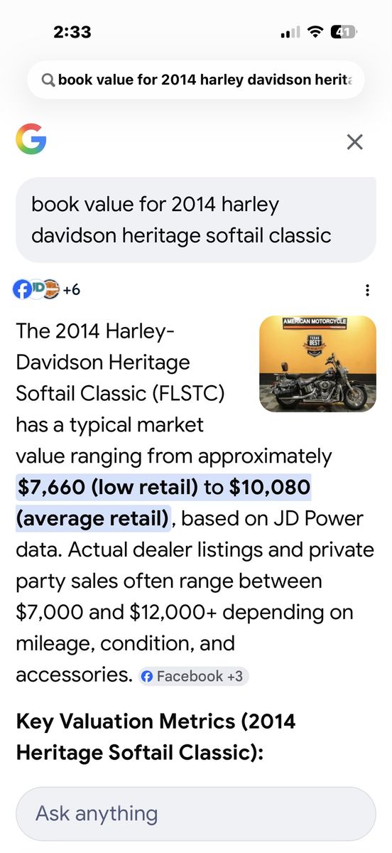 Venmo2014 Harley Davidson Heritage Softail Classic FLSTC 103 ci Engine 1700 cc Windshield , chrome Fangs, saddle bags, sissy bar 7500 miles. If you know anything about Harleys …. It’s just broke in…. Not a scratch on it , looks brand new !!!! Cash , Check or Venmo Call or Text is best , Please no low ballers Or Scammer’s
