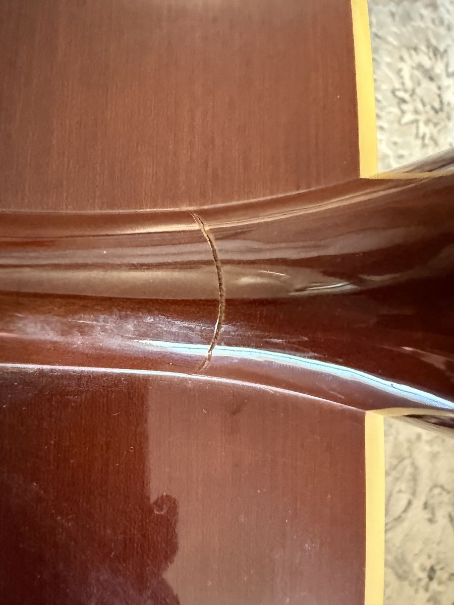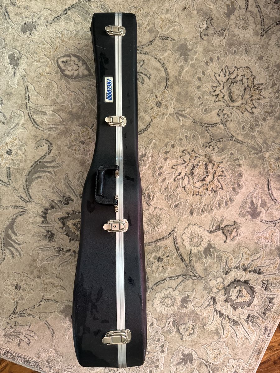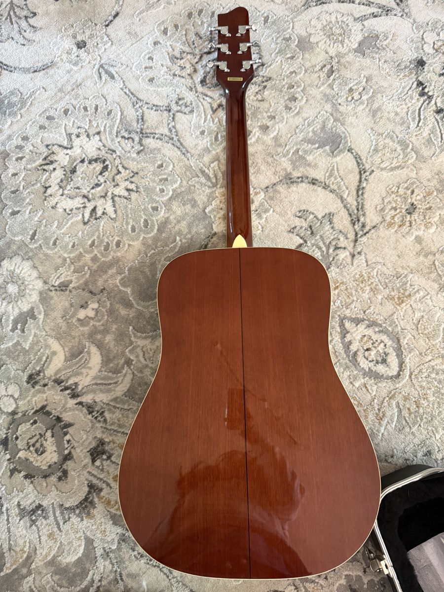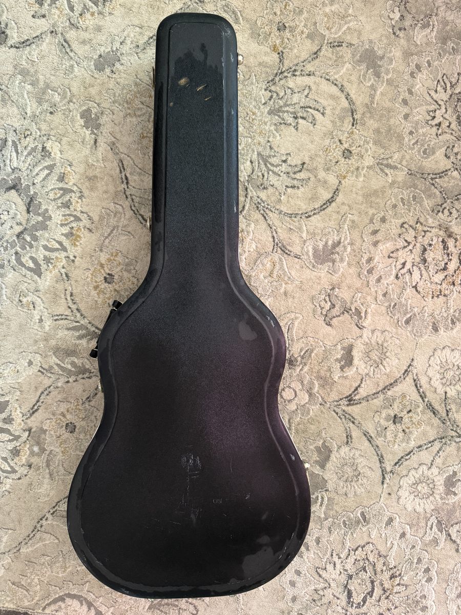 Accoustic guitar with hard case. Strap for guita. Used in fair/good condition. Crack on back (see last photo).
