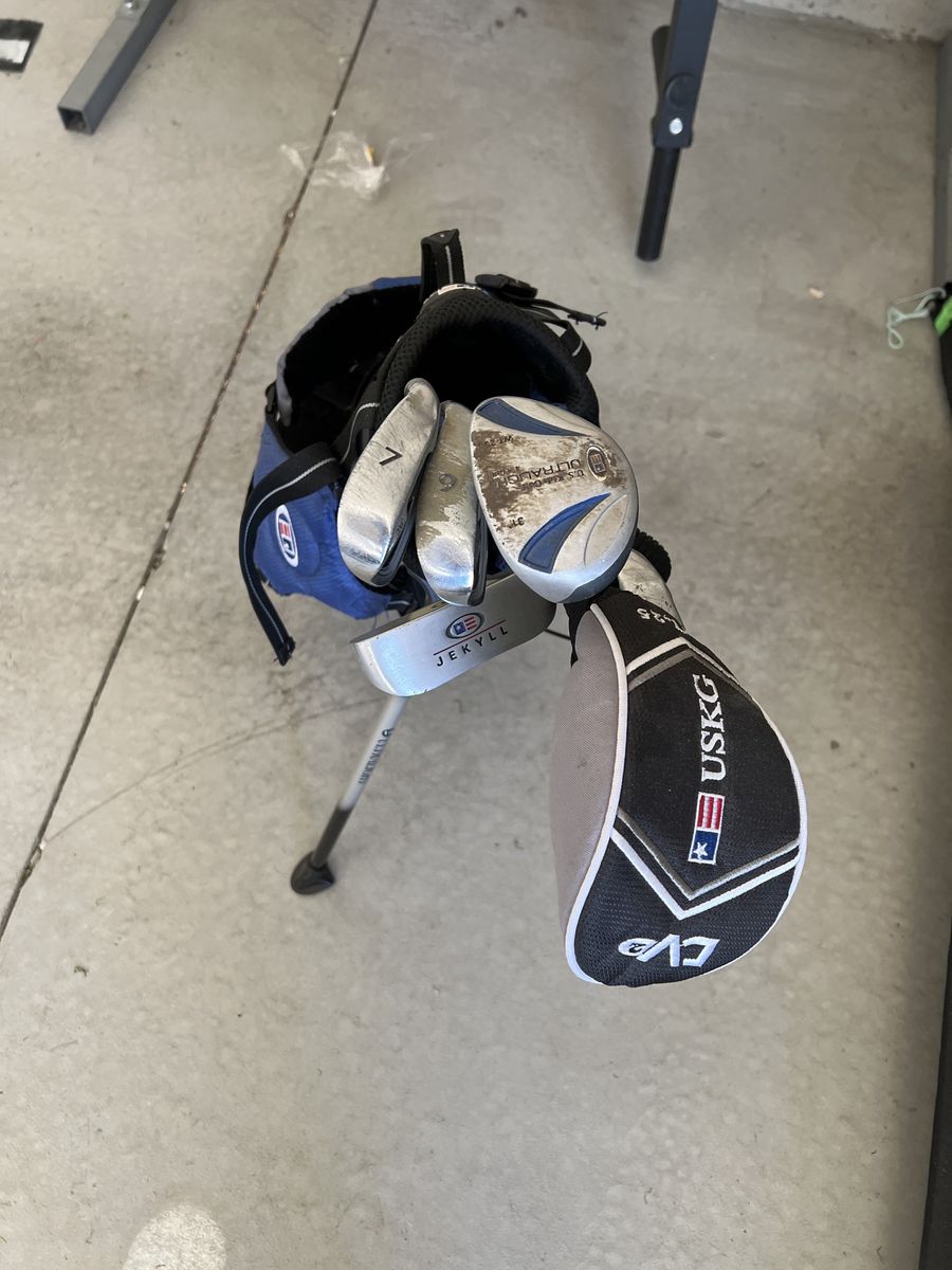 VenmoGreat beginner set us kids golf clubs. The set includes a driver, a 31° hybrid, a seven iron, a nine iron, the putter and the stand bag.