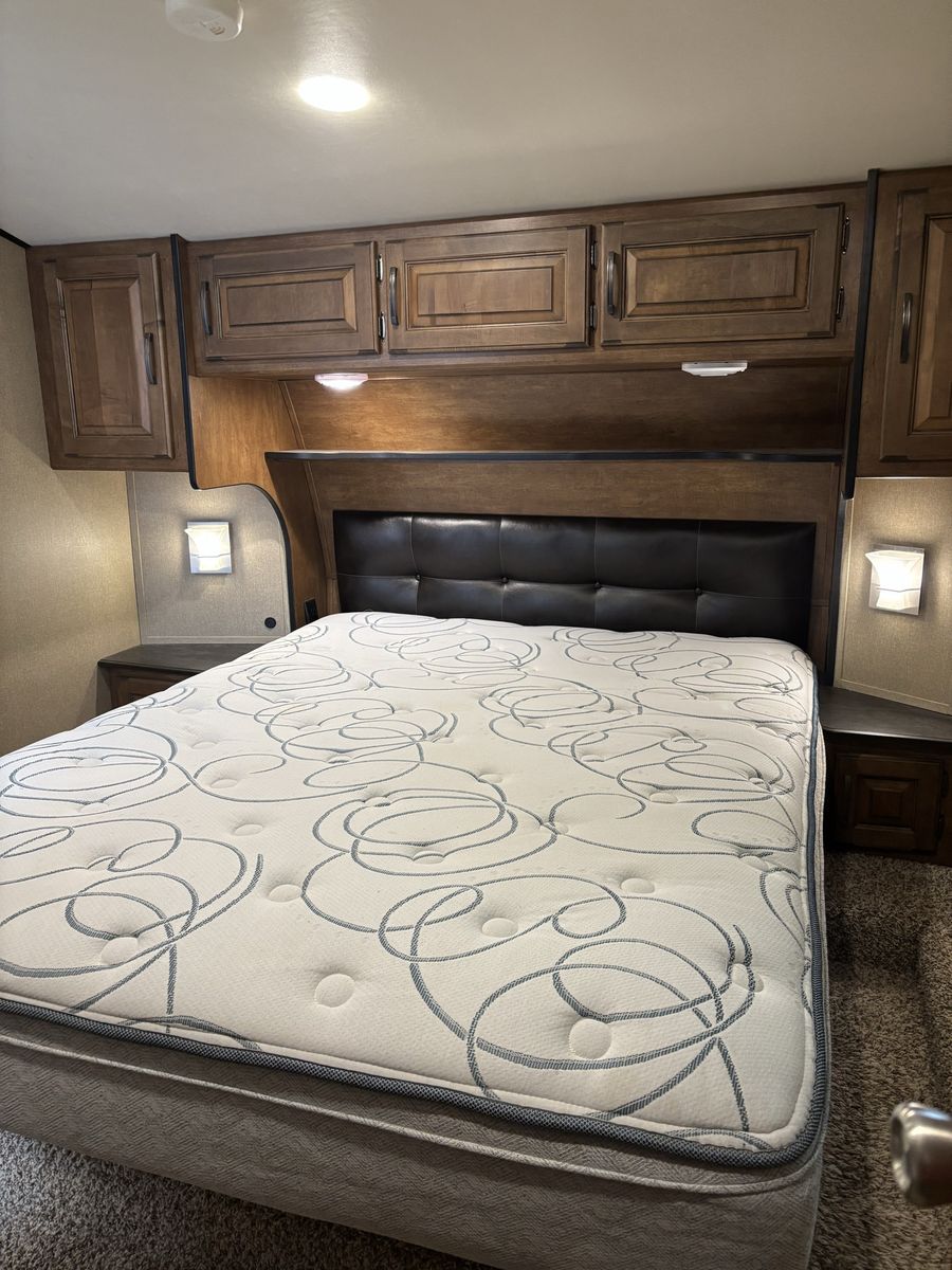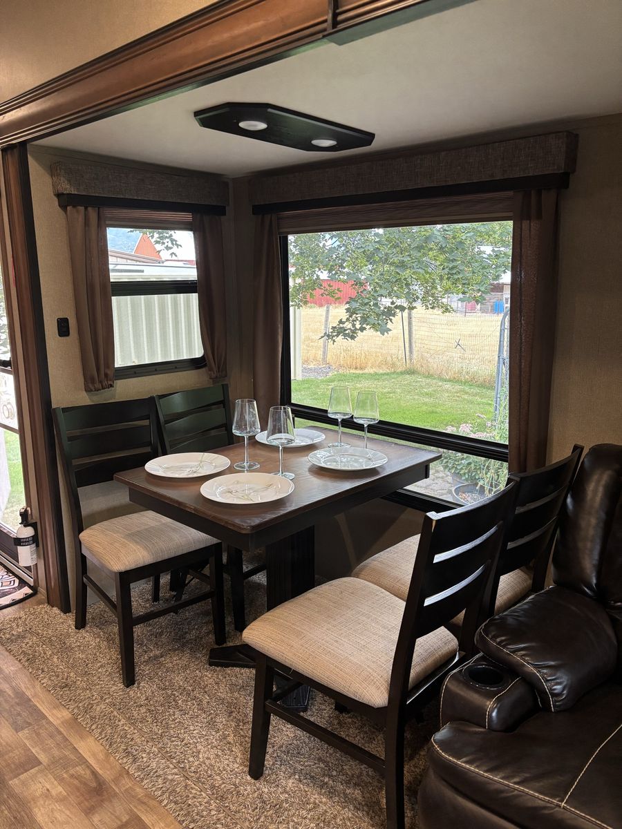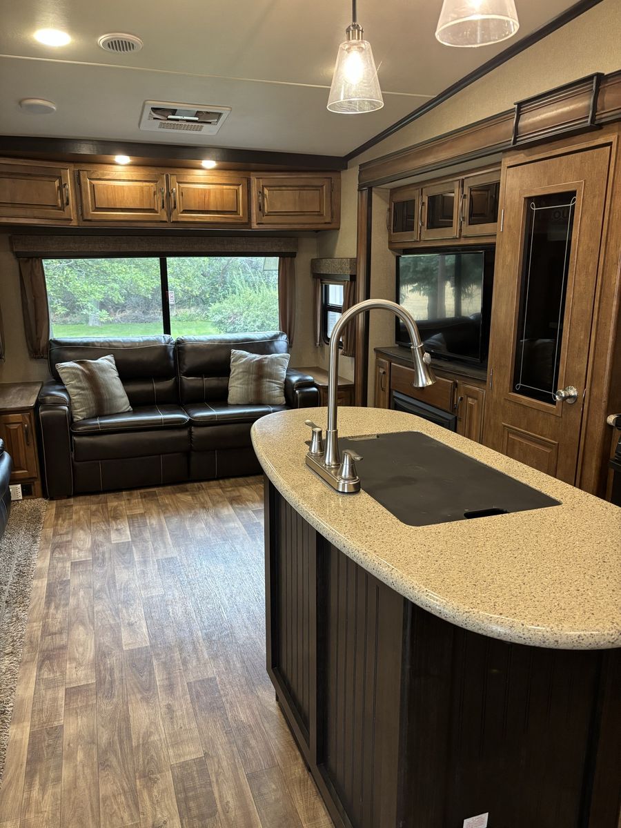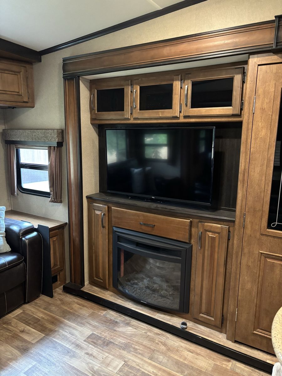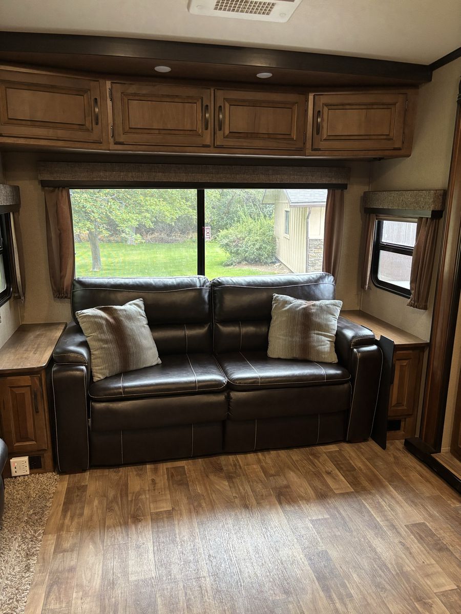Comes with 3 slides, electric awning, Self Leveling, heated underbelly, new tires, two new 12 Volt batteries, two surge protectors (one built into the trailer and one to use at RV parks), winter storage cover, chocks, heavyweight trailer electrical cords, Anderson Hitch, sewage hose, new backup camera, large TV, electric fireplace, stereo,AC, furnace and rear cargo rack on rear of trailer. Can run on 30 or 50 amp service. Living room has leather couch that makes into a queen size bed, double recliner, electric fireplace, stereo and large rear window.