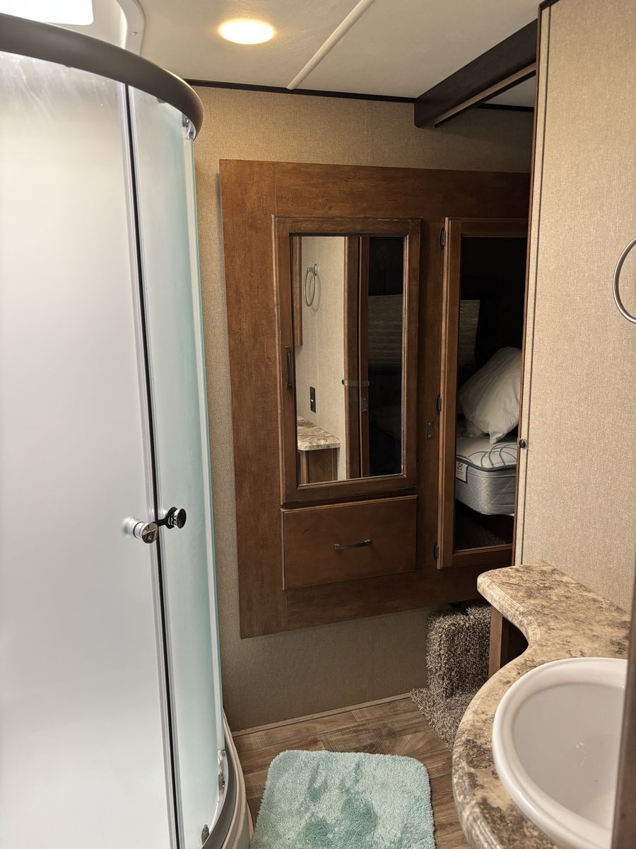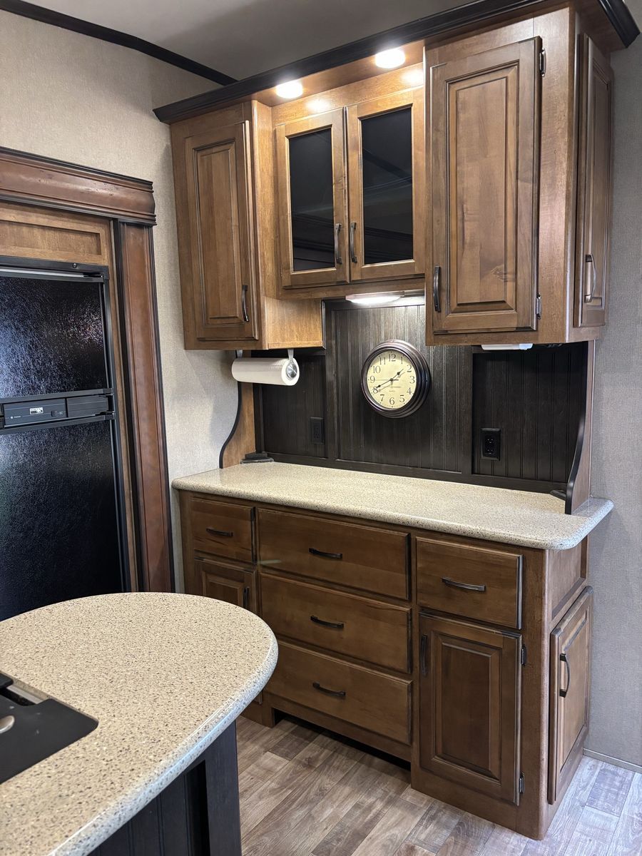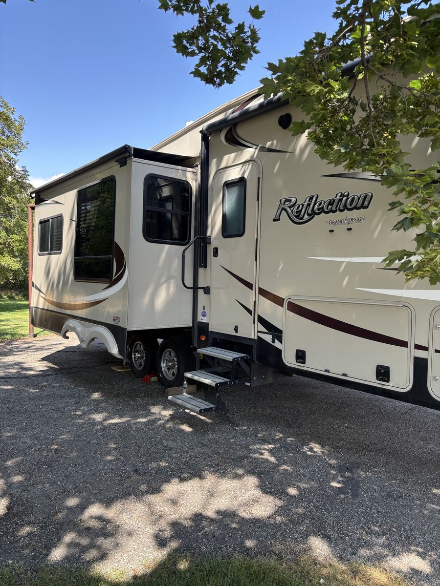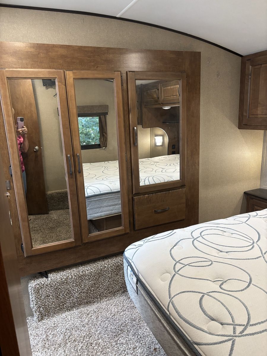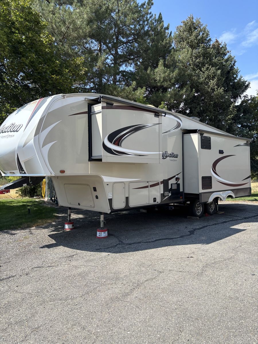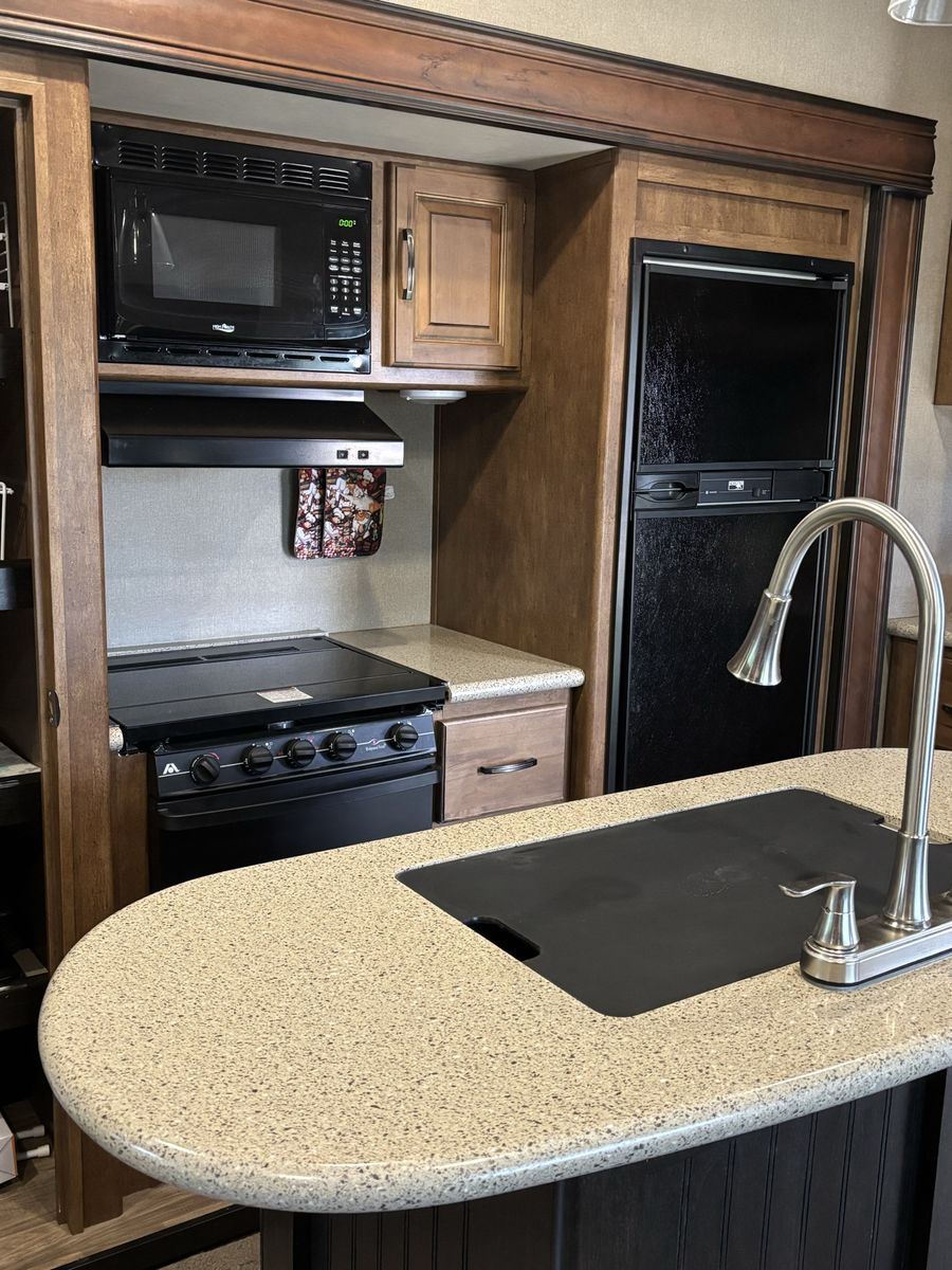 Comes with 3 slides, electric awning, Self Leveling, heated underbelly, new tires, two new 12 Volt batteries, two surge protectors (one built into the trailer and one to use at RV parks), winter storage cover, chocks, heavyweight trailer electrical cords, Anderson Hitch, sewage hose, new backup camera, large TV, electric fireplace, stereo,AC, furnace and rear cargo rack on rear of trailer. Can run on 30 or 50 amp service. Living room has leather couch that makes into a queen size bed, double recliner, electric fireplace, stereo and large rear window.