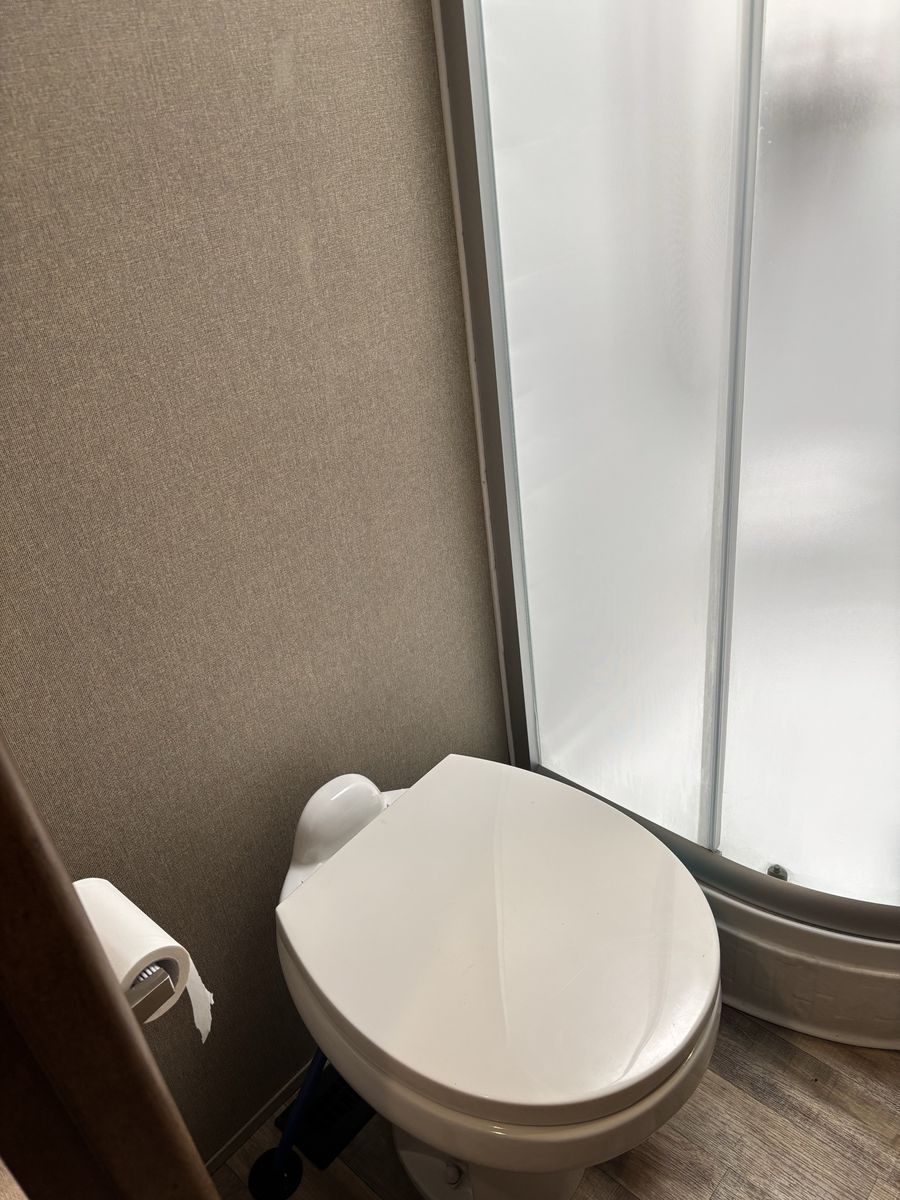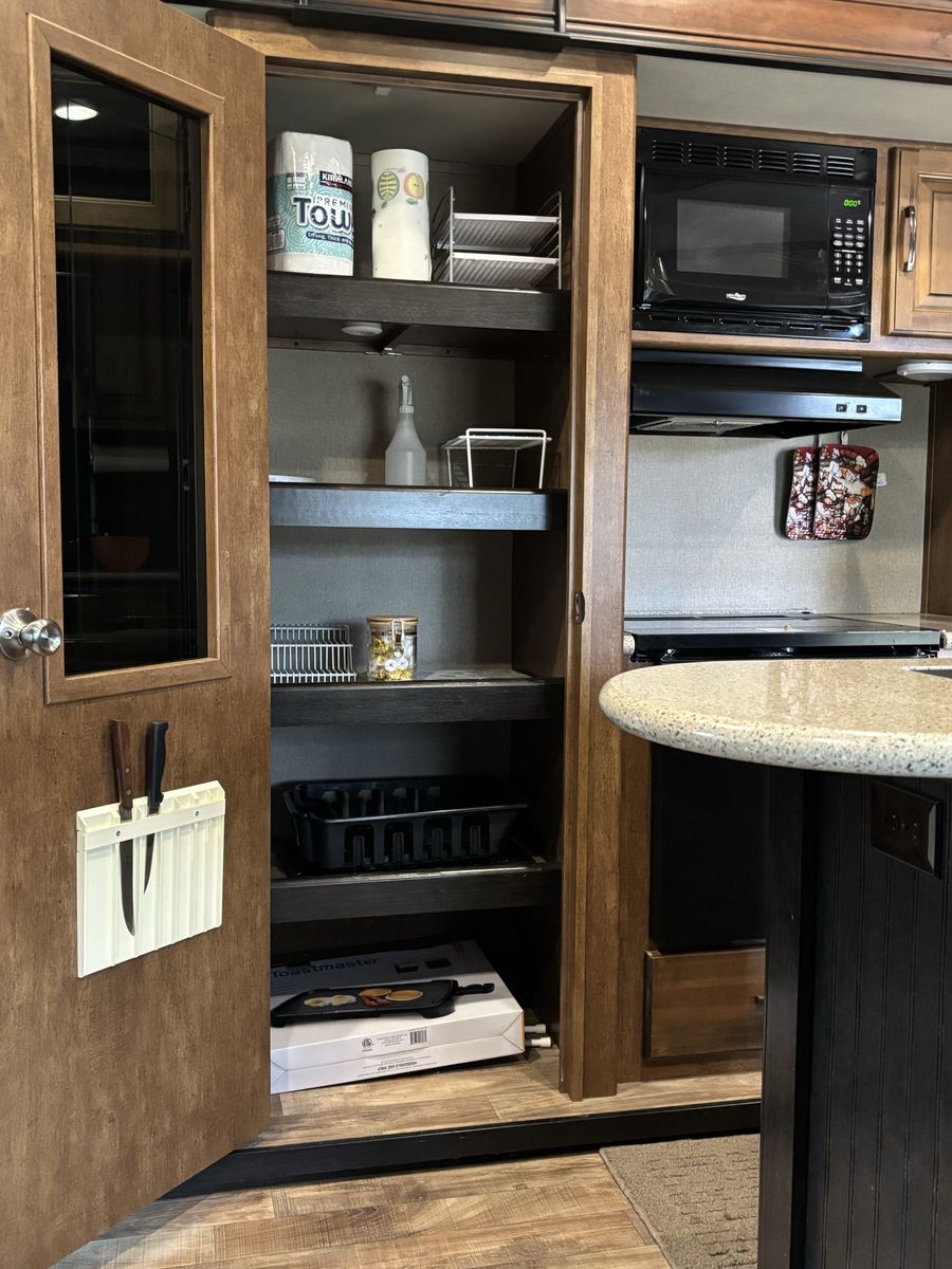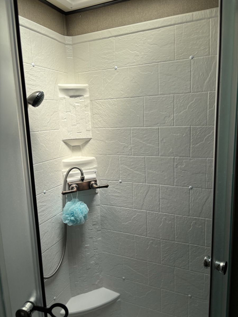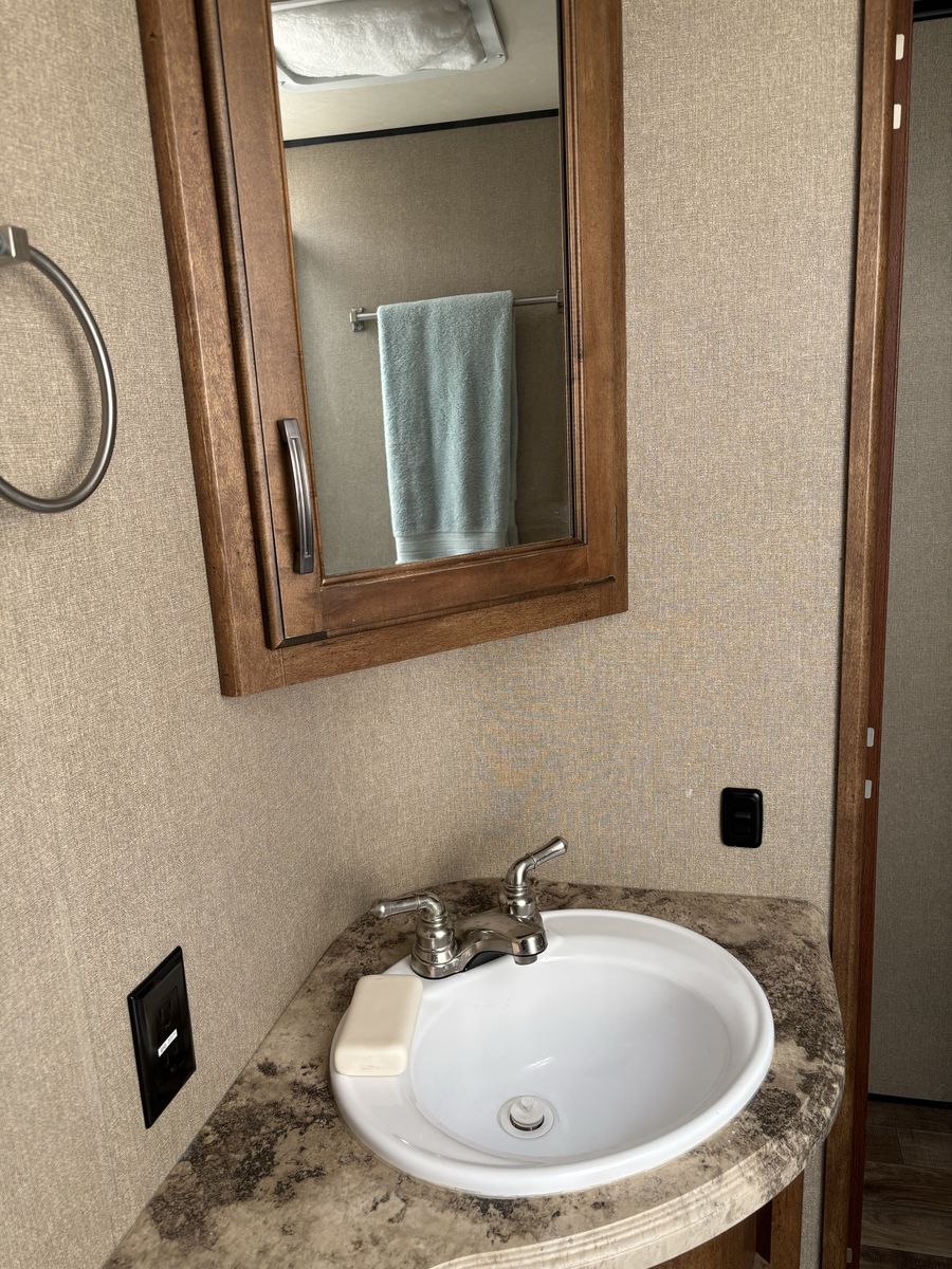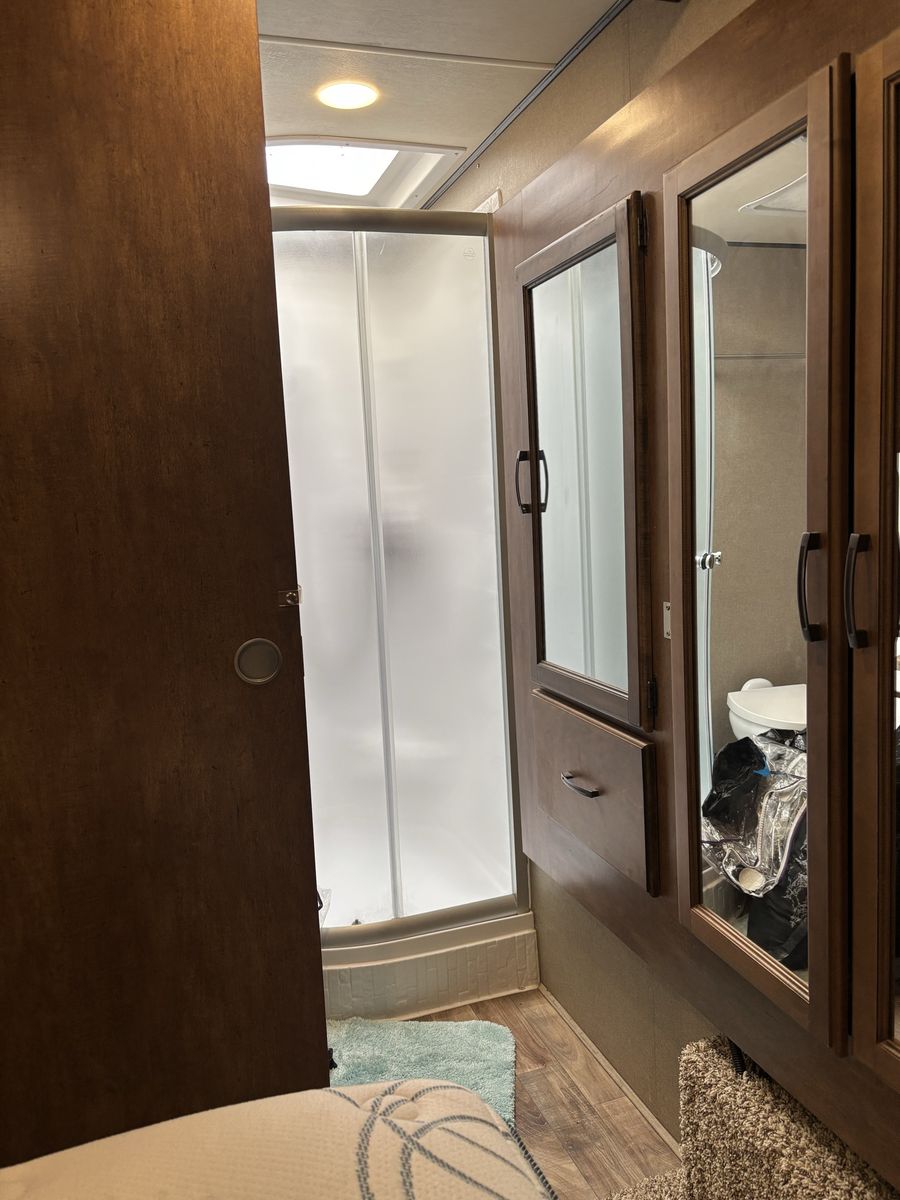 Comes with 3 slides, electric awning, Self Leveling, heated underbelly, new tires, two new 12 Volt batteries, two surge protectors (one built into the trailer and one to use at RV parks), winter storage cover, chocks, heavyweight trailer electrical cords, Anderson Hitch, sewage hose, new backup camera, large TV, electric fireplace, stereo,AC, furnace and rear cargo rack on rear of trailer. Can run on 30 or 50 amp service. Living room has leather couch that makes into a queen size bed, double recliner, electric fireplace, stereo and large rear window.