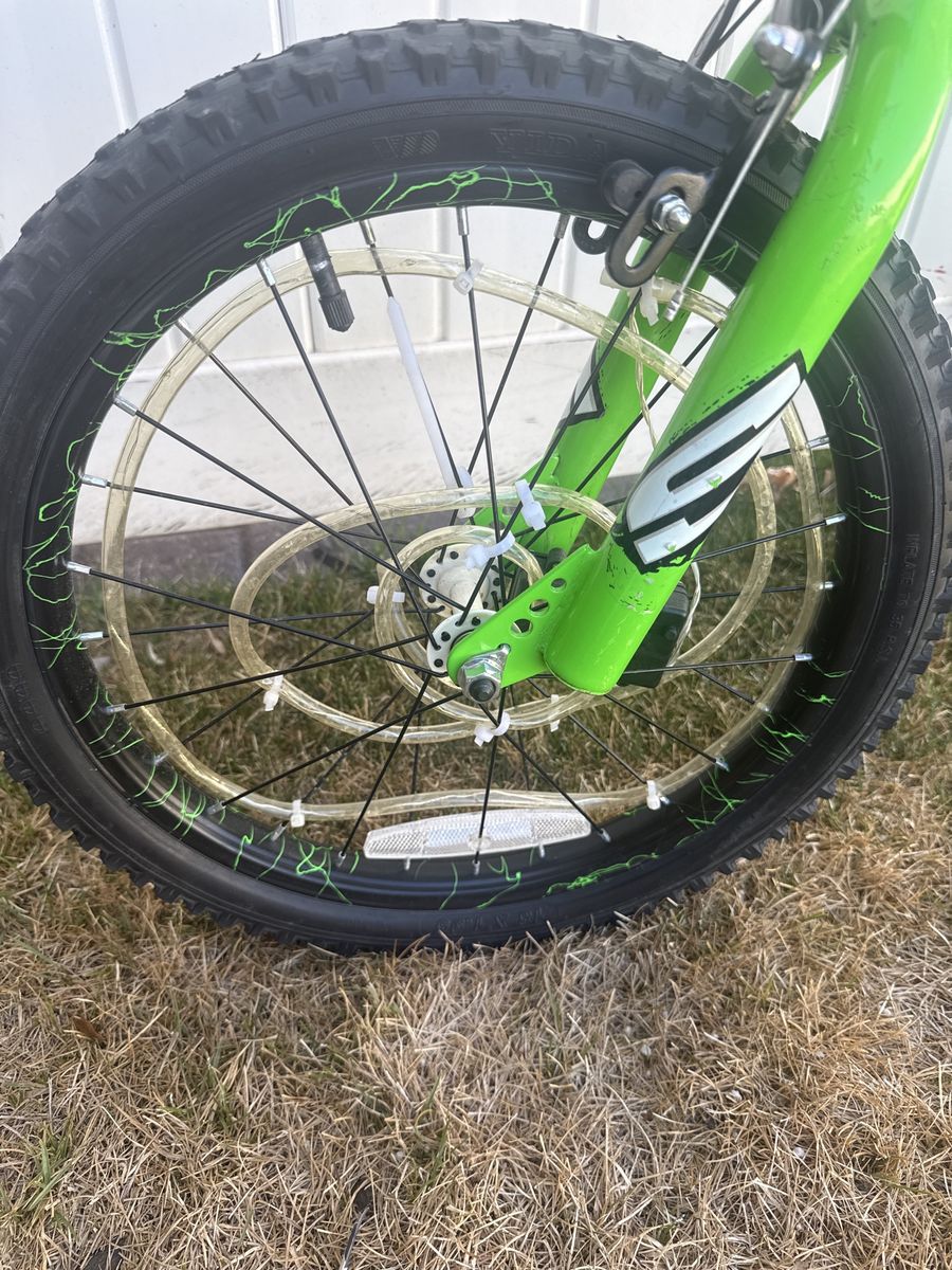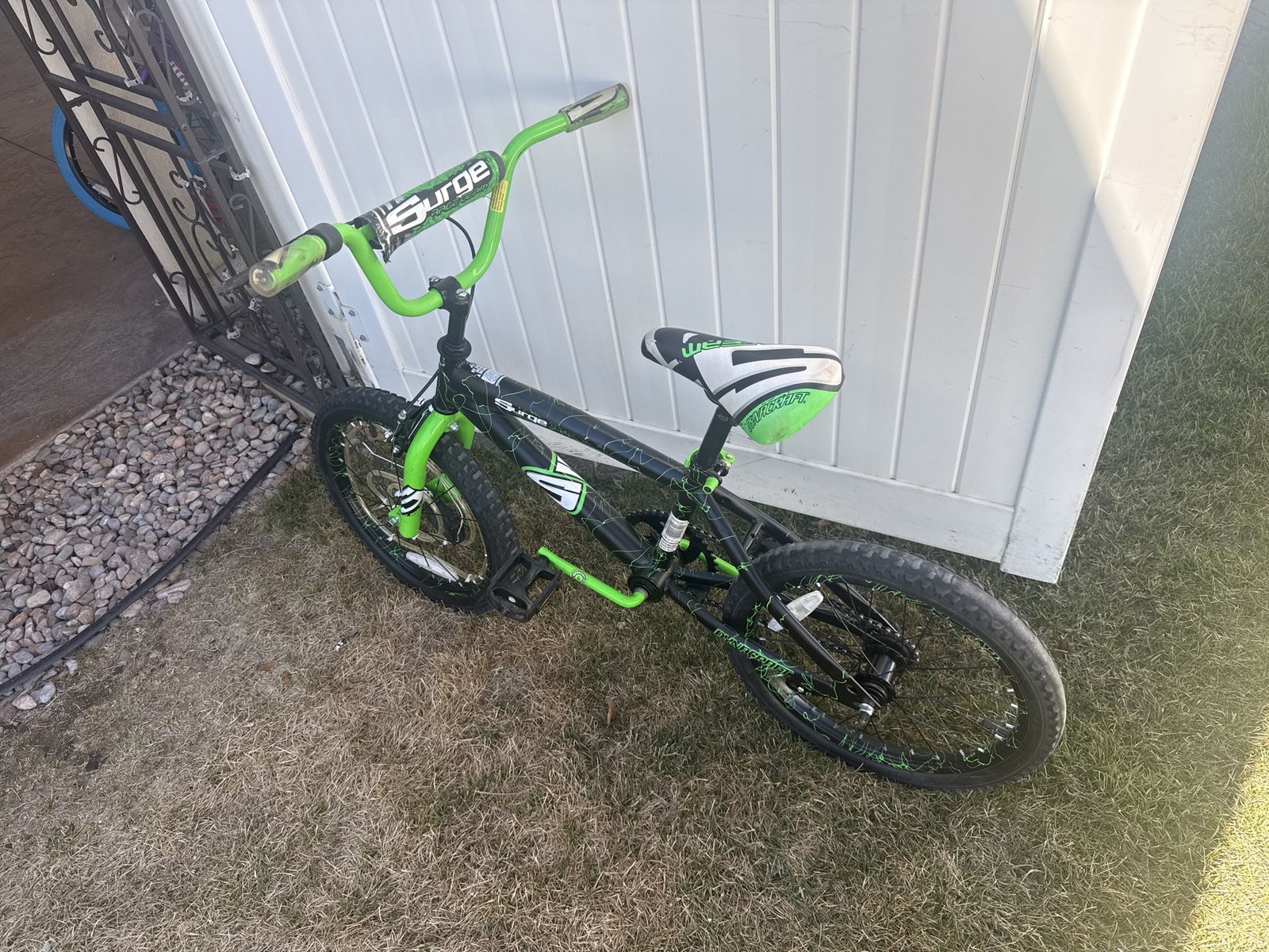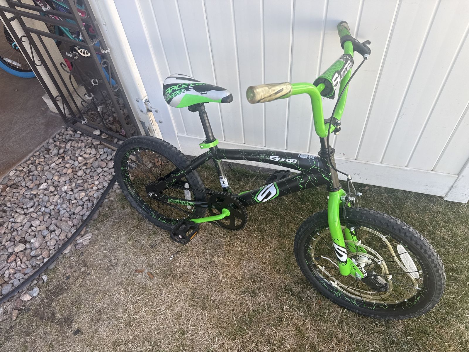 VenmoBlack and Green “ Surge” boys bicycle made by Dynacraft. This is an 18 inch BMX bike with front left hand brake for front wheel and regular pedal coaster brakes for the back wheel. Wheels are true and coast well. Great bike!!! Ready for upcoming spring and summer fun!!!