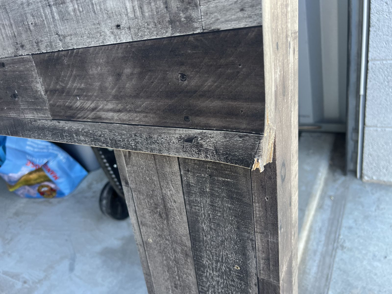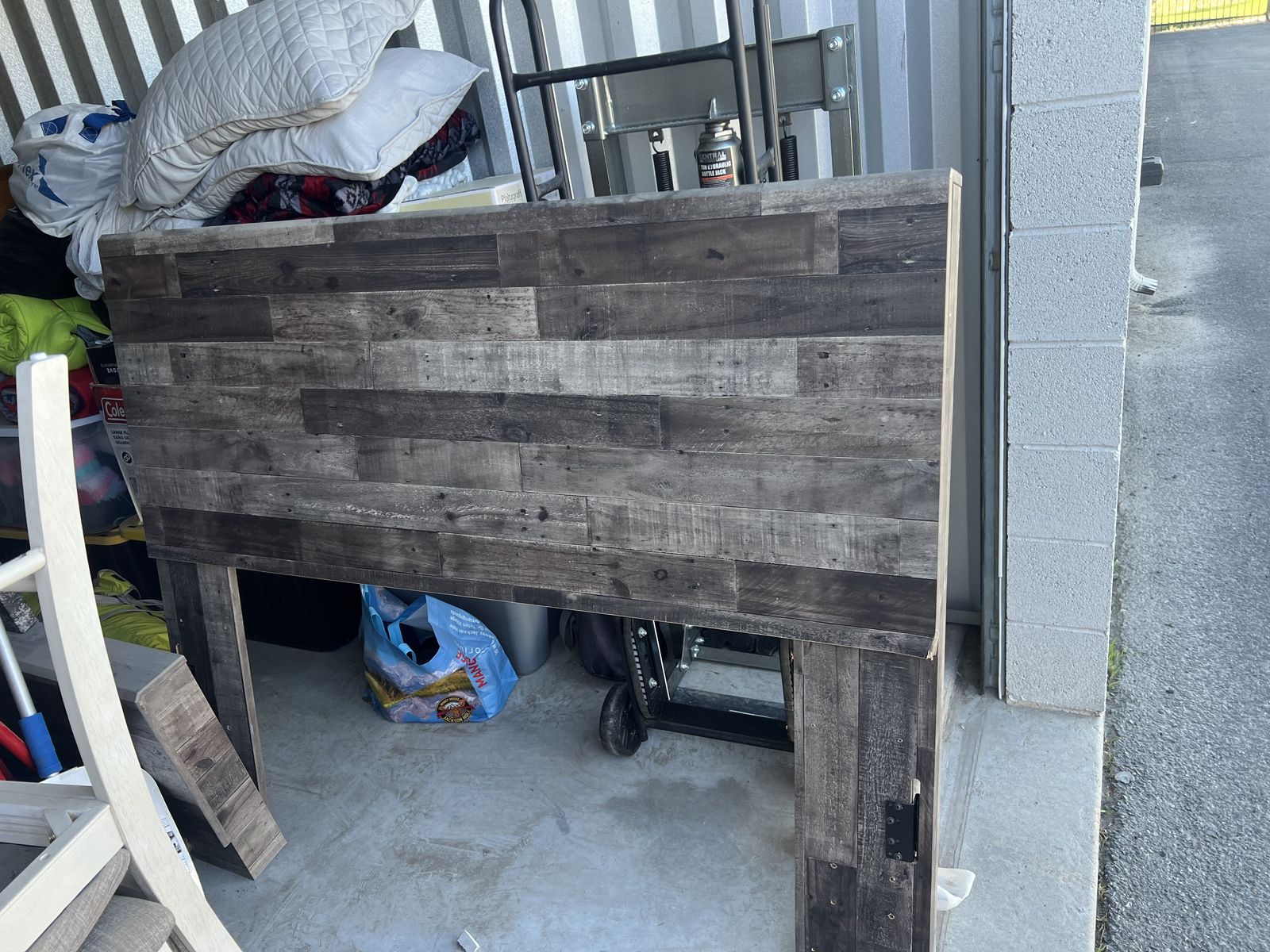Selling queen size bed frame, was used slfor about a year then put in storage, head board, foot board side rails and cross supports, there is a small ding in the head board that I noticed when I got it home, wasnt bad enought to box up and take back, it was hidden when the mattress was on, can see in photos. Paid $399 new asking $200 or offer