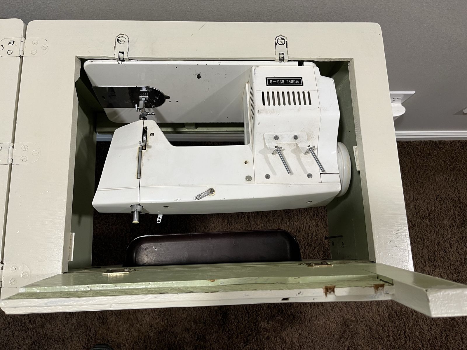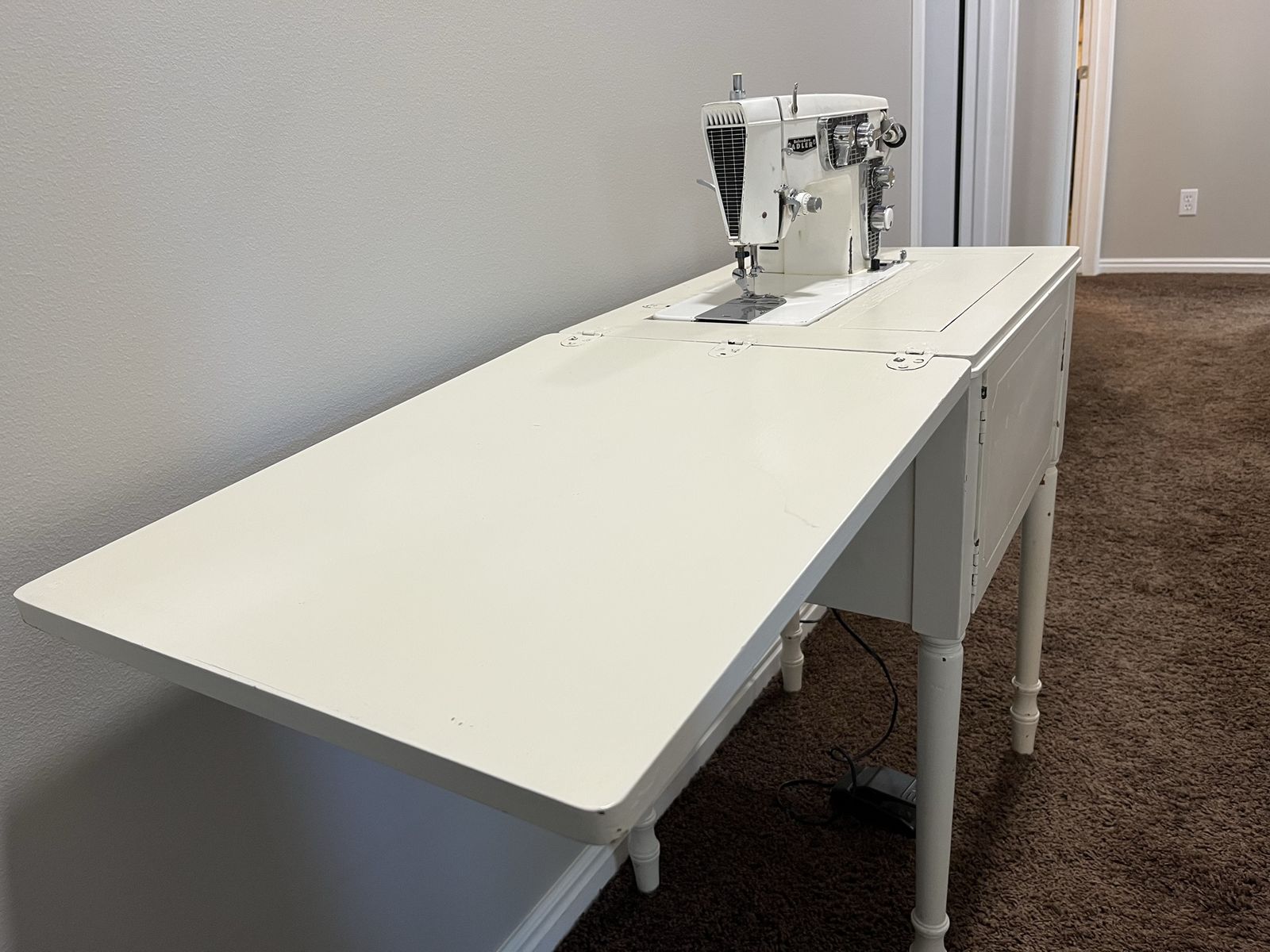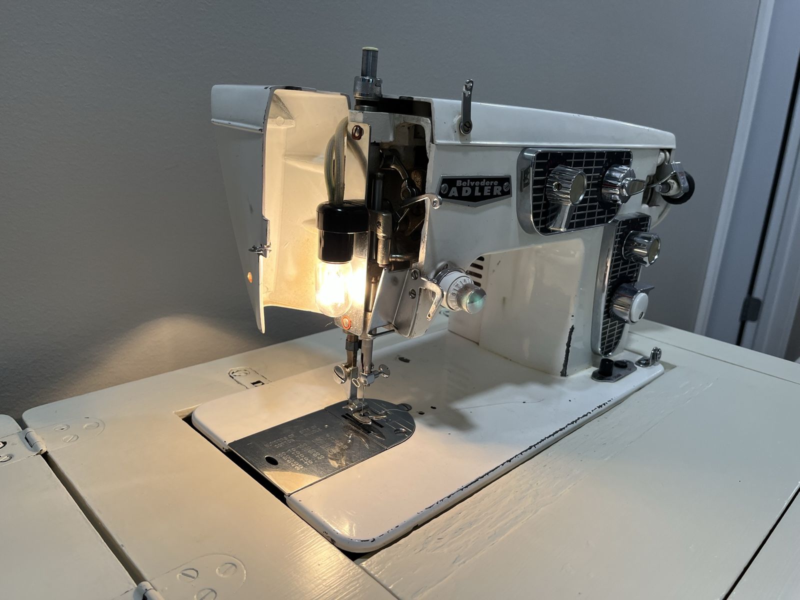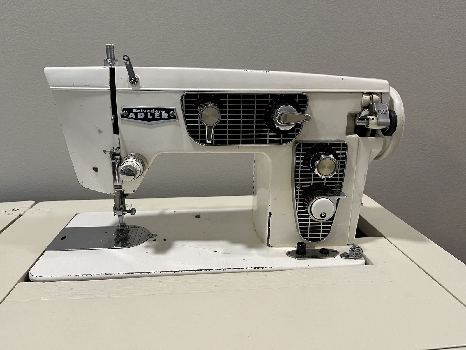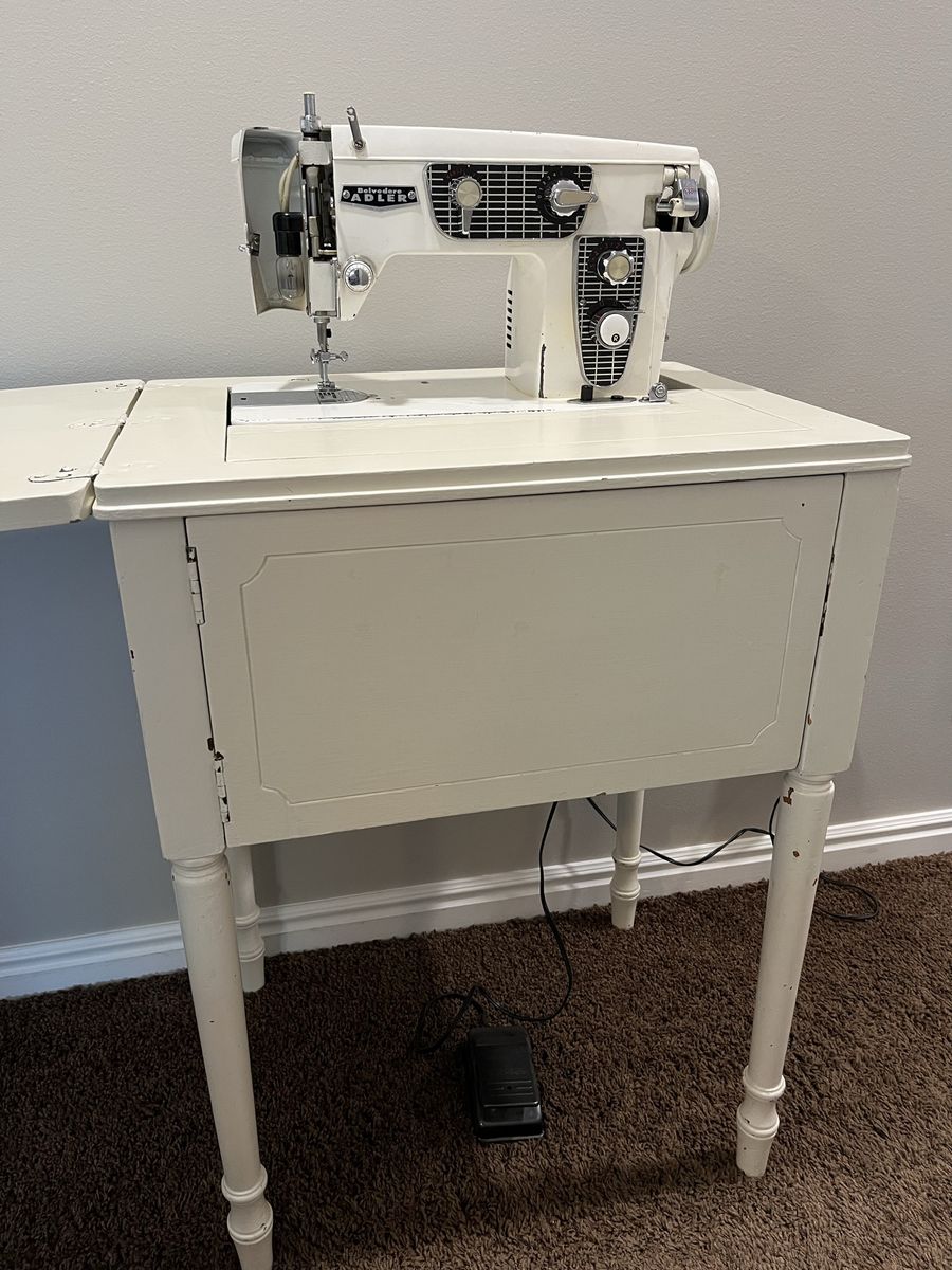 VenmoThis Belvedere Adler sewing maching is an all metal, heavy duty, with metal gears, and durable. It had maintenace work done about 2 years ago and works great. It is tested and running. Original cabinet.