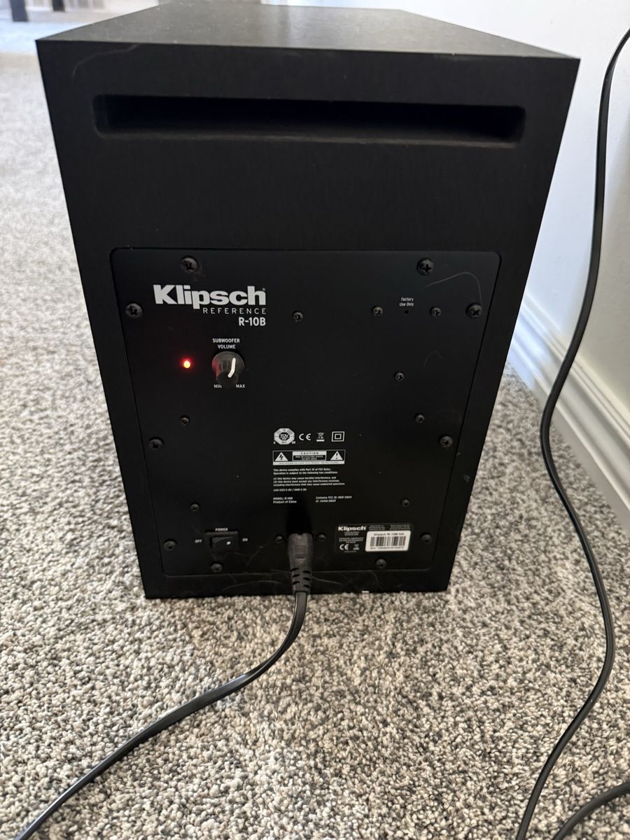 Klipsch R-10B soundbar with wireless subwoofer and remote. Excellent condition, sounds great.