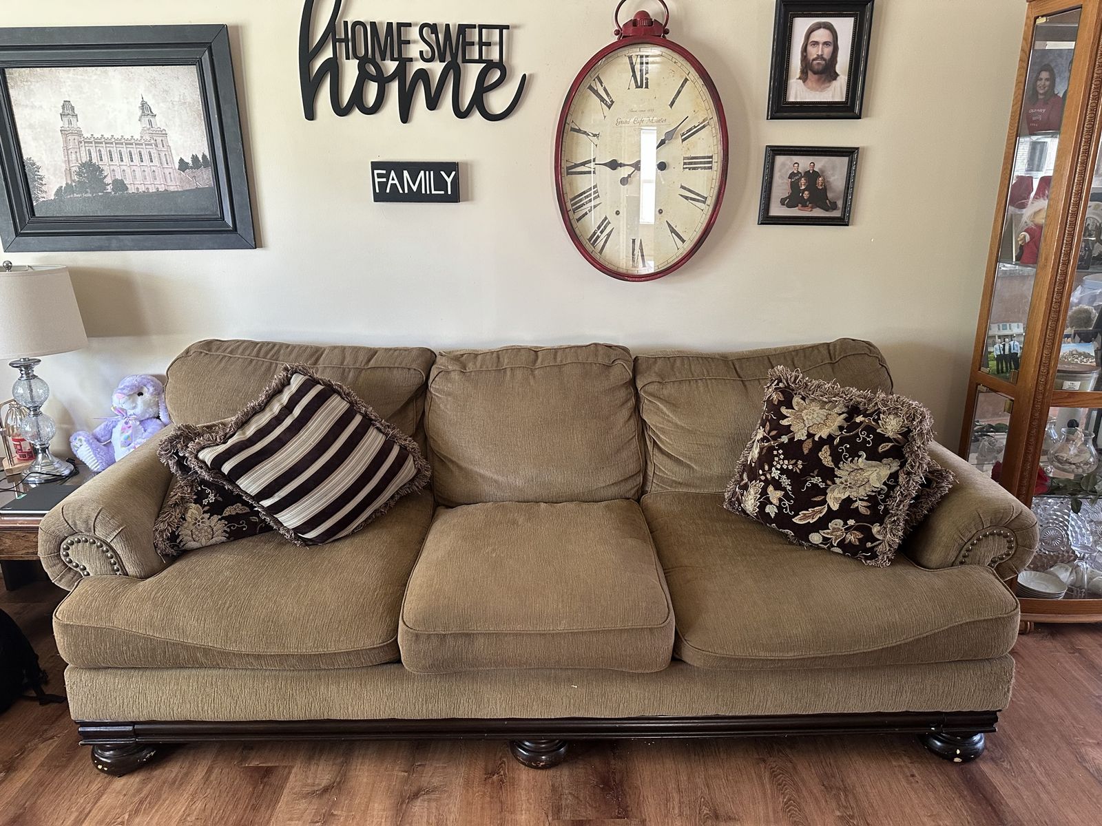 ApplePaySelling a matching sofa and loveseat set in a warm neutral tan color that works with almost any décor. These couches are very comfortable, with deep cushions and sturdy construction—perfect for a living room or family room. Both pieces are in good condition with normal, light wear from use. The fabric is clean and well cared for, and they come with the decorative pillows shown in the photos. Details: Includes sofa + loveseat Neutral tan/brown fabric Rolled arms with nailhead trim Solid wood base and legs Comfortable, supportive cushions From a clean, smoke-free home We’re only selling because we’re updating our furniture.