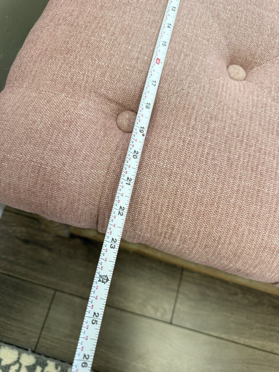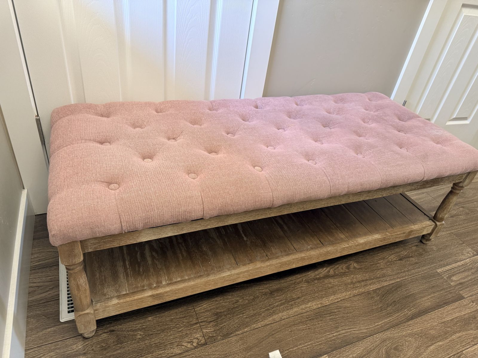 • Approx. 24” wide 54” long (see photos for measurements) • Soft, button‑tufted cushion • Solid wood frame with lower storage shelf • Great for entryways, bedrooms, or living rooms • Smoke‑free home • Gently used and well cared for