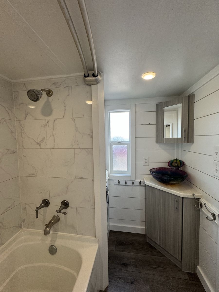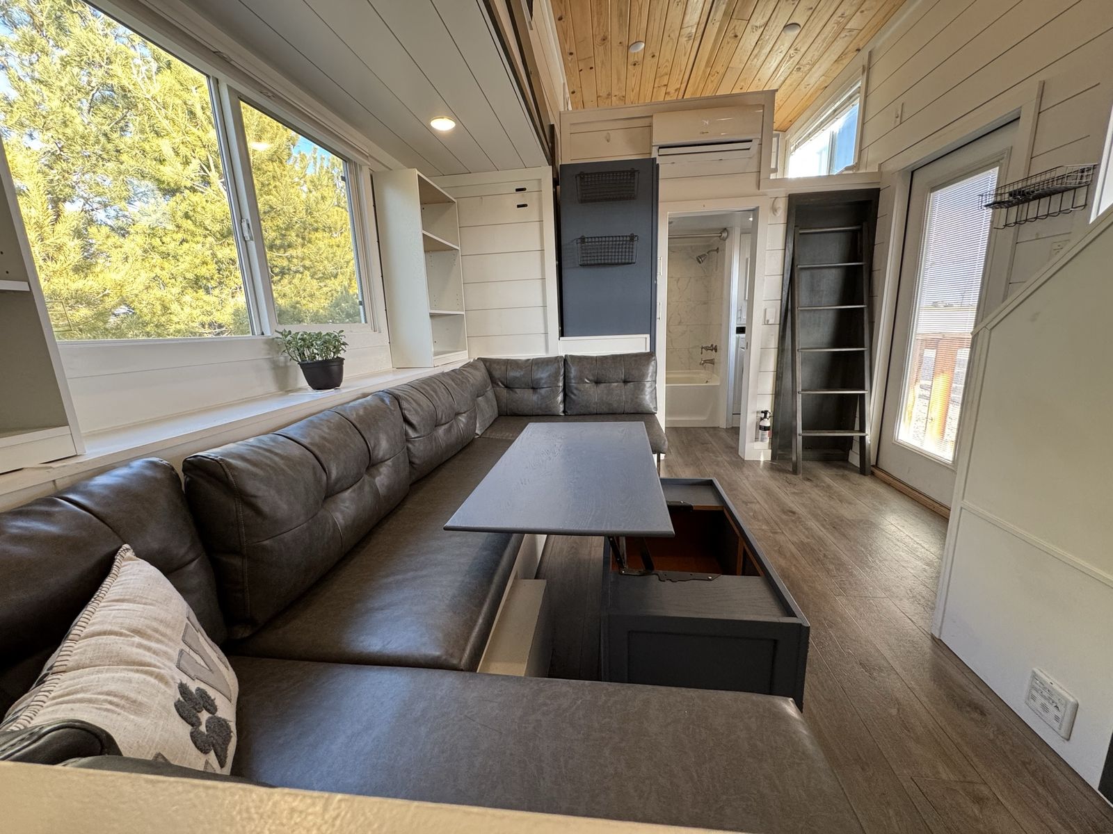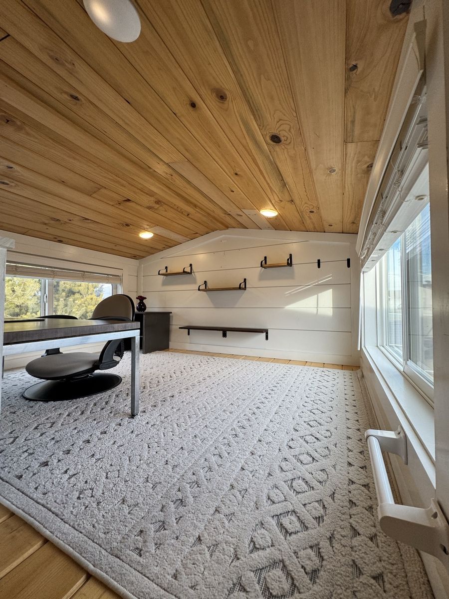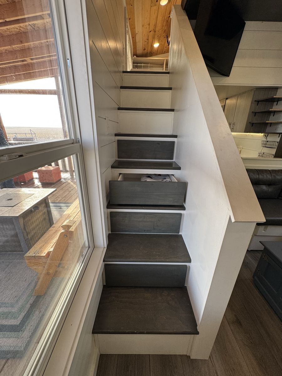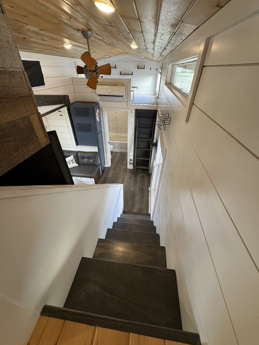 Mini-split heat & AC Gas stove + full kitchen + dishwasher Washer/dryer combo Custom built-in storage drawers in stairs Primary loft bedroom with open closet Second loft (office / guest space/flex space) Full bathroom with tub/shower combo Large covered front porch Convertible built-in couch (includes insert to create additional sleeping space)