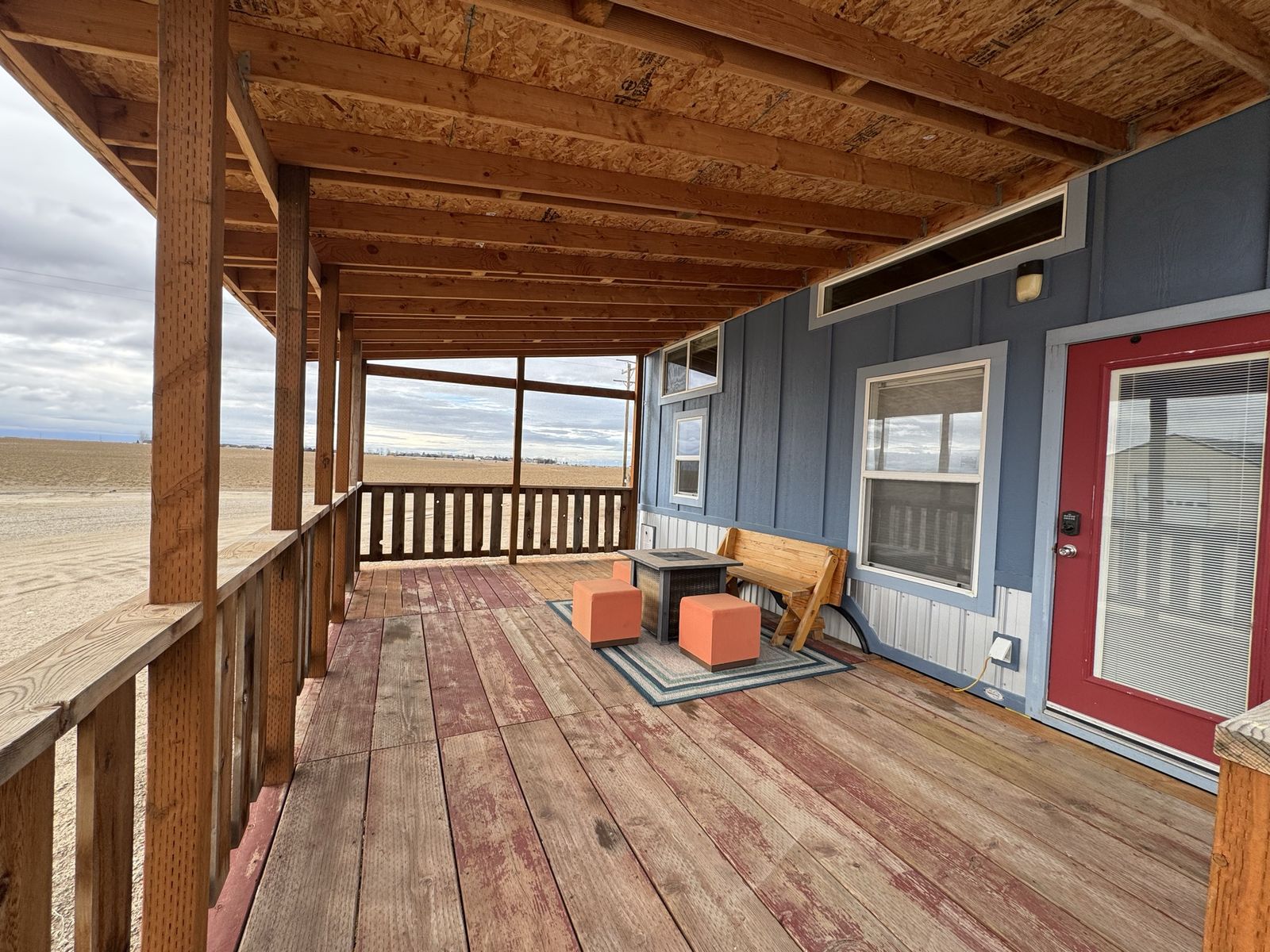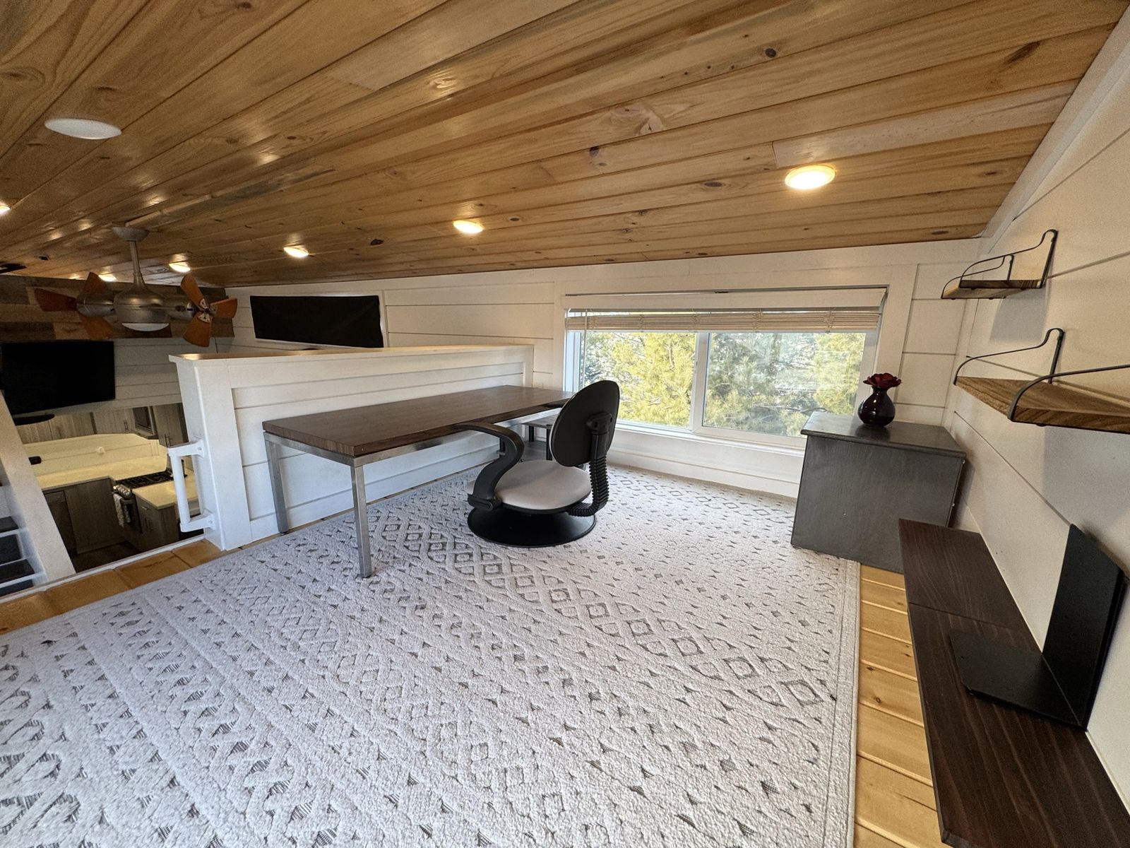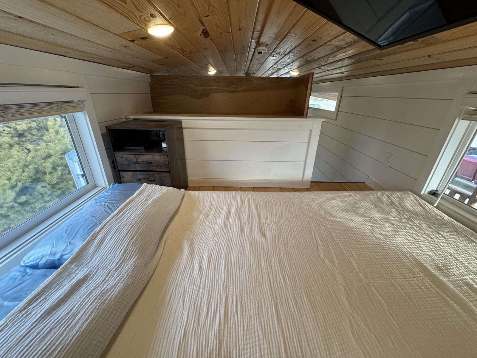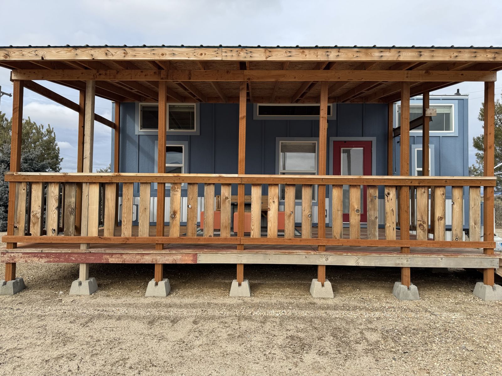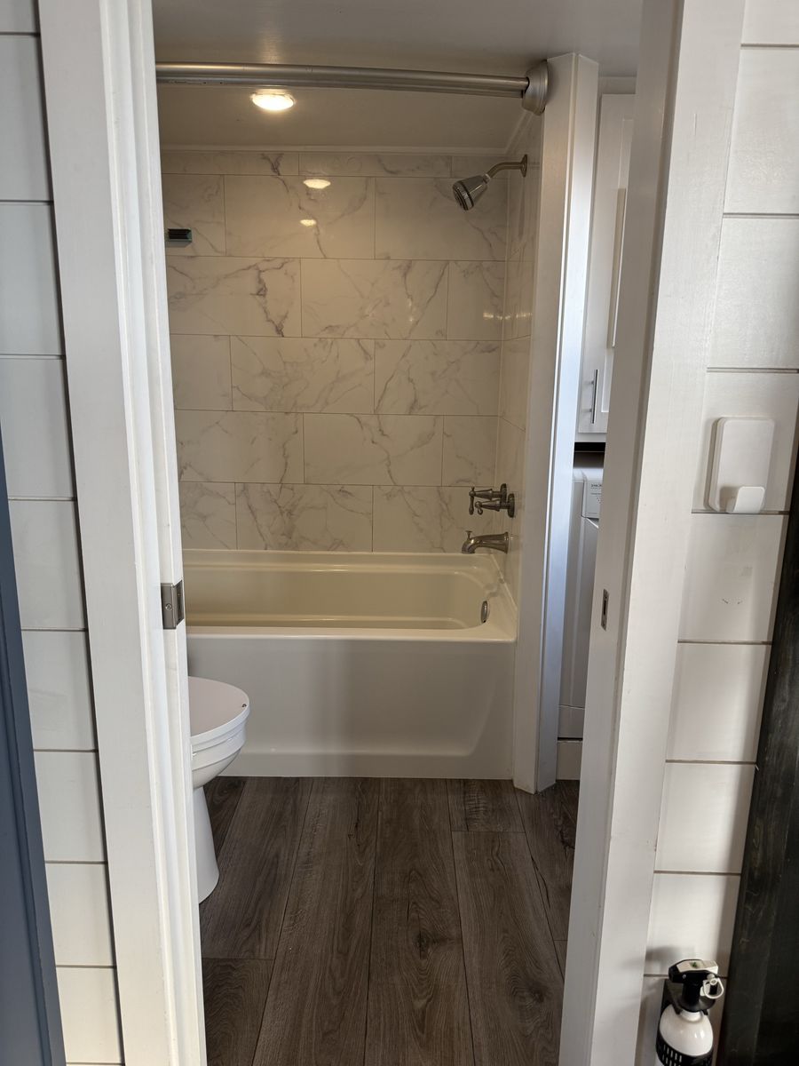 Mini-split heat & AC Gas stove + full kitchen + dishwasher Washer/dryer combo Custom built-in storage drawers in stairs Primary loft bedroom with open closet Second loft (office / guest space/flex space) Full bathroom with tub/shower combo Large covered front porch Convertible built-in couch (includes insert to create additional sleeping space)
