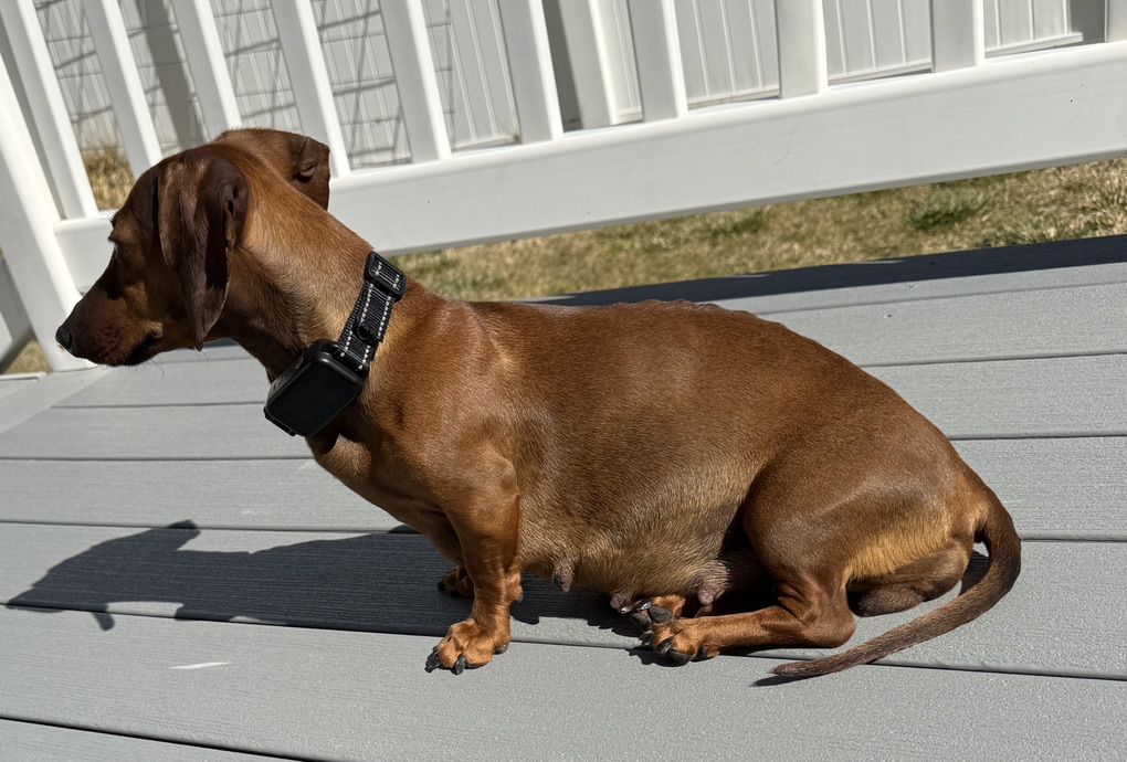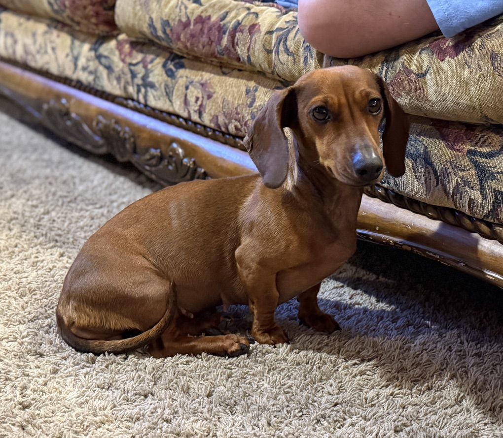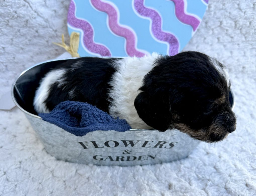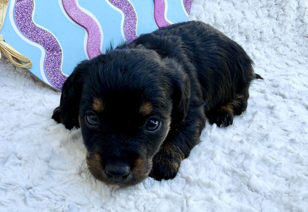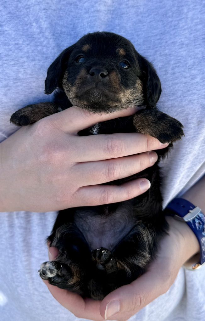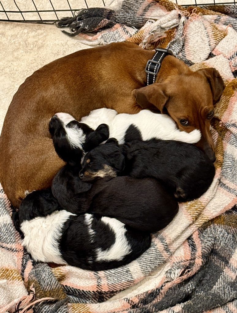 Beautiful specialty breed of miniature dachshund and teacup poodle. Mom is a miniature, red, short haired dachshund. Dad is a black and white, party, teacup poodle. Mom weights 10 lbs and dad weighs 4 lbs.