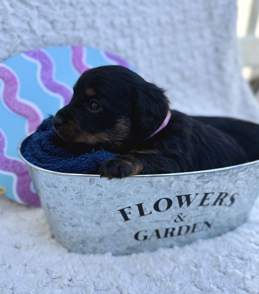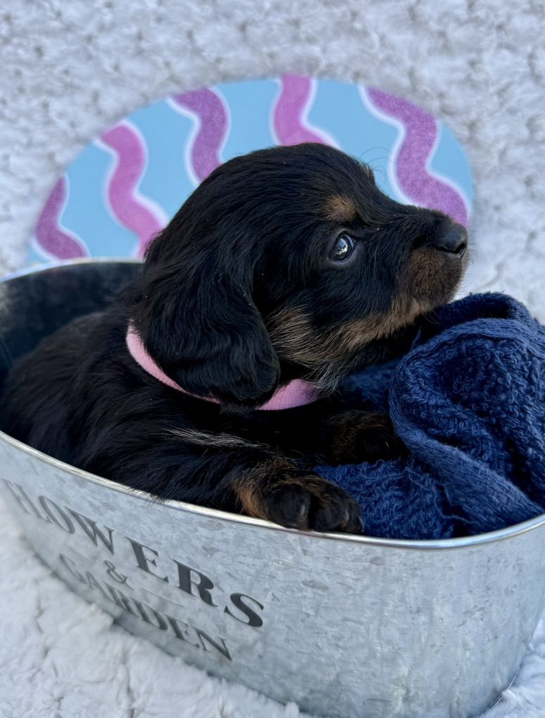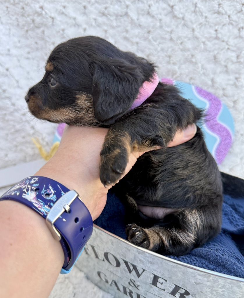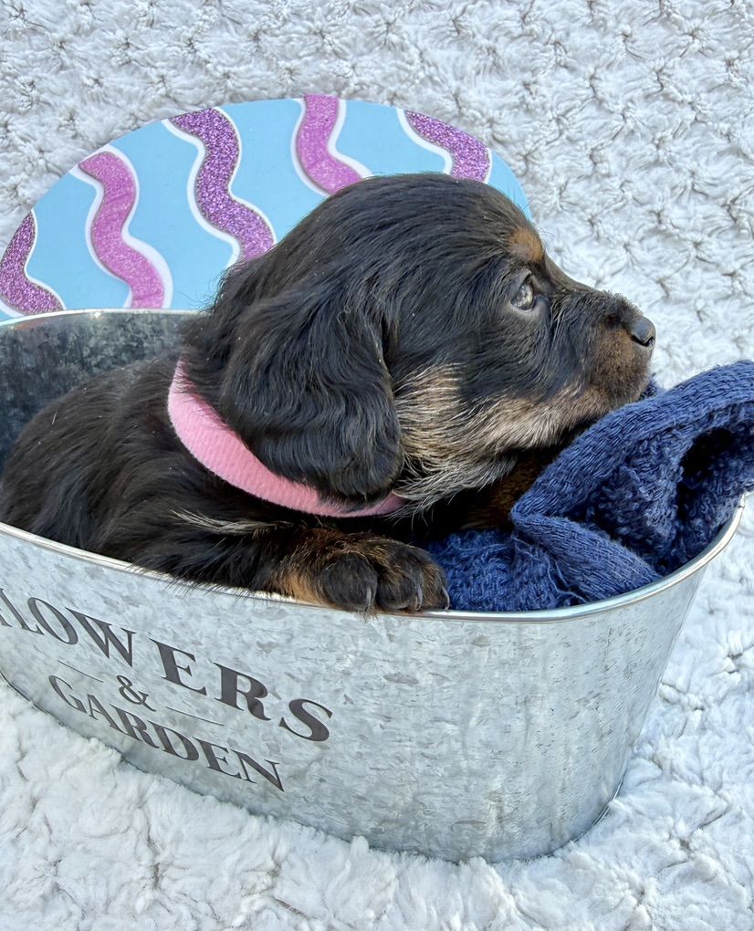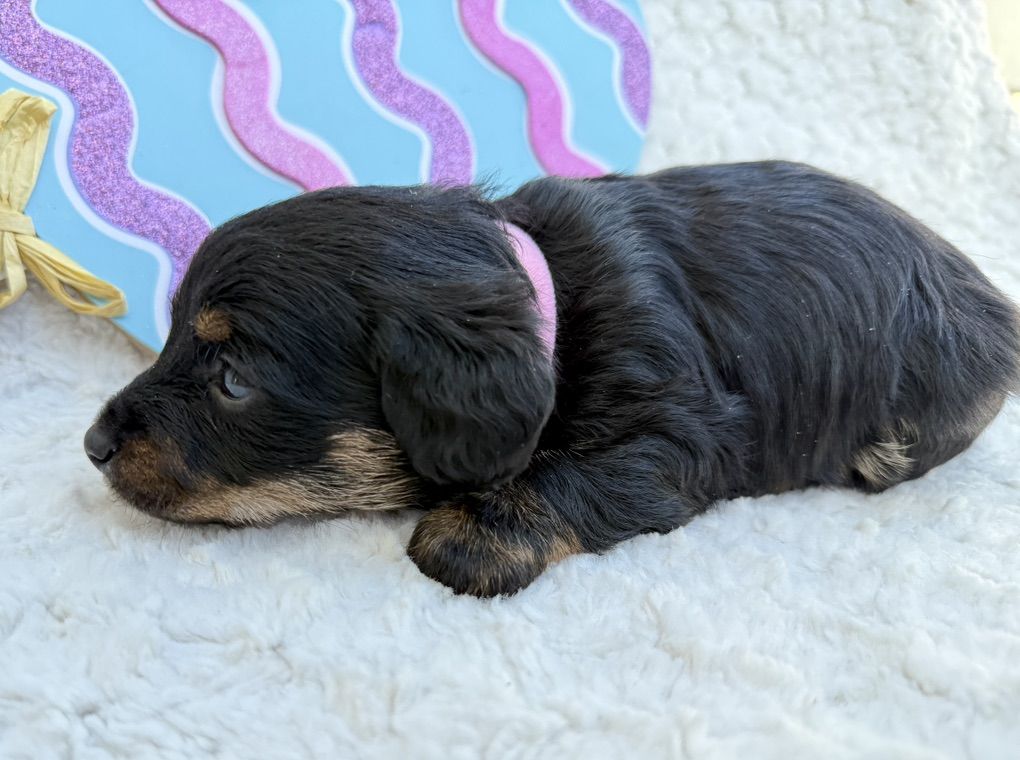 Girl 1: pink collar: mostly black with cute watches of brown and white she has a tiny white tuxedo stripe on her chest cute brown on her face and legs puppies have long hair