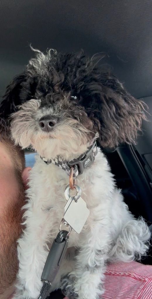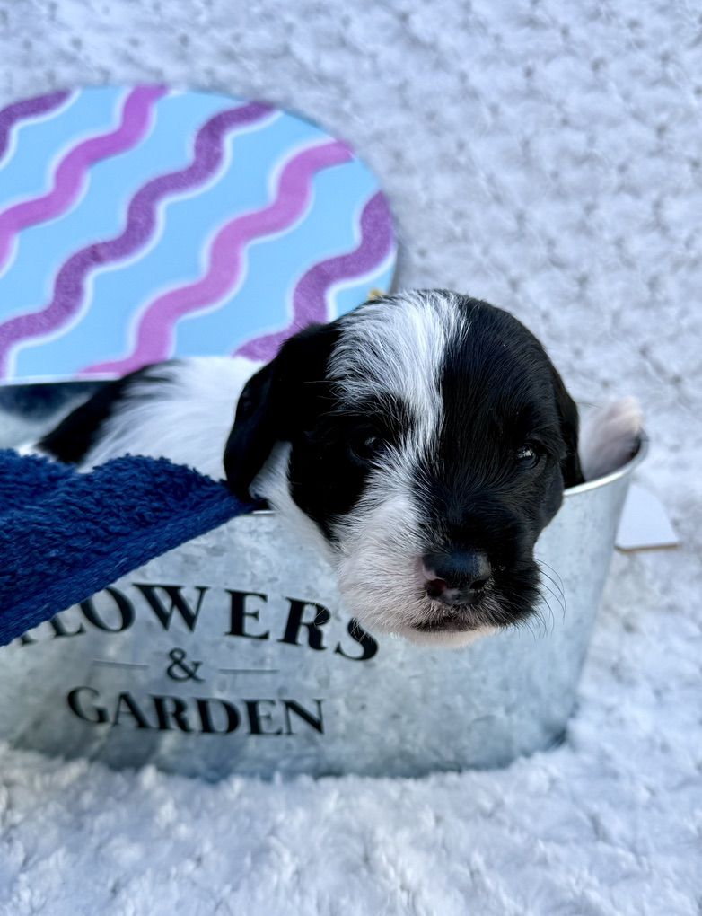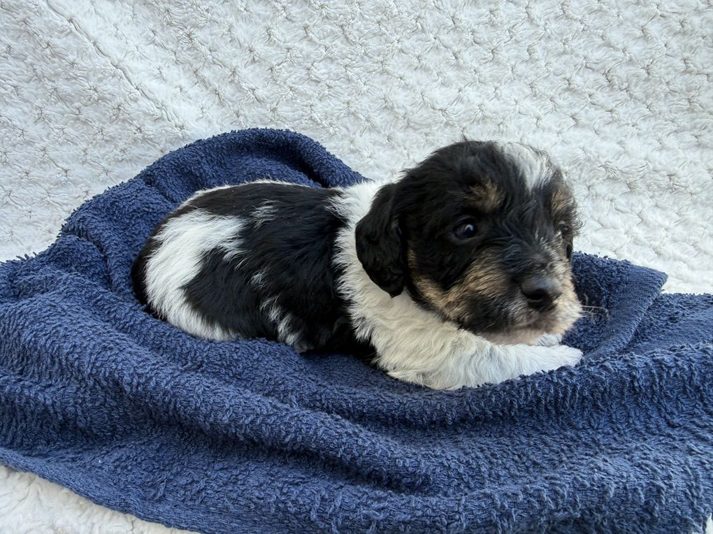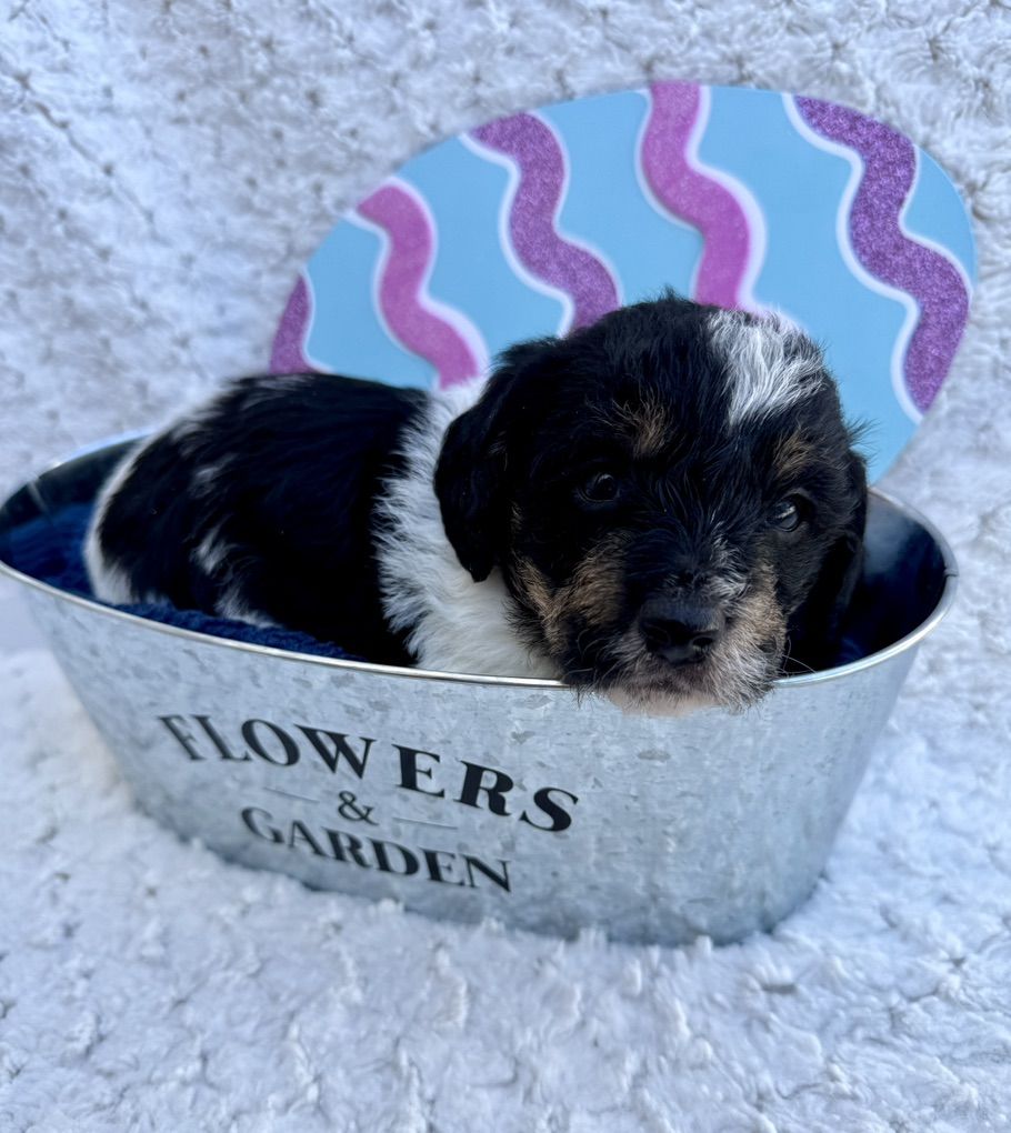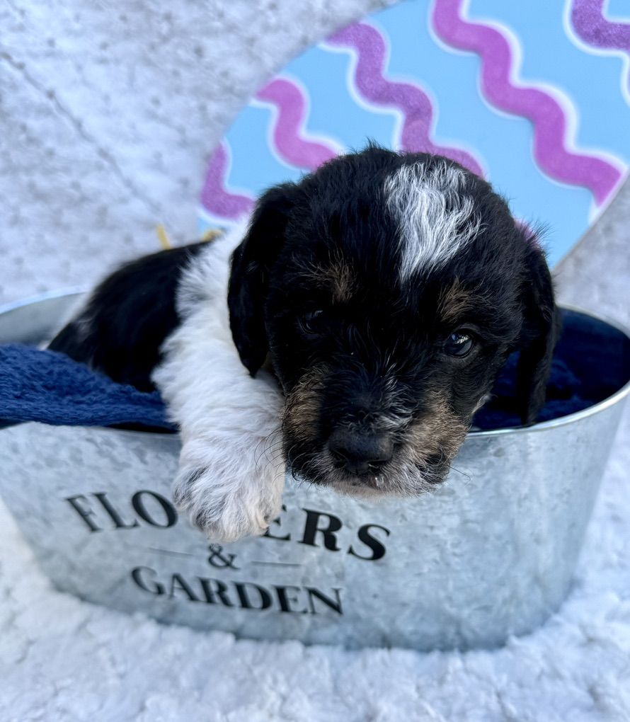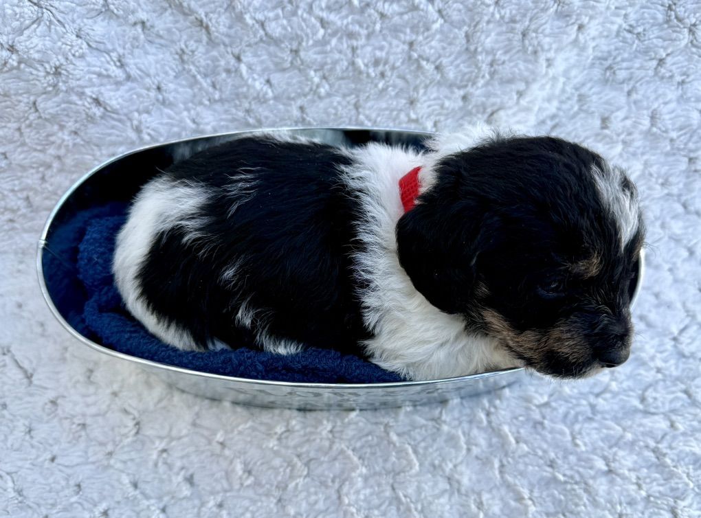 Boy 2: red collar: tri color. black and white with some brown/tan mixed in. His face with the tricolor is very cute. He has more of the curly poodle hair.
