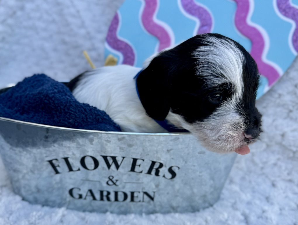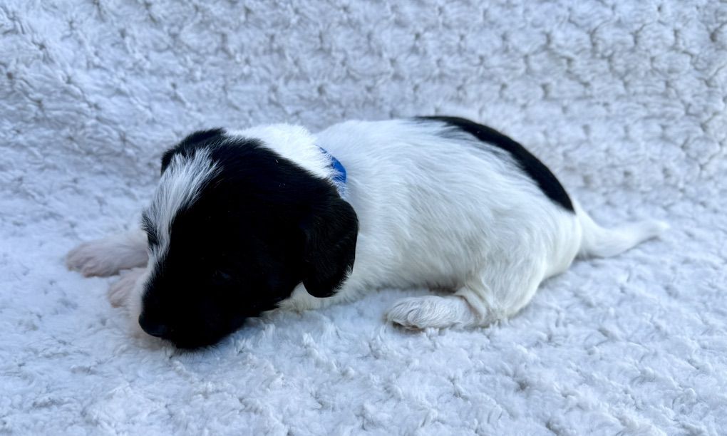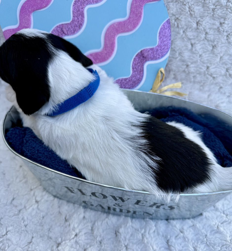 Boy 1: blue collar: black and white. His cute face is half and half white and black. Body is mostly white and has a cute black spot on his back like his dad.