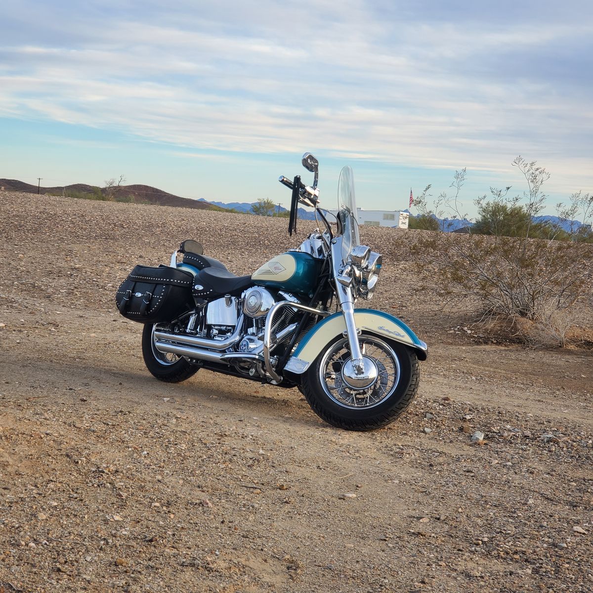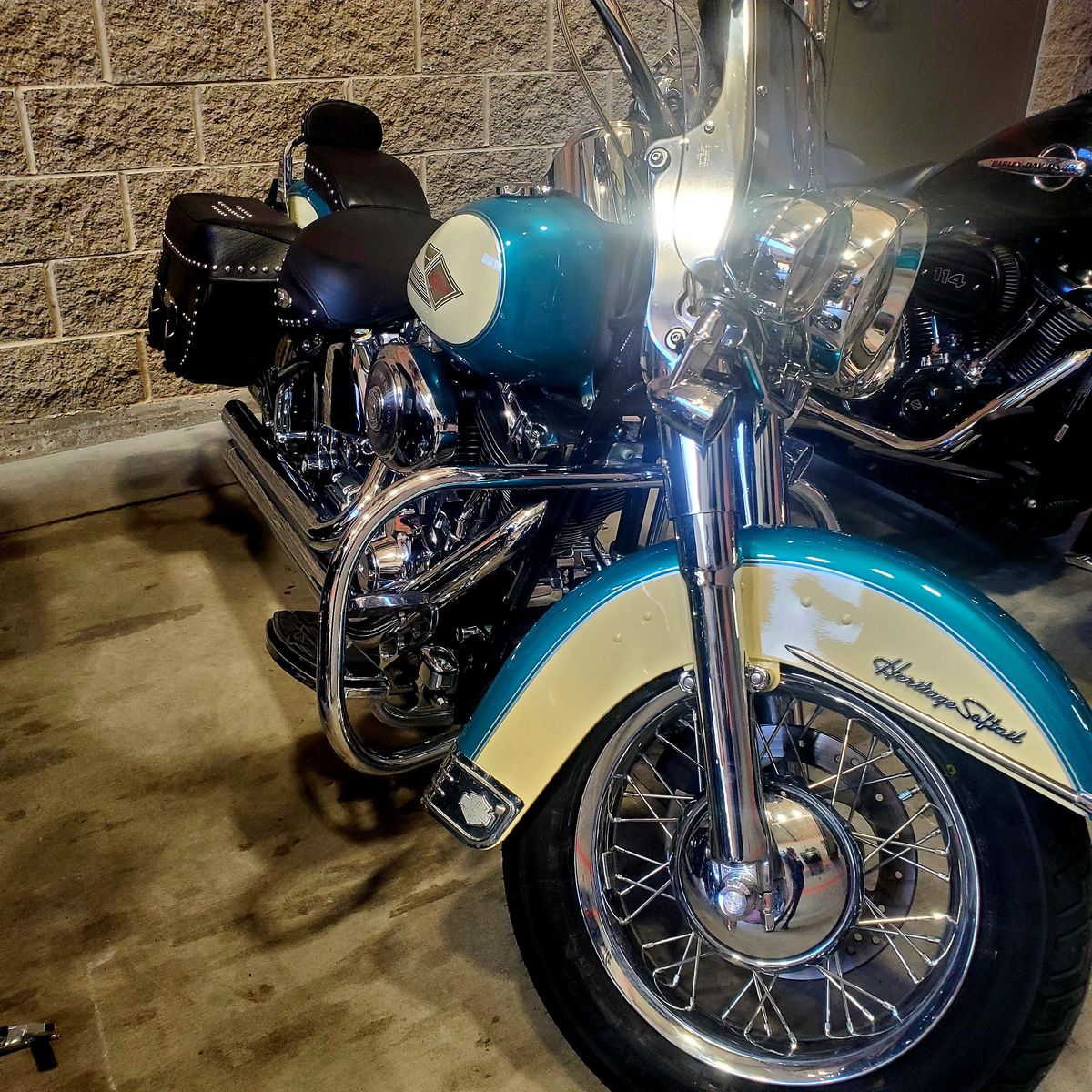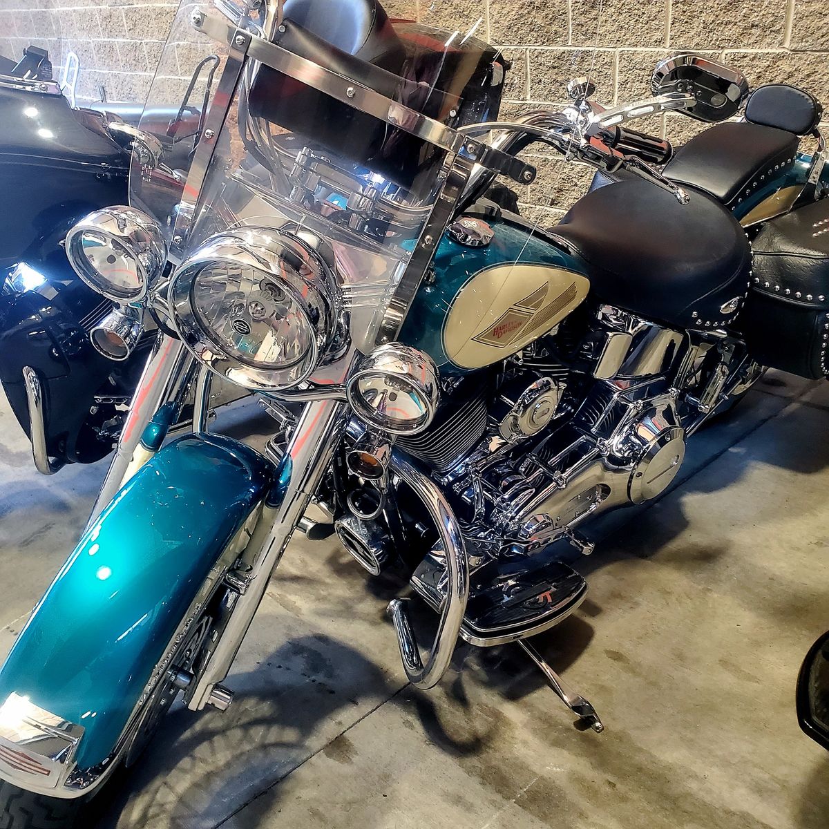 Beautiful 2004 Heritage Softail Classic in a standout teal and white two-tone. This bike has a clean, classic look with lots of chrome and a strong road presence.