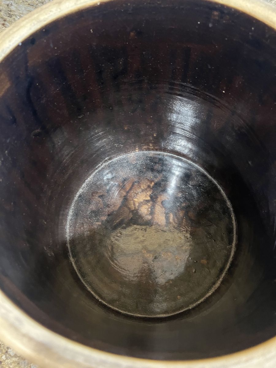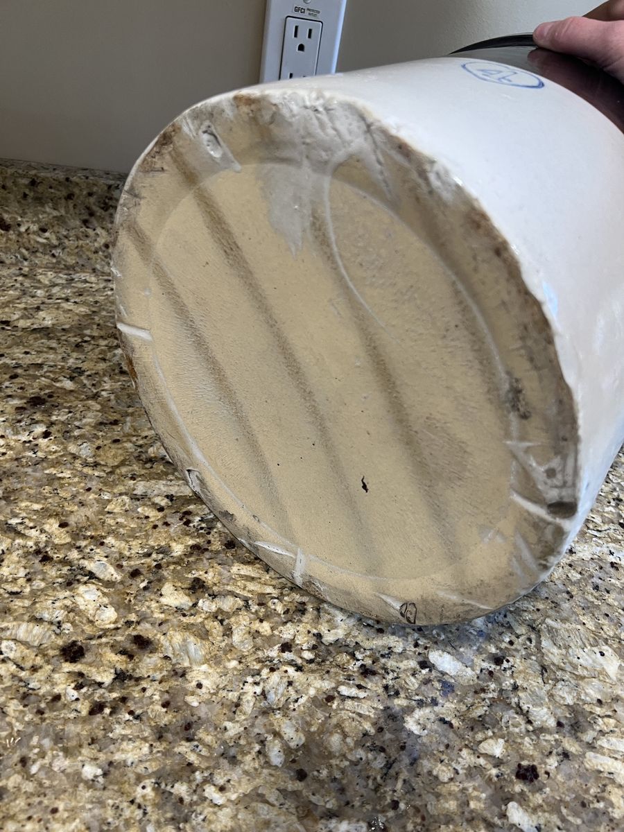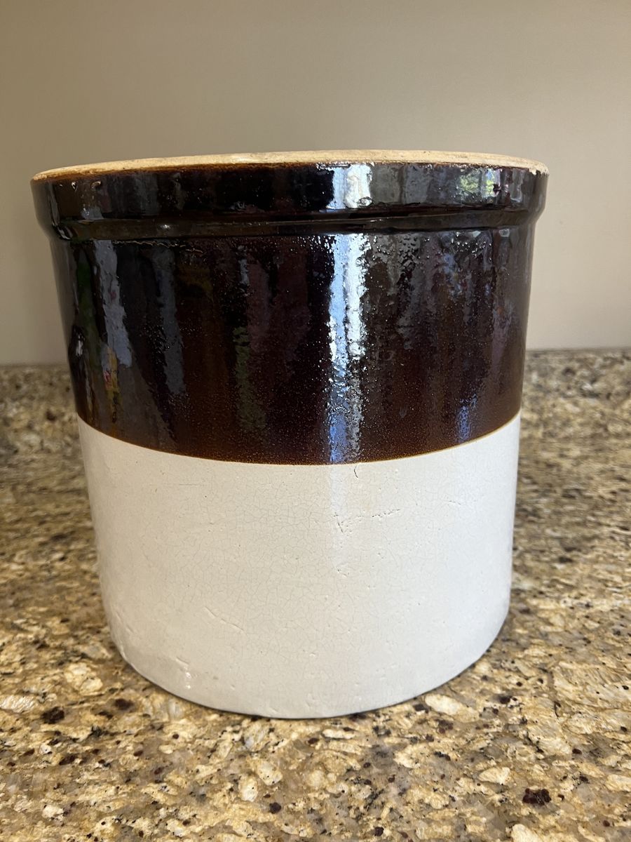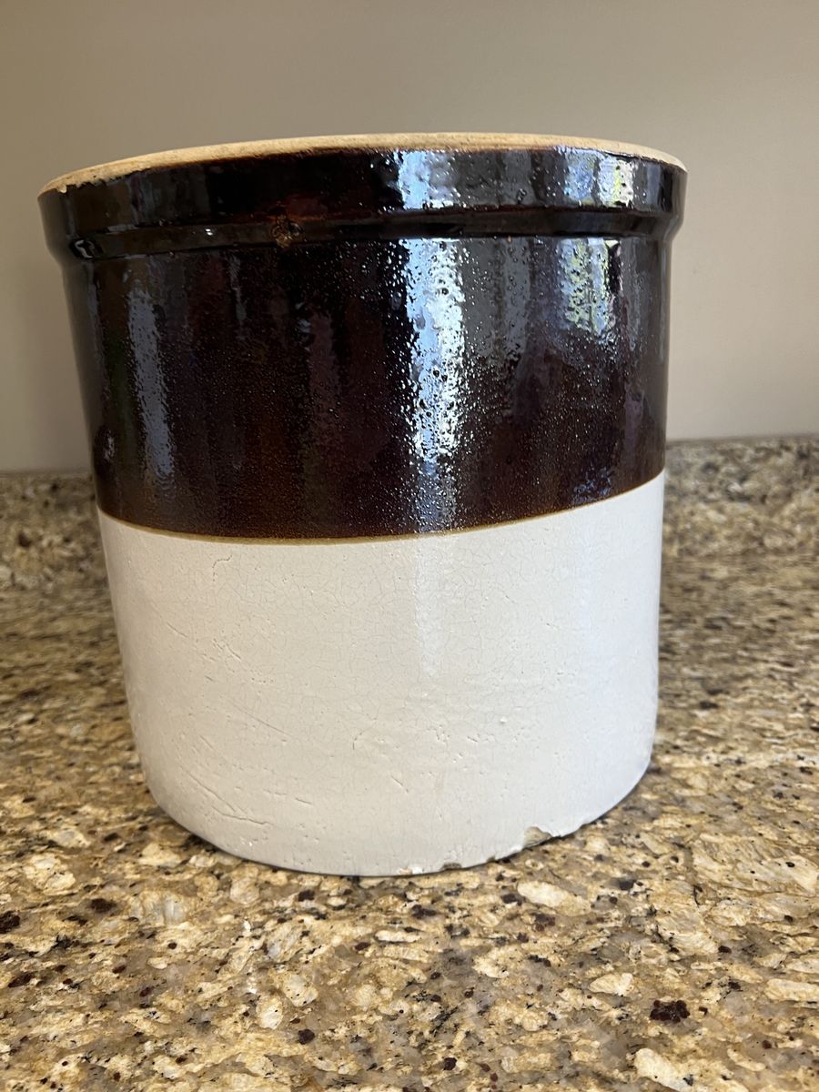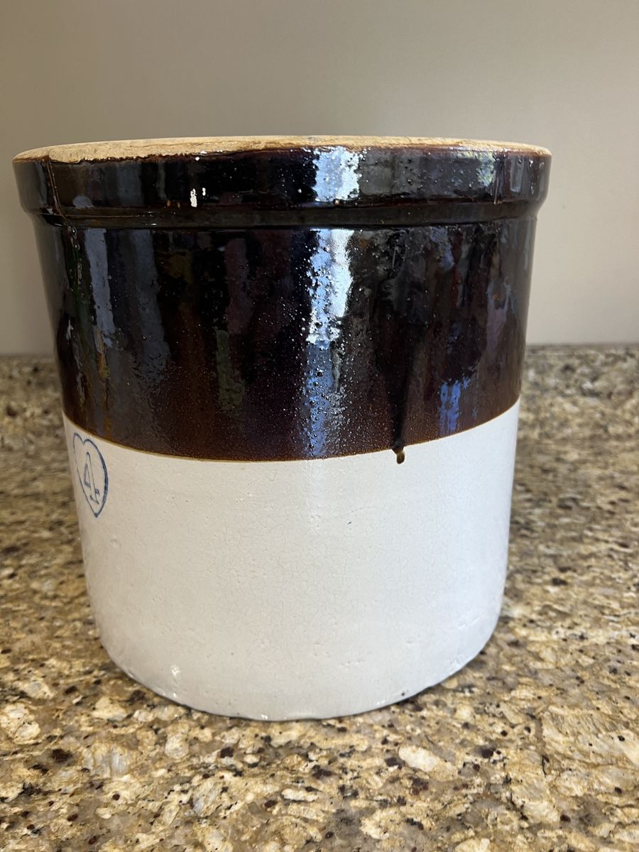 VenmoFour gallon vintage stoneware crock firm the late 1800s-early 1900s. Made by Burley and Winter Pottery indicated by the blue number 4 inside a heart shape. Features a white body with a glossy brown glazed top section. In great condition. Has one small chip along the bottom shown in photos. 11 inches tall 12 inches across. Pick up in Draper. Cash or Venmo. $200.