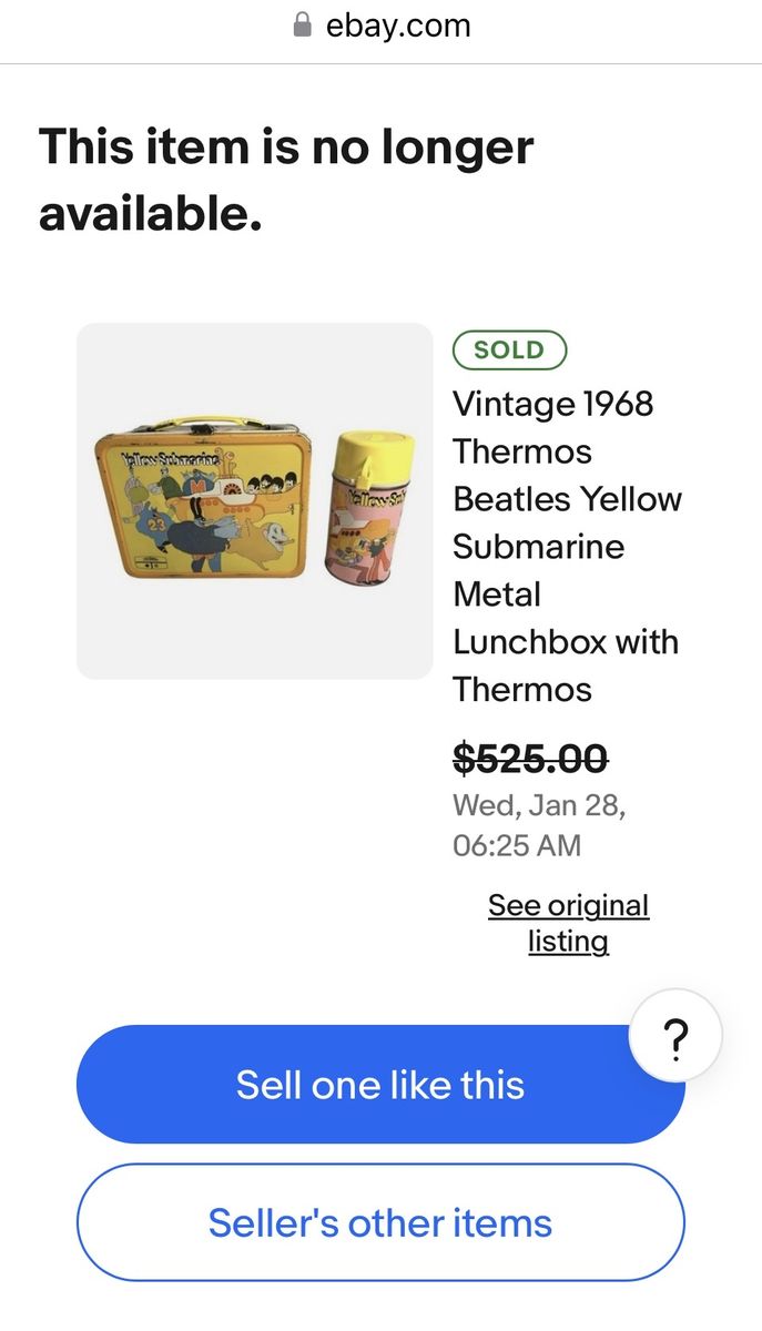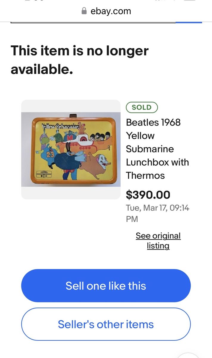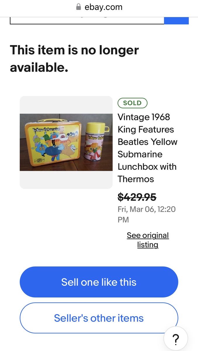 VenmoThis super fun Beatles Yellow Submarine metal lunch box with the thermos. The box is in great shape with only a few small blemishes. The thermos has the lid cup but not the screw in cap. These have sold on eBay for $500+. Pick up in Draper. Pet and smoke free home. Cash or Venmo. $375. listed for a client