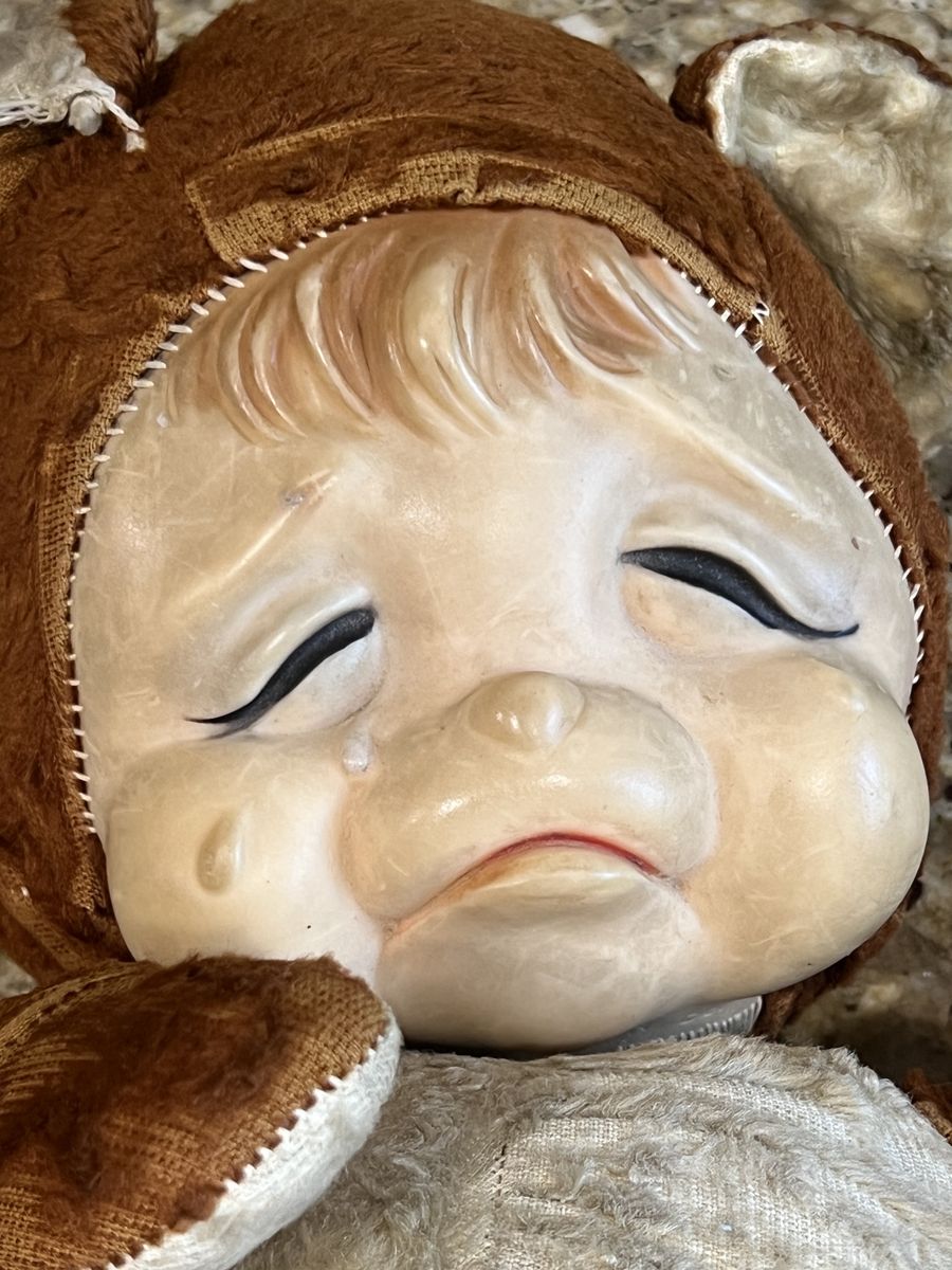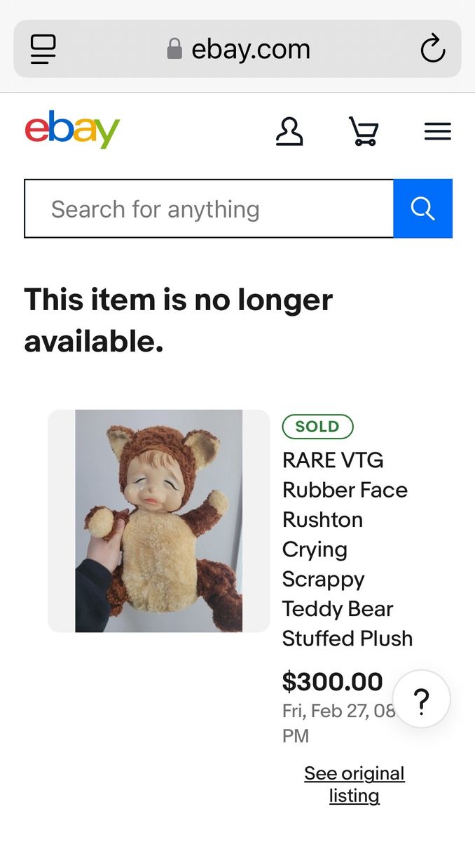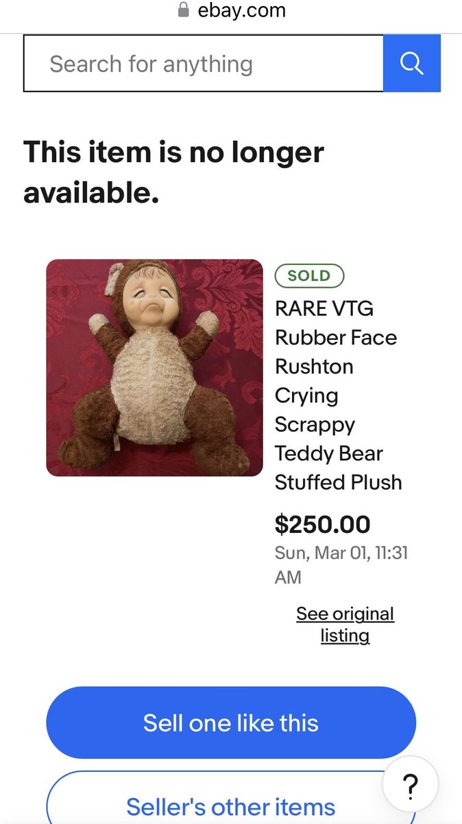 VenmoThis vintage plush is a Rushton Star Creation Crying Bear, a collectible toy originally produced in the 1950s. These dolls are well-known for their unique "nursery kitsch" aesthetic, featuring a distinctive rubber face with exaggerated emotional expressions, such as this one's sad, crying face with molded tears. The Rushton Company produced this bear in the 1950s and it is often referred to by collectors as the "Crying Bear" or "Scrappy Bear". These are considered rare and highly sought after by vintage toy collectors. This bear is 17 inches tall and has the wear you’d expect from a 70-year-old toy. There are some bare spots where the “fur” has worn off and the stitches are showing on the back seams. The seam on one ear has opened. See photo. The tag has been removed. This bear has sold on eBay for $300! Pick up in Draper. From pet and smoke free home. Cash or Venmo. $250. listed for a client