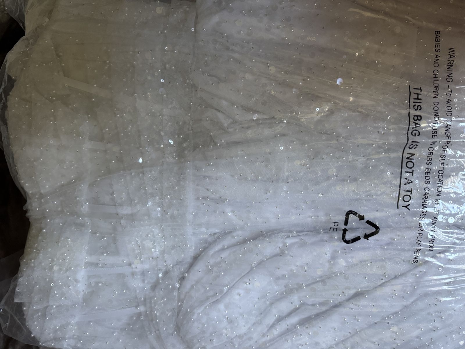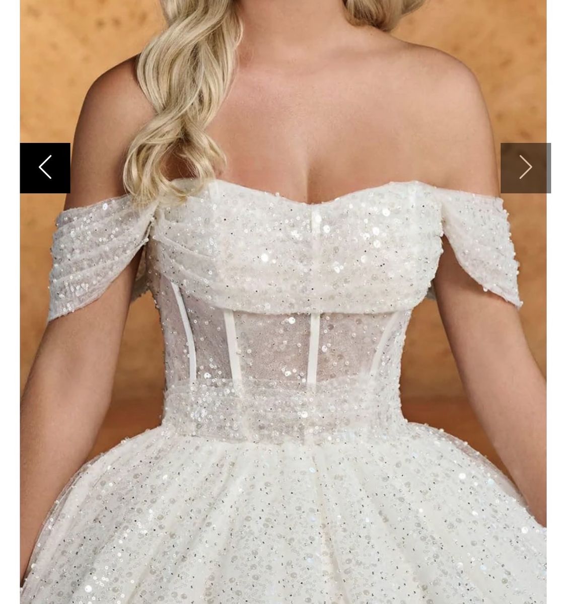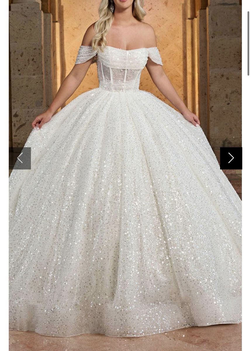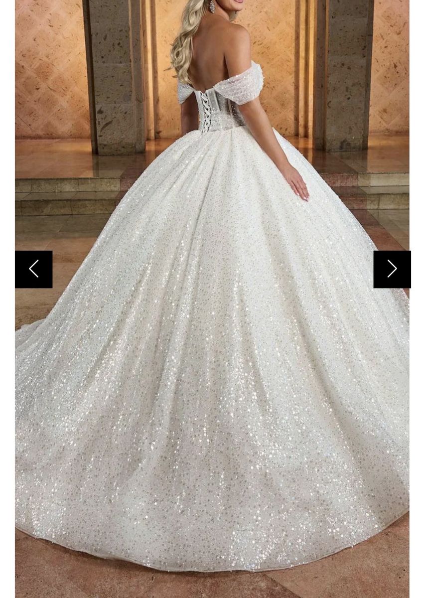 New Rachel Allan RB6134 - Off-Shoulder Beaded Tulle Gown size 8. features a semi-sheer bodice with corset boning, a pleated midriff, and a cowl neckline. This sparkly wedding ballgown has off-the-shoulder draped sleeves and a mid-rise lace-up back, complete with a wide horsehair hem for added firmness and an elegant court train. Retail for this dress is over $1,500.