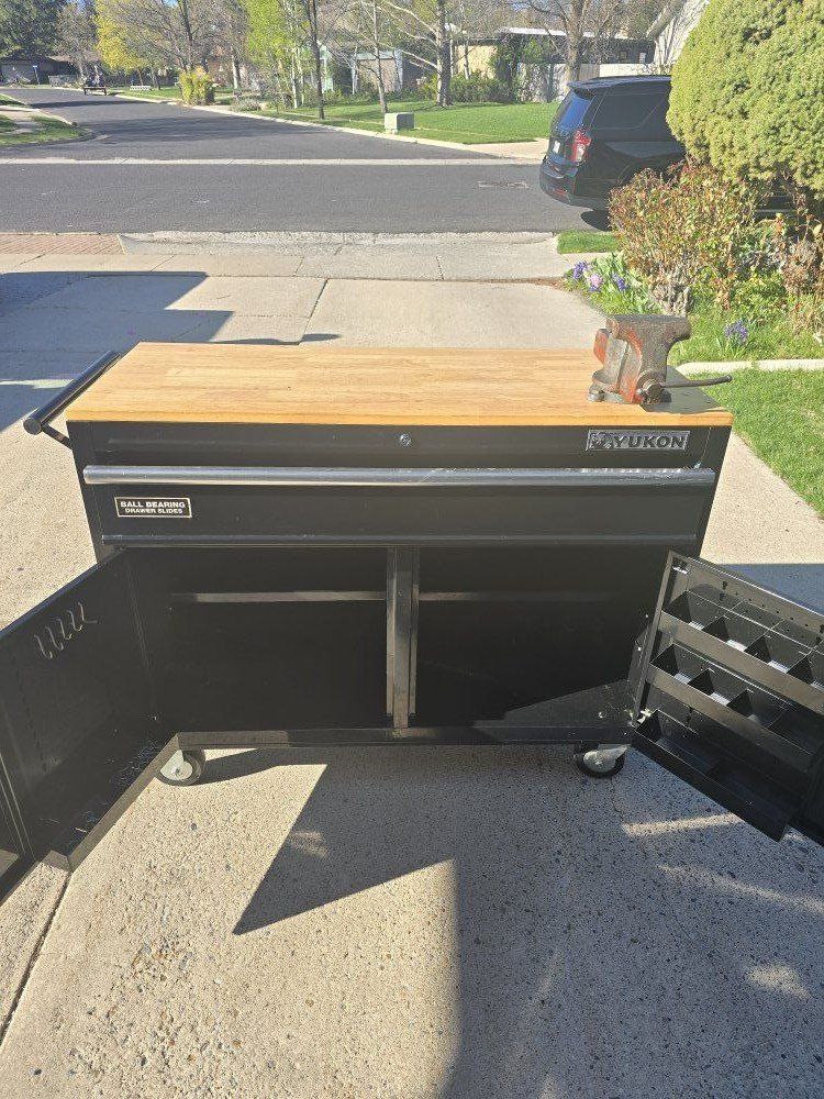 This YUKON® 46 in. Mobile Workbench has a two-door cabinet for bulk storage. Made with heavy gauge steel, heavy duty drawer slides and a high load capacity, the mobile workstation has a solid wood top with a large surface area. The large capacity drawer has ball-bearing slides for smooth action. The bulk storage cabinet has plenty of space for large tools and supplies.