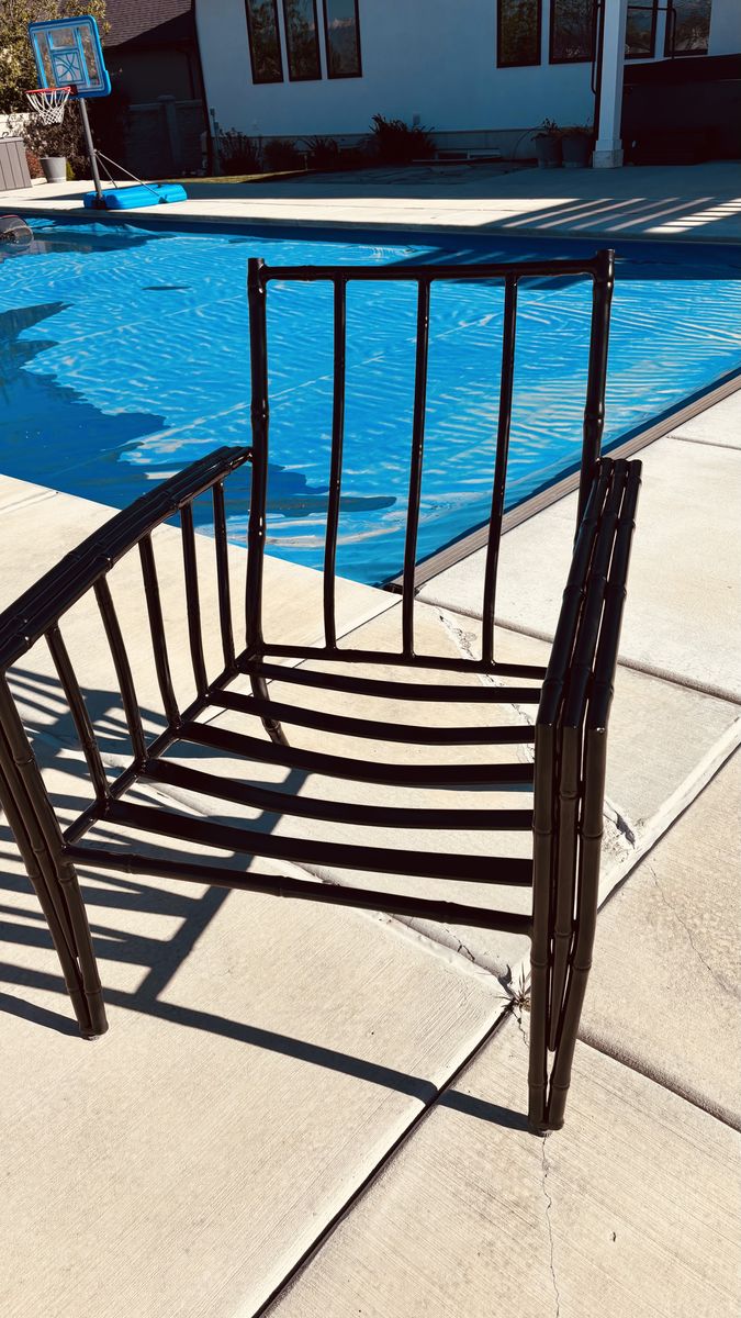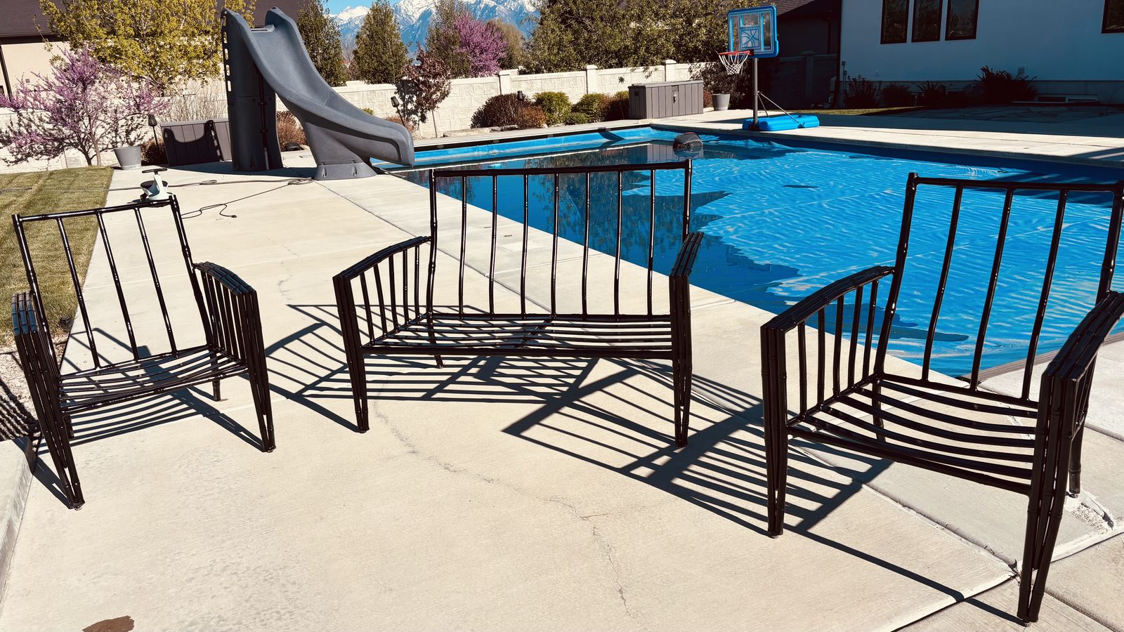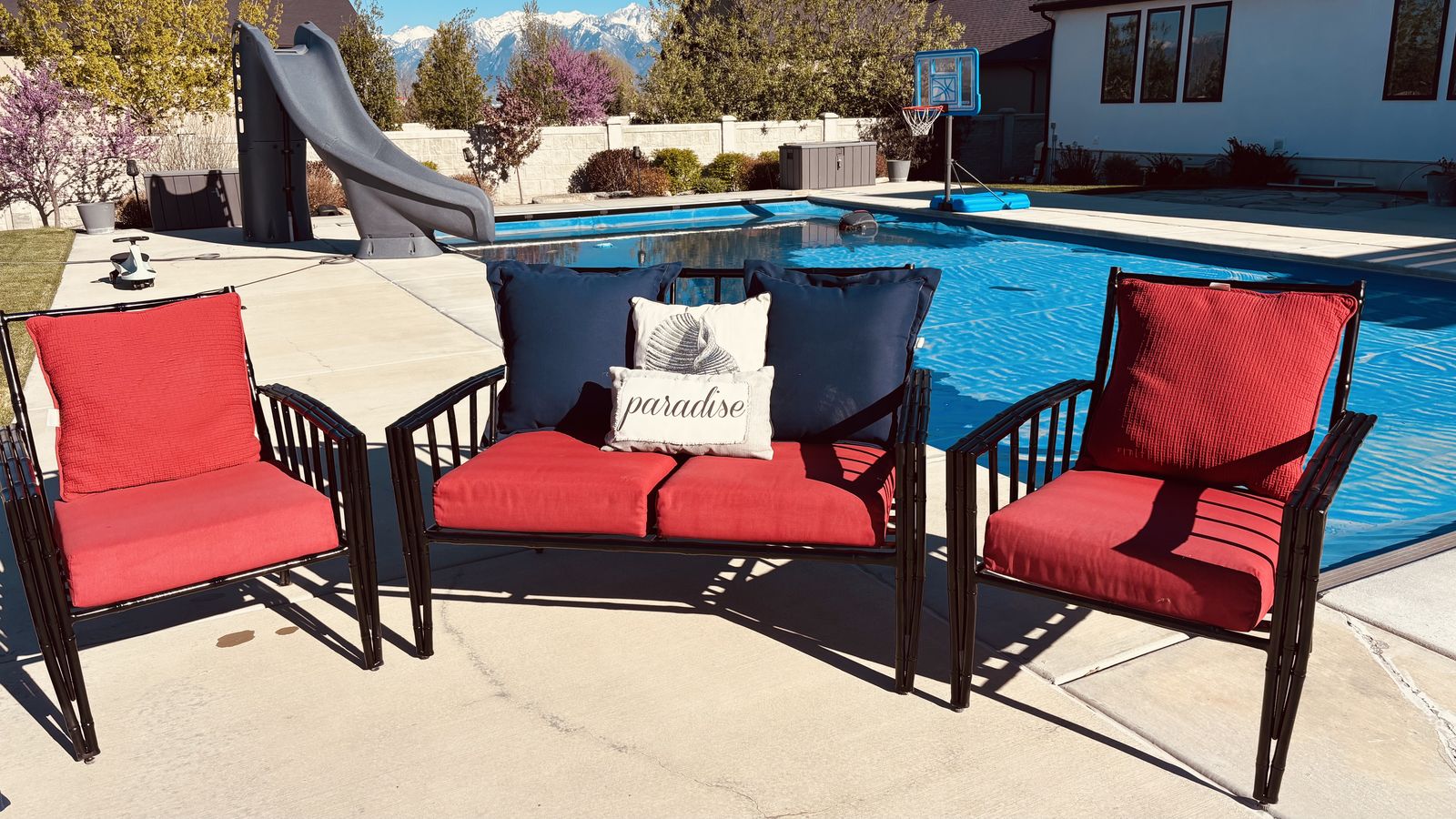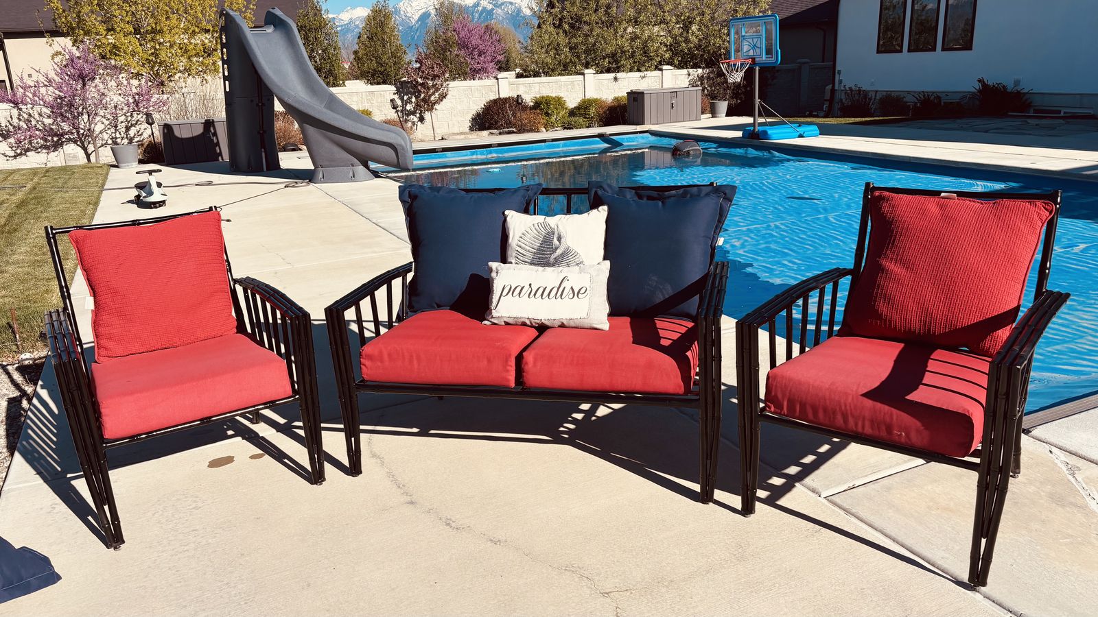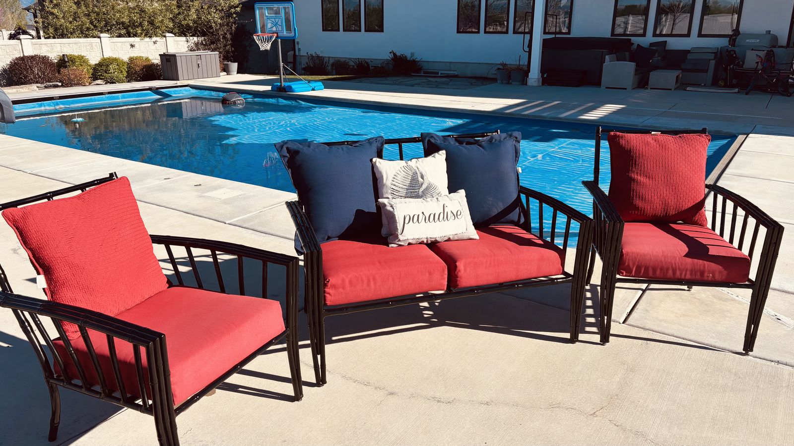 Black chairs two and a loveseat, red and blue cushions.