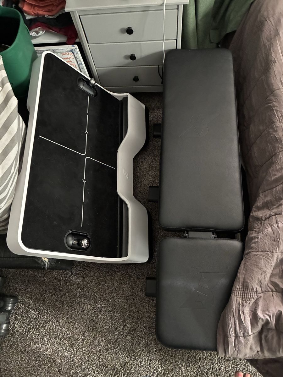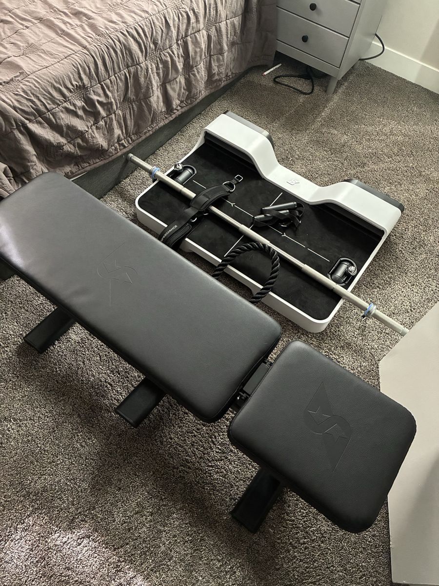 ApplePaySuper compact home gym. Resistance to 200lbs. App has a huge library of workouts. I love it. In would like to just upgrade to the Gym Monster. Comes with barbell, rope, handles, ankle straps. Adjustable bench. And a sweet little finger strap that allows you to increase weight with the touch of a finger.