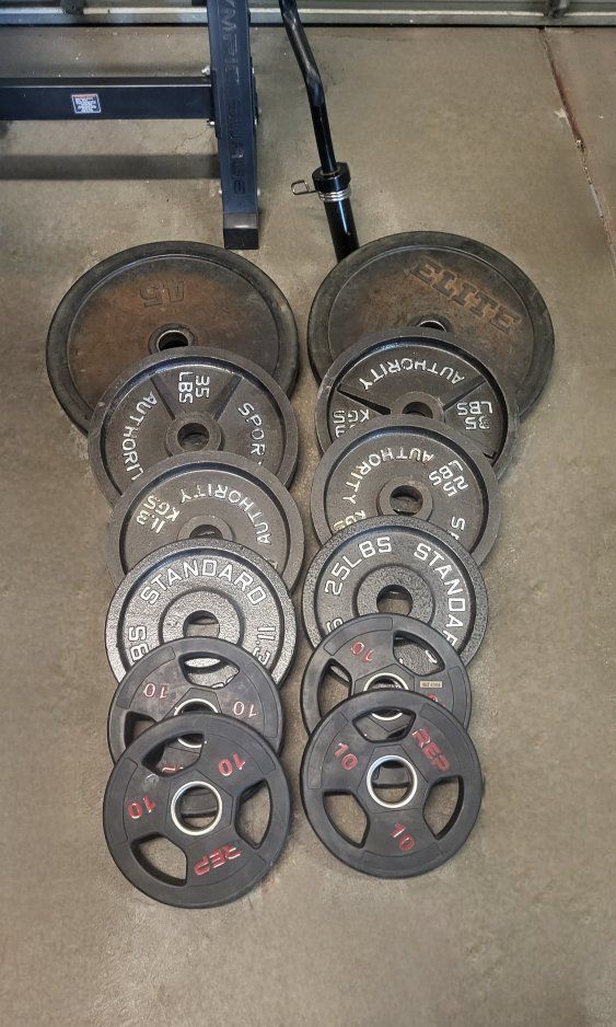 Adjustable bench with leg extension and preacher curl attachment, a 7 ft about 34 pound barbell a 20 pound curl bar and 335 pounds of Olympic weights, the 45s have some damage on the rubber but it doesn't affect them, selling all together for $320 cash thanks for looking