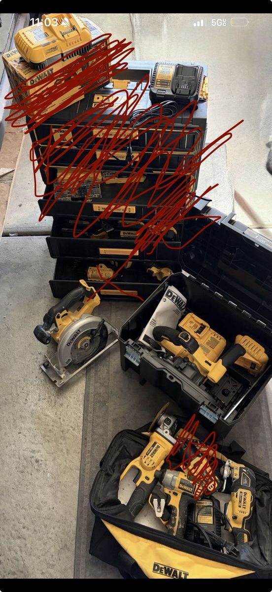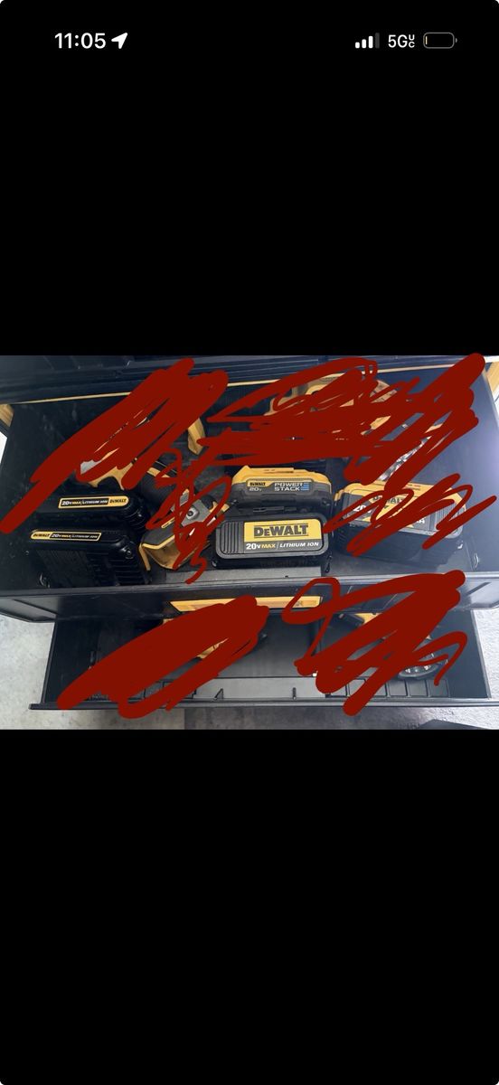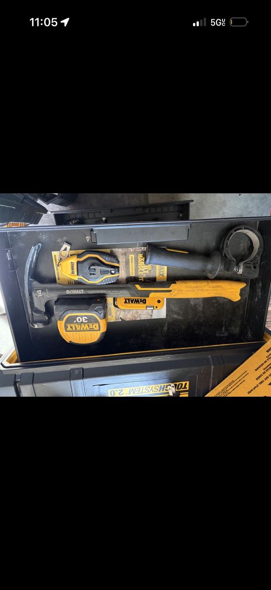 VenmoPRICE IS NEGOTIABLE IF U ONLY NEED ONE ITEM OR TOOL WE CAN NEGOTIATE PRICE WHOLE SET THO IS $1000 also negotiable the 20v 4 AH yellow battery has been sold and the top tool box! Description has been updated Includes 3 impact guns Hammer drill driver Multi tool oscillator 6 boxes of bits 6 batteries 2 battery chargers 2 led lights 3 saws (2 brand new) An 18 GA shear attachment Tape measure Hammer Dewalt knife Grinder Dewalt bag and 2 dewalt stackable tool boxes