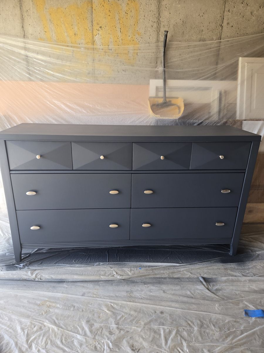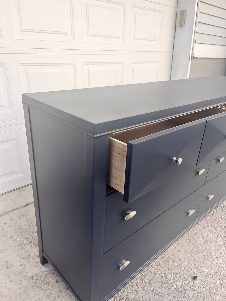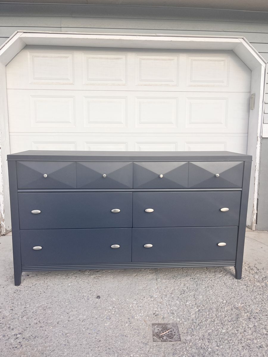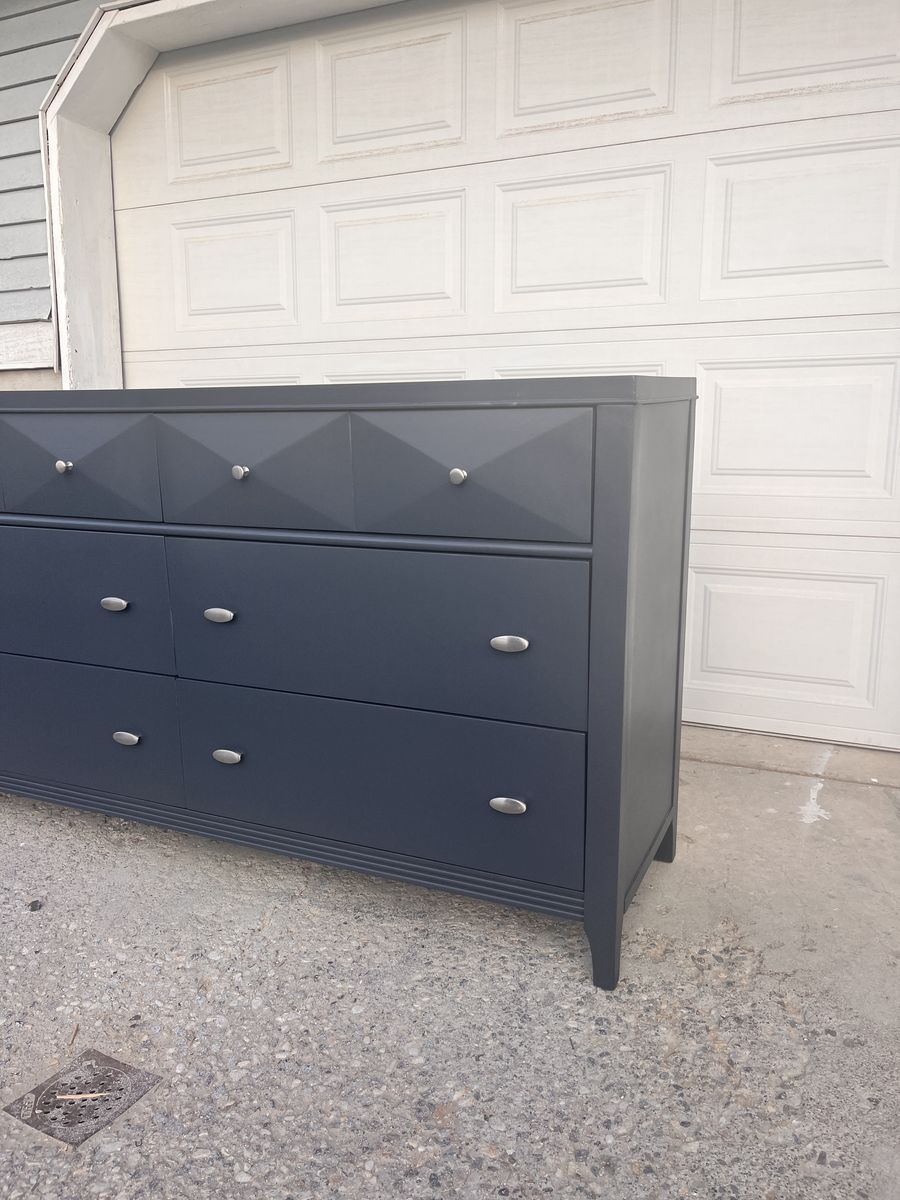 VenmoModern 6-drawer dresser finished in a sleek dark blue with silver hardware. The top drawers feature a unique geometric design that gives the piece a stylish, contemporary look.