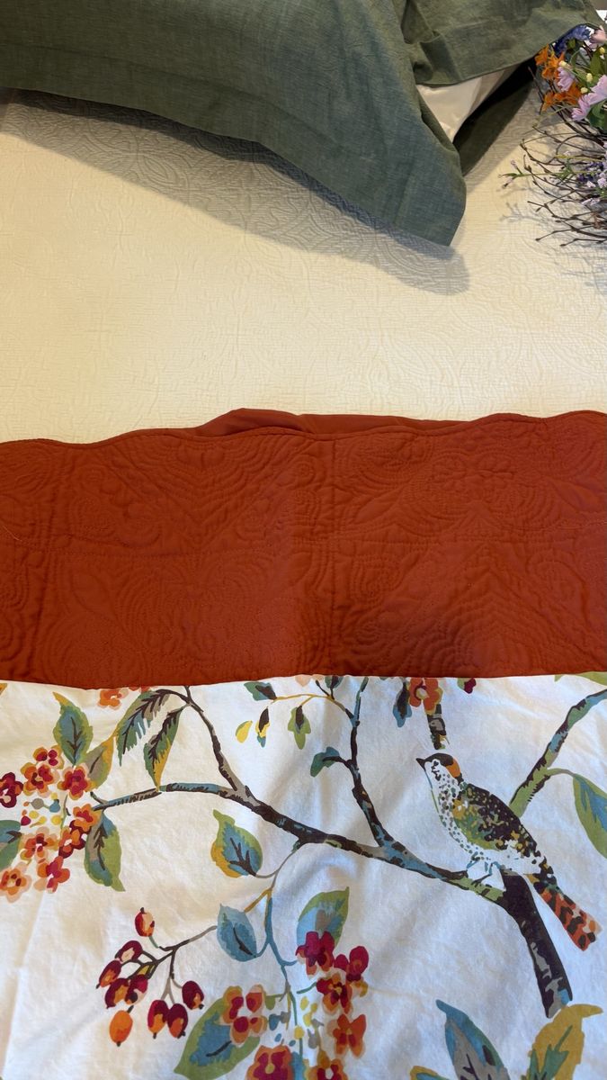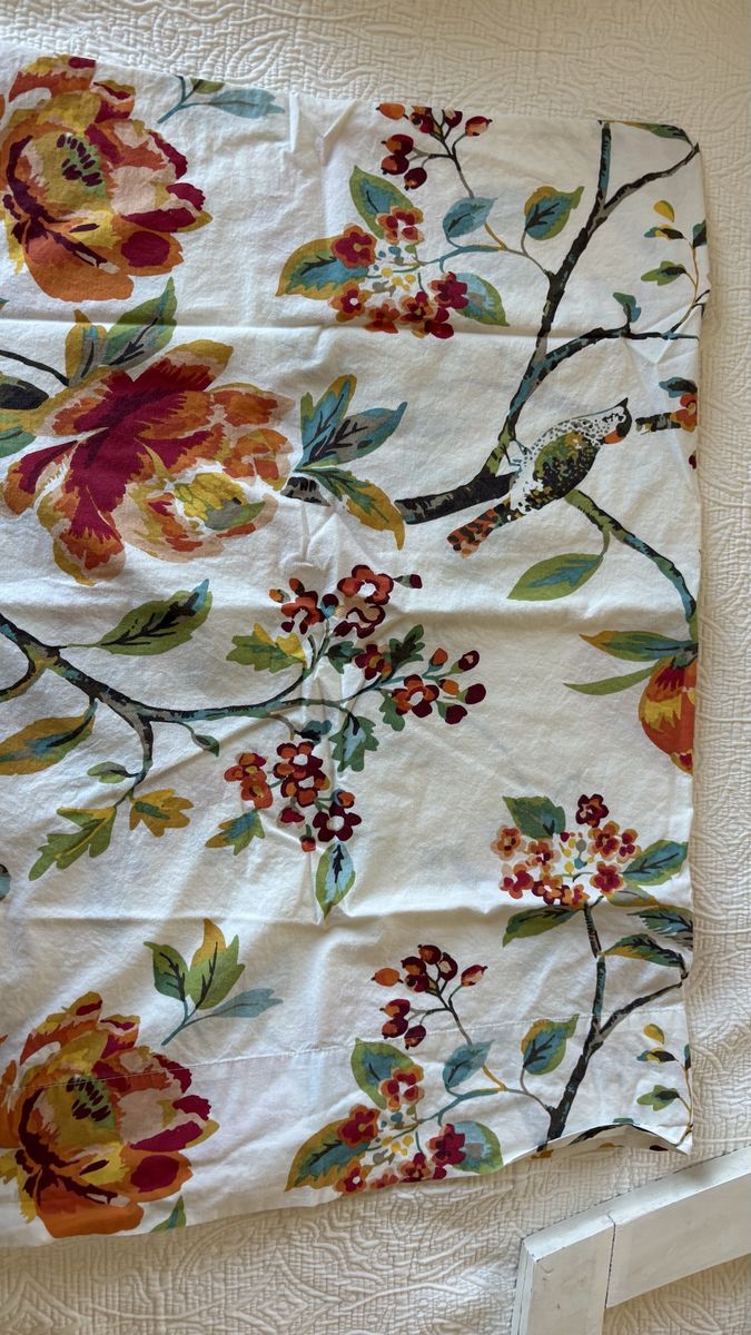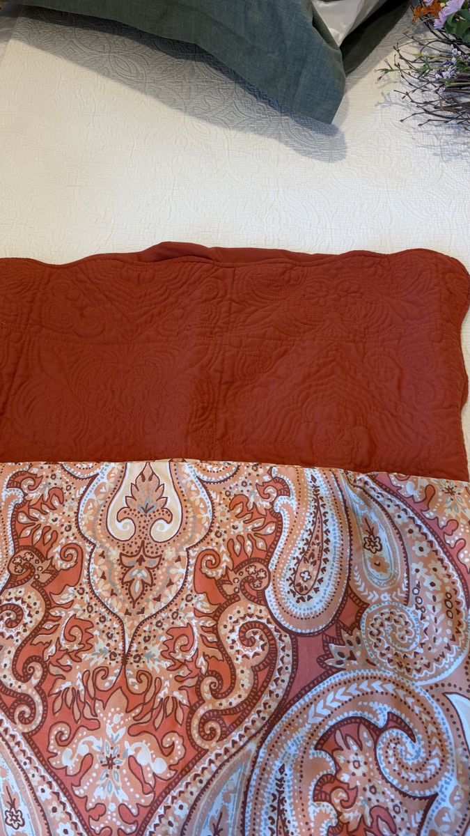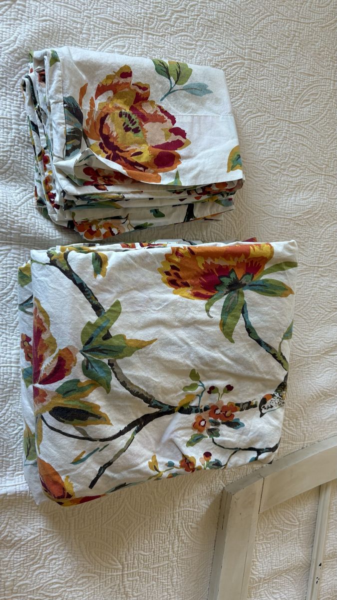 VenmoQueen size coverlet with two matching euro shams, and one additional euro sham that is similar in shade and style, which had been used with the bed set as you can see in the first picture. There are two sets of sheets that accompany this package one is an orange paisley which is a microfiber polyester blend. They have no piling. The other set is a Nina Campbell 100% cotton floral sheets with birds. The bottom elastic on the fitted sheet of both sets is an excellent condition. This bed set was used to staged a guest bedroom which received minimal use.