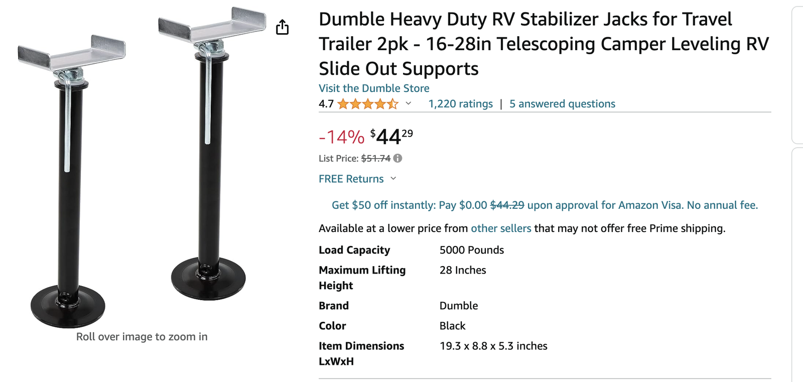 VenmoThese stabilizer jacks are meant to support your slide out, if it is out for any length of time. They are simple and work great. The specs are on the screen shot. These retail on Amazon for $45. I am selling these for $20. Call or text Dave at 801-540-0225. Text is best.